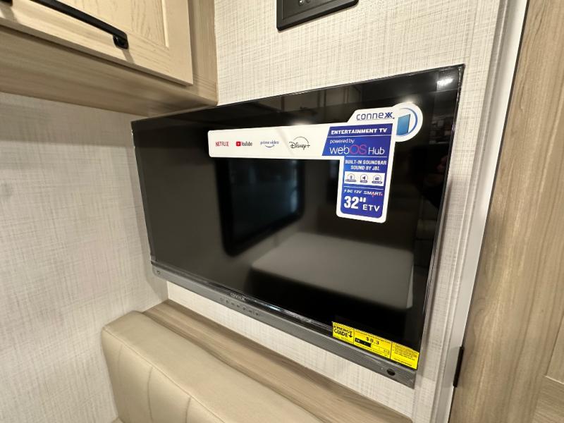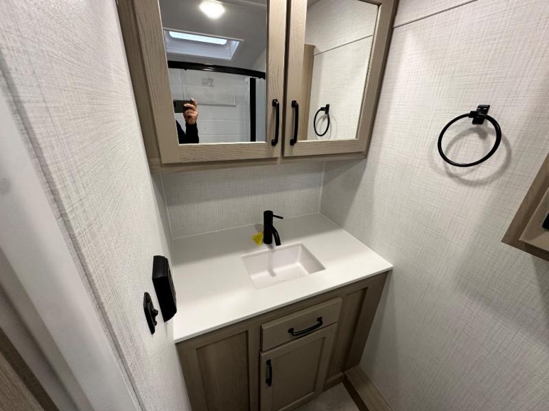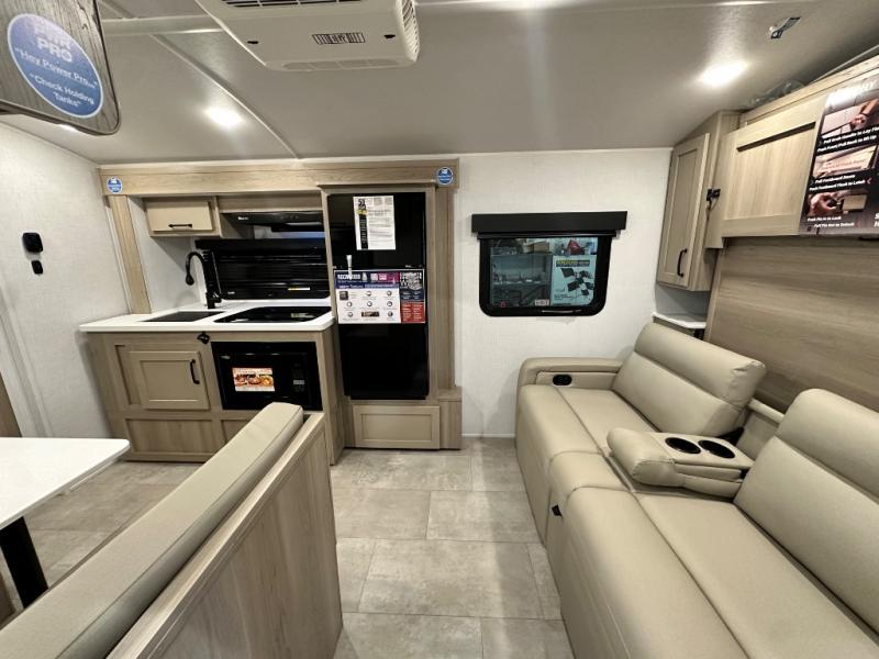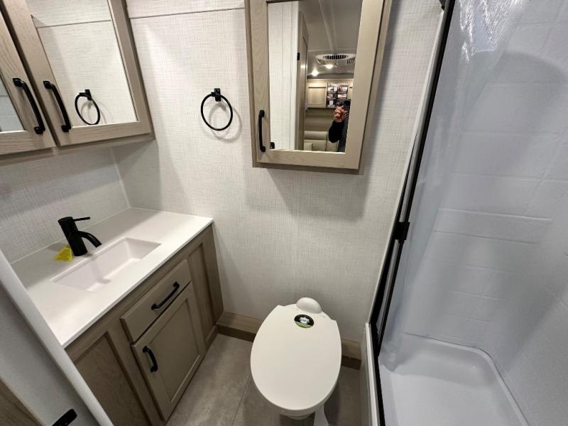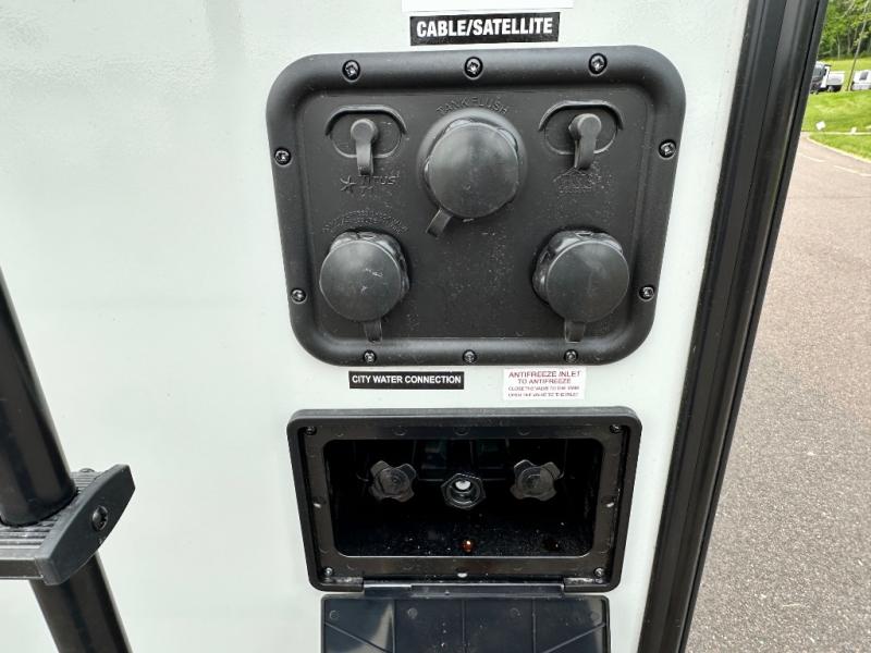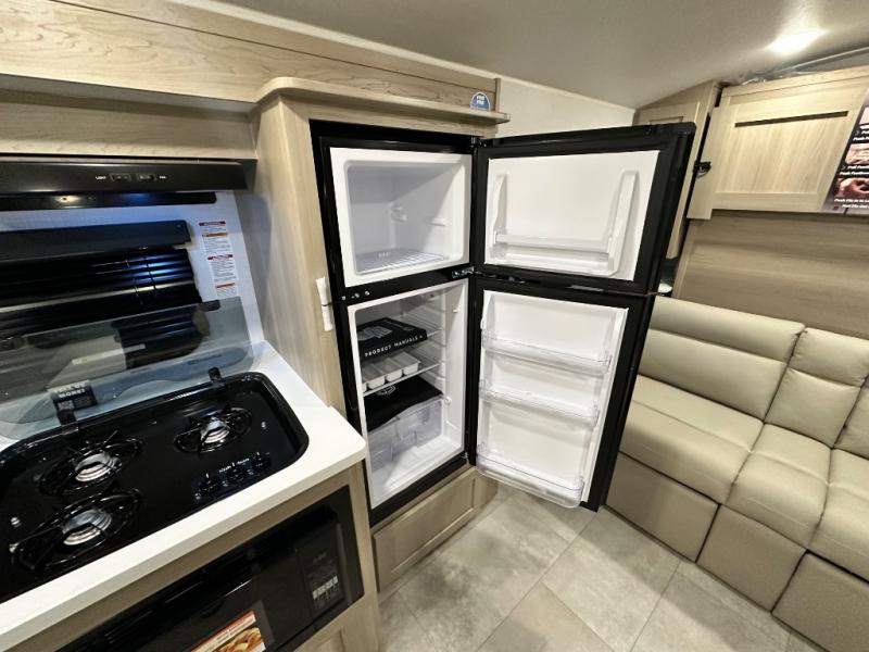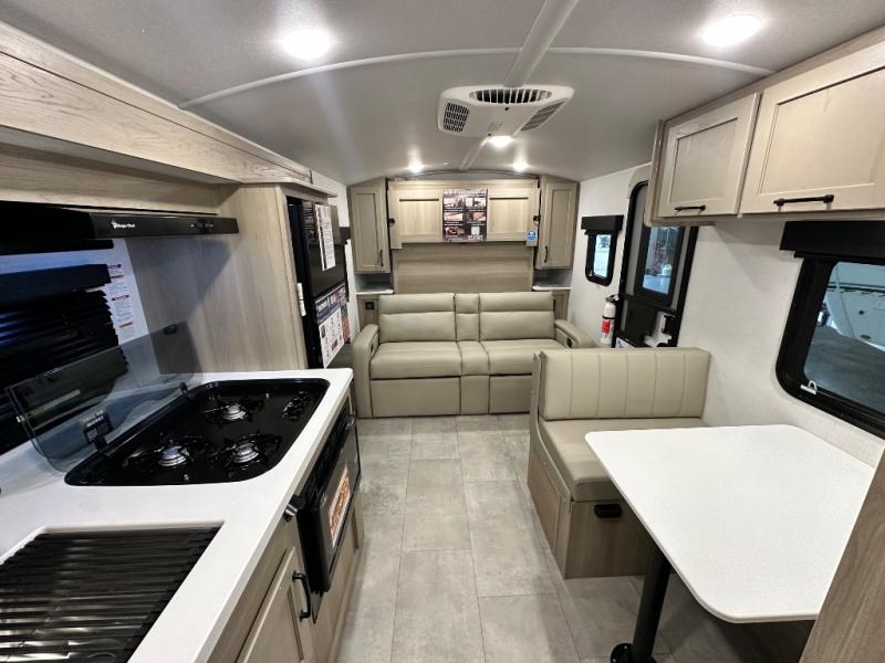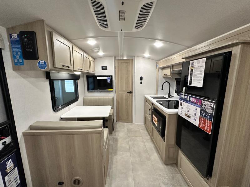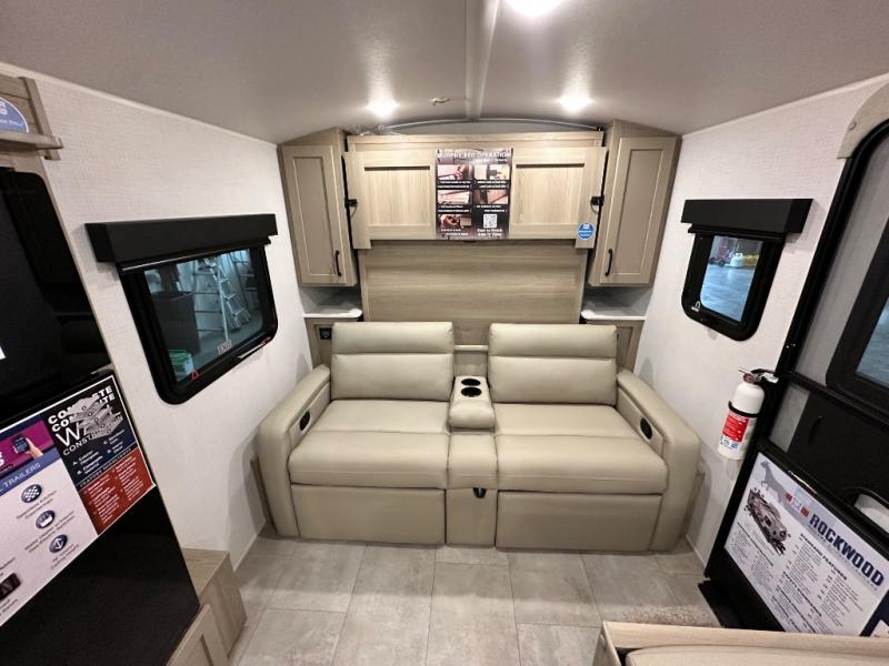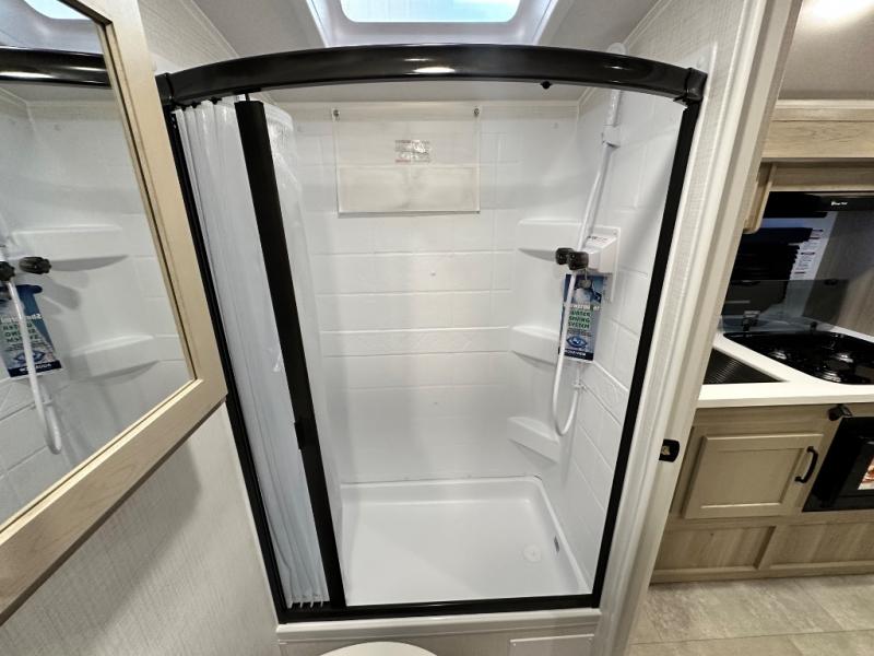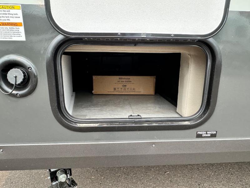 Comfortable sleeping space, convenient seating space, and a full rear bath makes this couple's trailer the one! You will love being able to relax on the sofa during the day, and sleep on the Murphy bed at night. There is a single slide out that will provide you more space to move around or cook meals, and the full bath includes a large shower so you won't feel cramped. If it's a rainy day you can watch movies on the 32" 12V TV, and if it's nice out, sit under the 14' power awning and cook lunch on the outside griddle. The possibilities are endless with this couple's trailer! The optional Power Package available on this model gives you the option to go off-grid for even longer amounts of time!
