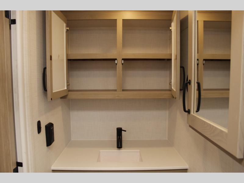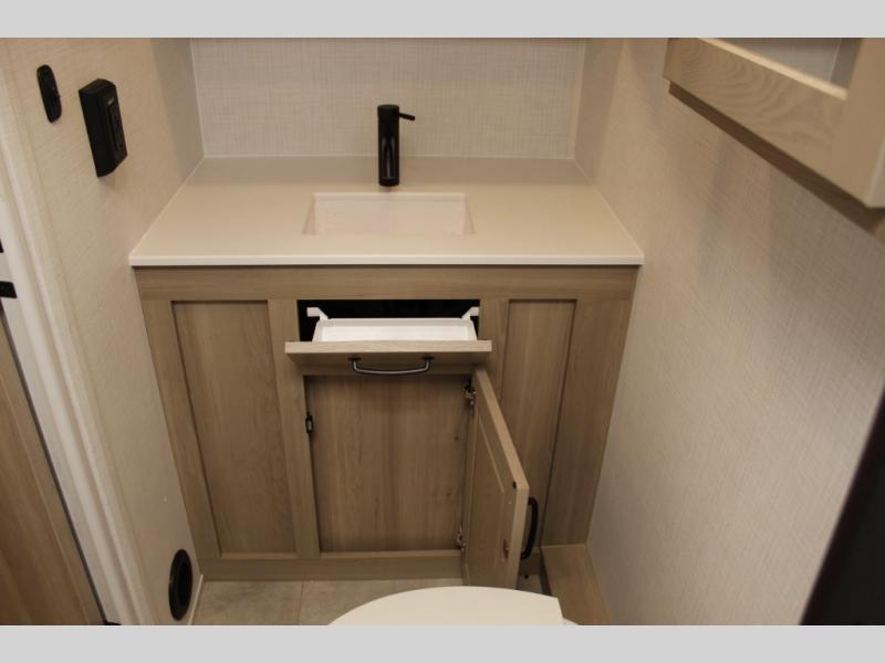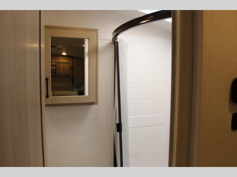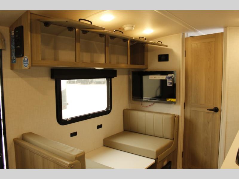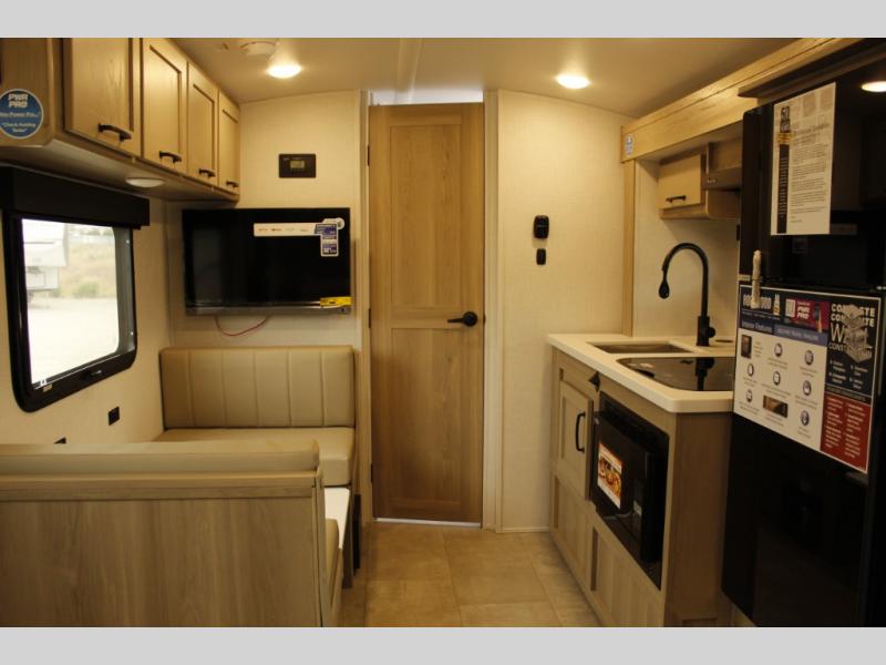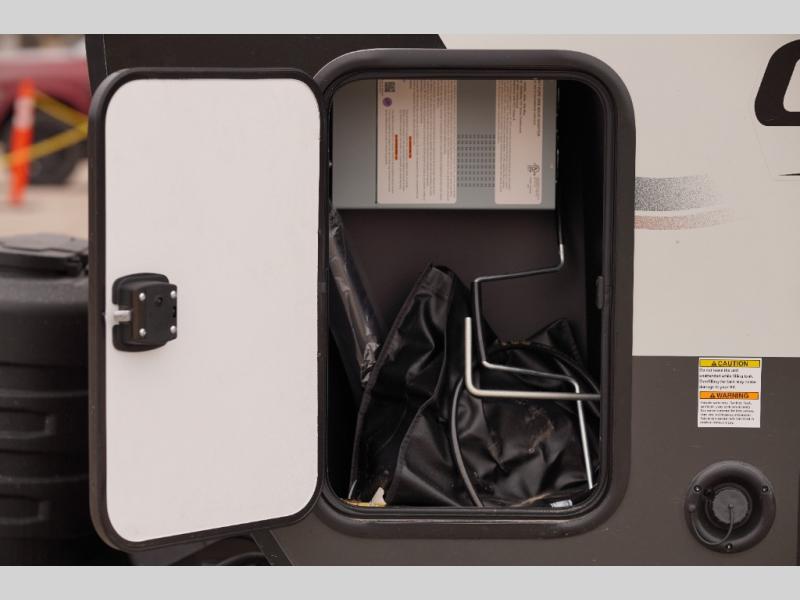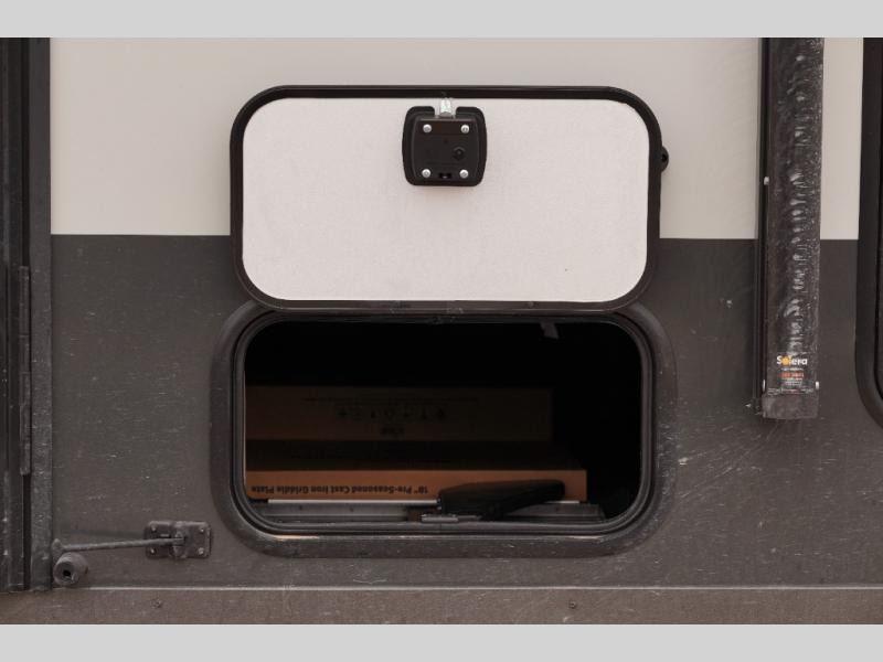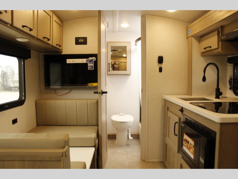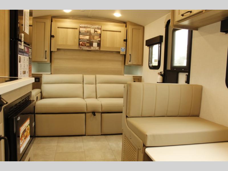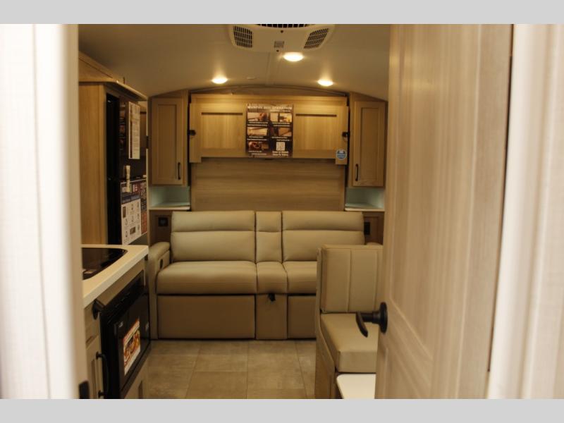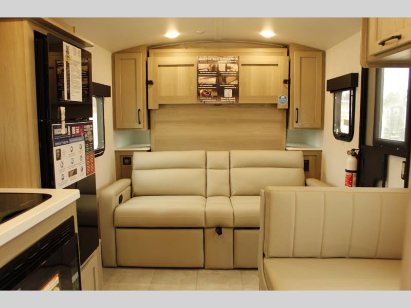 Comfortable sleeping space, convenient seating space, and a full rear bath makes this couple's trailer the one! You will love being able to relax on the sofa during the day, and sleep on the Murphy bed at night. There is a single slide out that will provide you more space to move around or cook meals, and the full bath includes a large shower so you won't feel cramped. If it's a rainy day you can watch movies on the 32" 12V TV, and if it's nice out, sit under the 14' power awning and cook lunch on the outside griddle. The possibilities are endless with this couple's trailer! The optional Power Package available on this model gives you the option to go off-grid for even longer amounts of time!