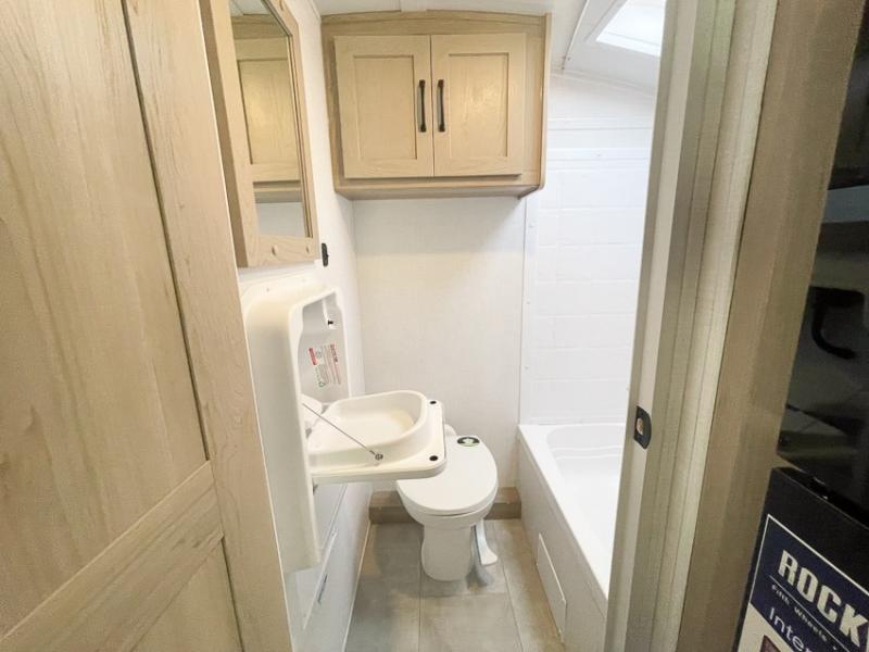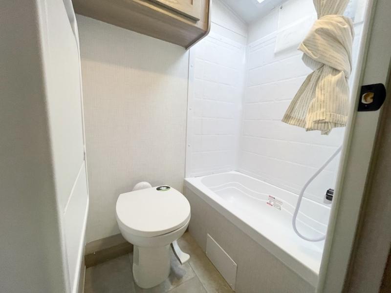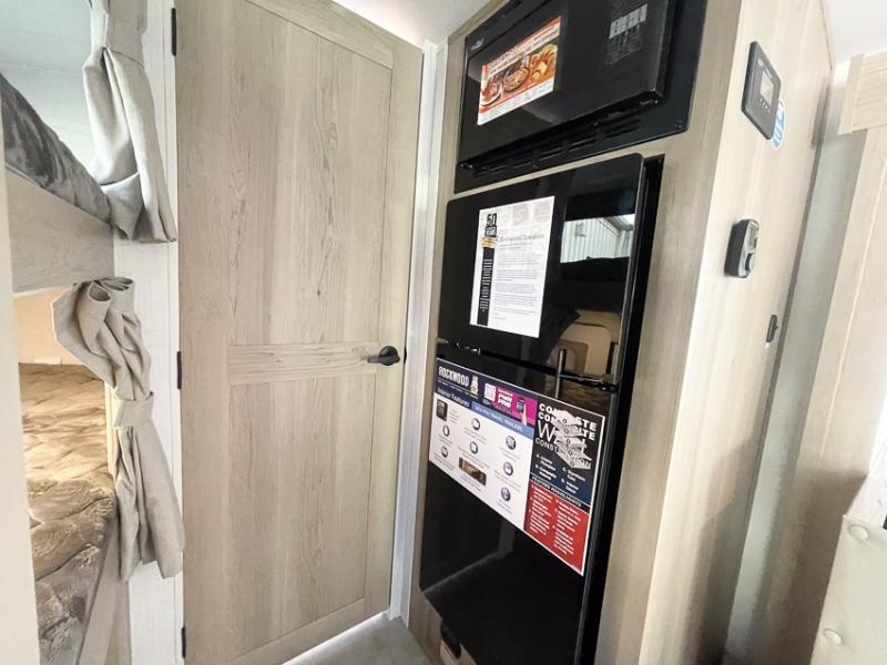 You're going to love camping with your family or friends in this spacious bunk model! The bunk beds will be perfect for little ones, while you take the front full-size bed. There is also a 44" booth dinette within the slide out for additional sleeping and seating space. The kitchen includes everything the chef will need to prepare meals each day, including a recessed cooktop, microwave oven, and a 12V refrigerator for perishables. If the weather is nice, you may just find the chef outdoors cooking on the outside griddle under the 14' power awning. And check out the exterior bike door that will be perfect for bikes, luggage, or extra camp gear. The optional Power Package available on this model includes three 200W solar panels, a 460 Ah Mastervolt MLI lithium-ion battery, two smart remotes, and more off-grid features!