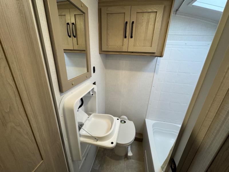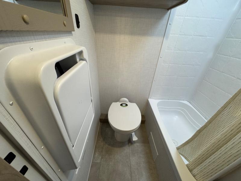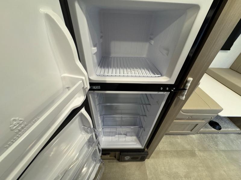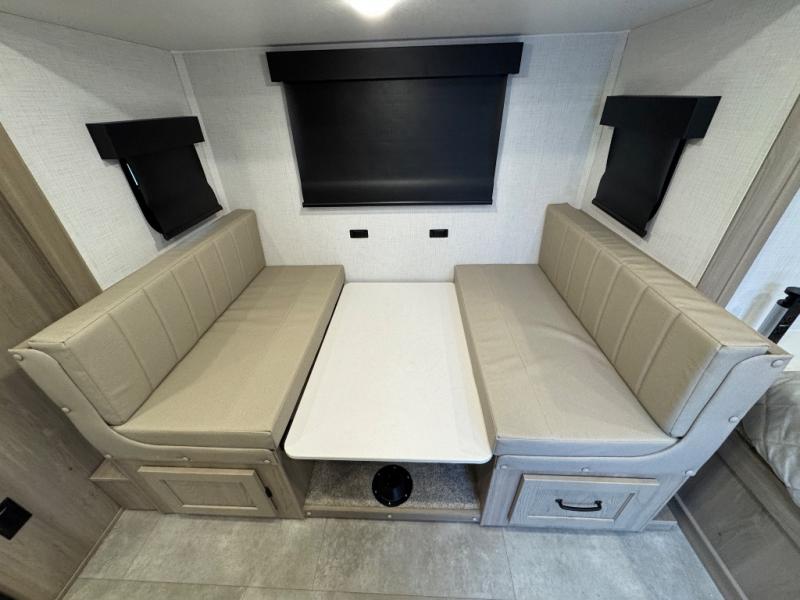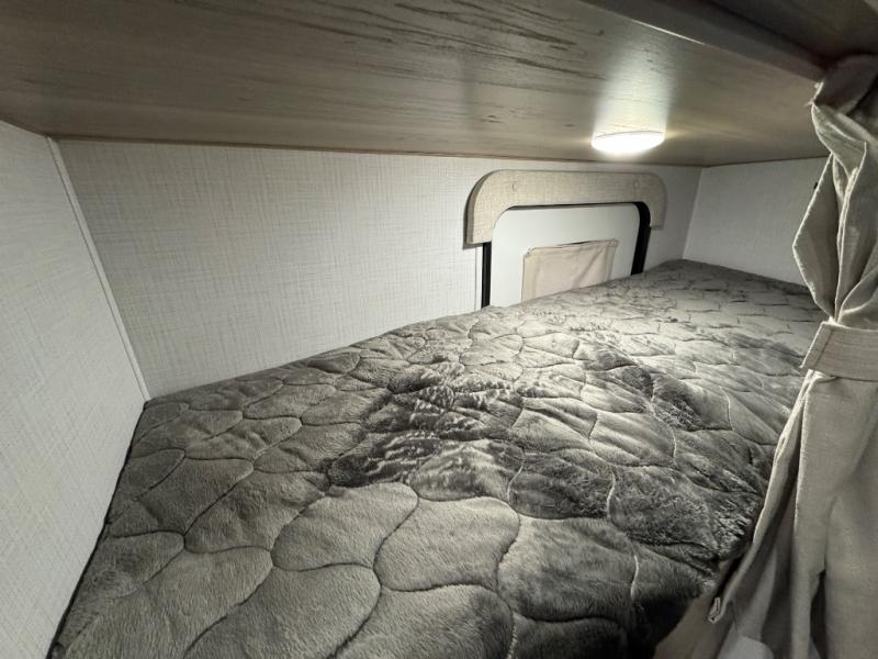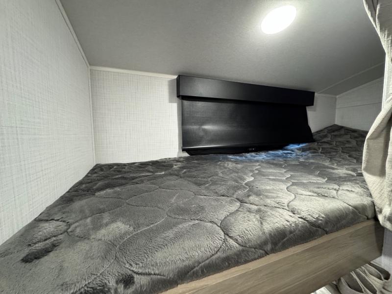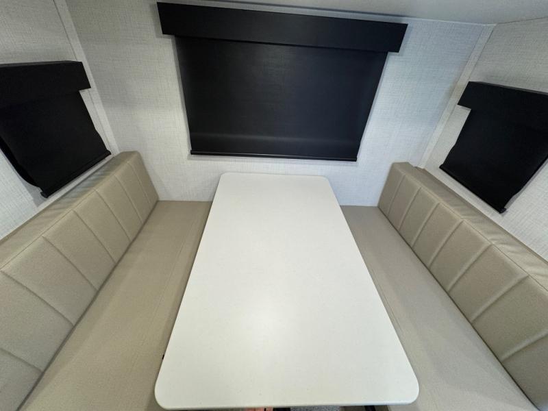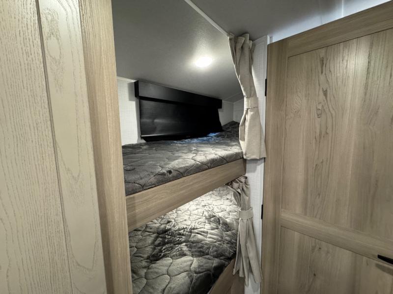 You're going to love camping with your family or friends in this spacious bunk model! The bunk beds will be perfect for little ones, while you take the front full-size bed. There is also a 44" booth dinette within the slide out for additional sleeping and seating space. The kitchen includes everything the chef will need to prepare meals each day, including a recessed cooktop, microwave oven, and a 12V refrigerator for perishables. If the weather is nice, you may just find the chef outdoors cooking on the outside griddle under the 14' power awning. And check out the exterior bike door that will be perfect for bikes, luggage, or extra camp gear. The optional Power Package available on this model includes three 200W solar panels, a 460 Ah Mastervolt MLI lithium-ion battery, two smart remotes, and more off-grid features!