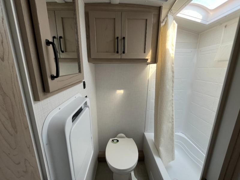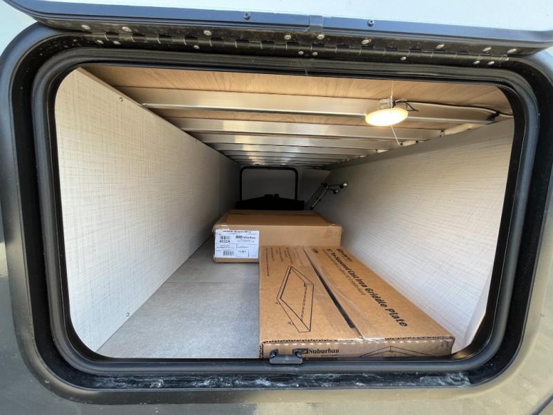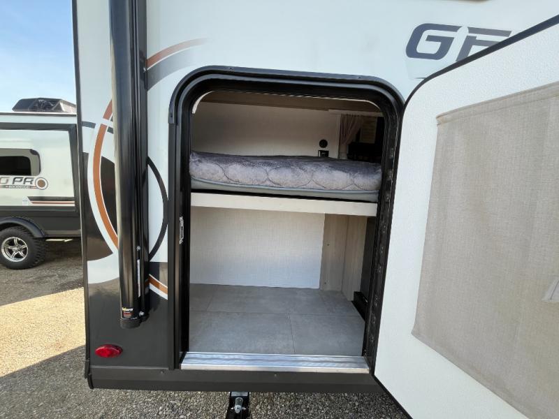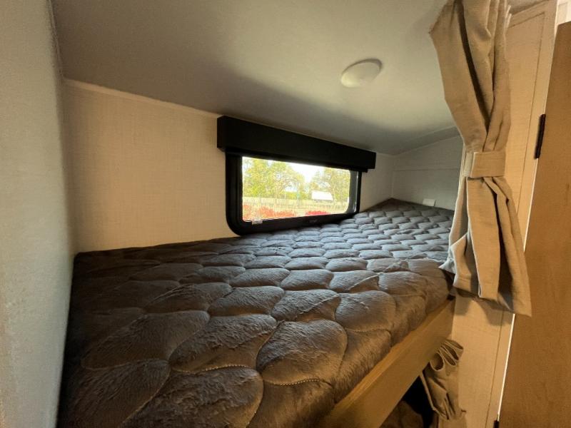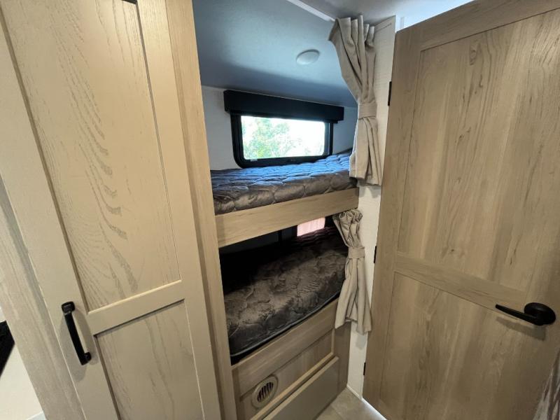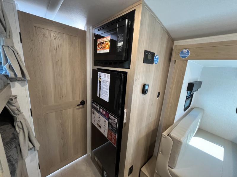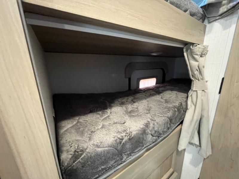You're going to love camping with your family or friends in this spacious bunk model! The bunk beds will be perfect for little ones, while you take the front full-size bed. There is also a 44" booth dinette within the slide out for additional sleeping and seating space. The kitchen includes everything the chef will need to prepare meals each day, including a recessed cooktop, microwave oven, and a 12V refrigerator for perishables. If the weather is nice, you may just find the chef outdoors cooking on the outside griddle under the 14' power awning. And check out the exterior bike door that will be perfect for bikes, luggage, or extra camp gear. The optional Power Package available on this model includes three 200W solar panels, a 460 Ah Mastervolt MLI lithium-ion battery, two smart remotes, and more off-grid features!