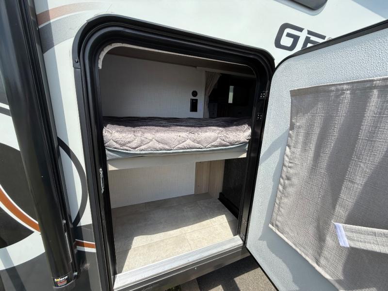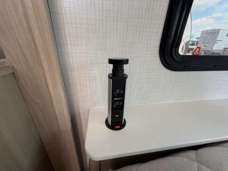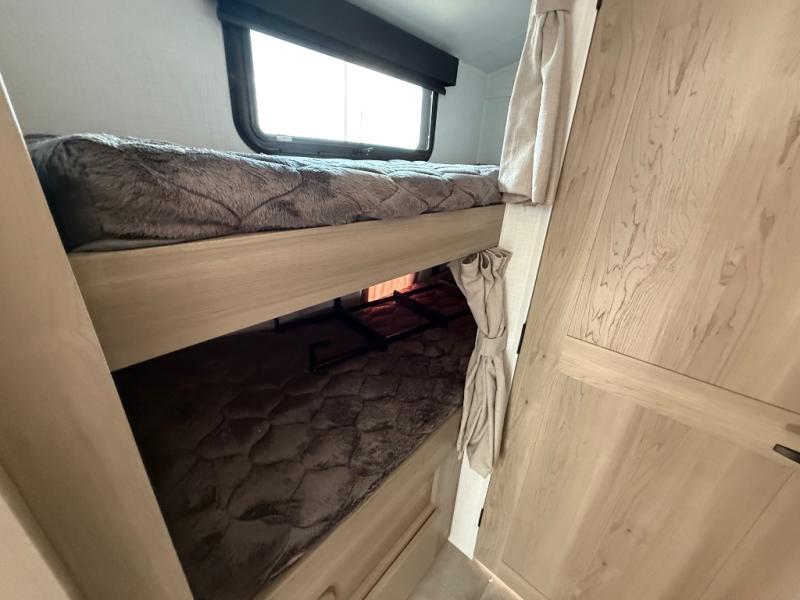 You're going to love camping with your family or friends in this spacious bunk model! The bunk beds will be perfect for little ones, while you take the front full-size bed. There is also a 44" booth dinette within the slide out for additional sleeping and seating space. The kitchen includes everything the chef will need to prepare meals each day, including a recessed cooktop, microwave oven, and a 12V refrigerator for perishables. If the weather is nice, you may just find the chef outdoors cooking on the outside griddle under the 14' power awning. And check out the exterior bike door that will be perfect for bikes, luggage, or extra camp gear. The optional Power Package available on this model includes three 200W solar panels, a 460 Ah Mastervolt MLI lithium-ion battery, two smart remotes, and more off-grid features!