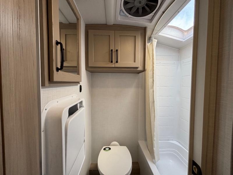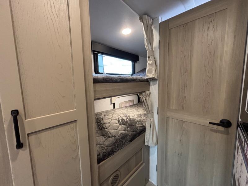 You're going to love camping with your family or friends in this spacious bunk model! The bunk beds will be perfect for little ones, while you take the front full-size bed. There is also a 44" booth dinette within the slide out for additional sleeping and seating space. The kitchen includes everything the chef will need to prepare meals each day, including a recessed cooktop, microwave oven, and a 12V refrigerator for perishables. If the weather is nice, you may just find the chef outdoors cooking on the outside griddle under the 14' power awning. And check out the exterior bike door that will be perfect for bikes, luggage, or extra camp gear. The optional Power Package available on this model includes three 200W solar panels, a 460 Ah Mastervolt MLI lithium-ion battery, two smart remotes, and more off-grid features!