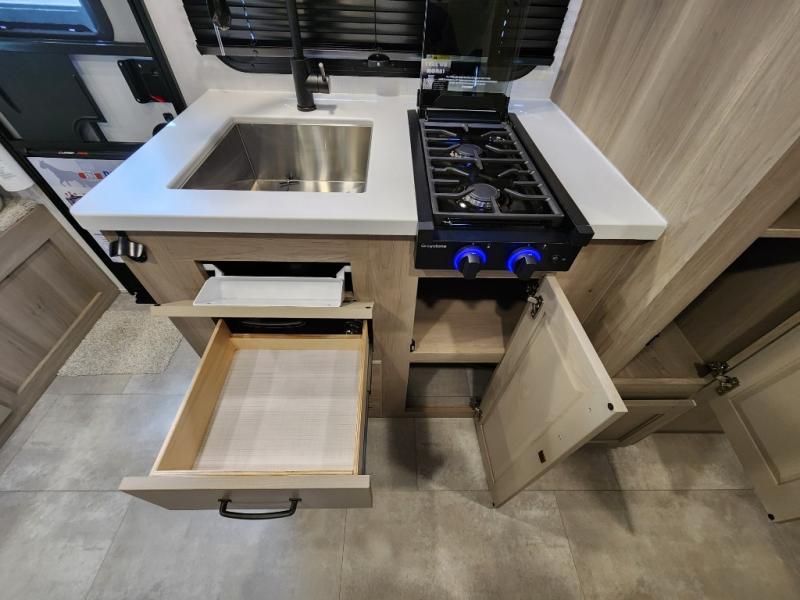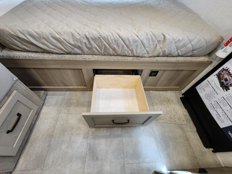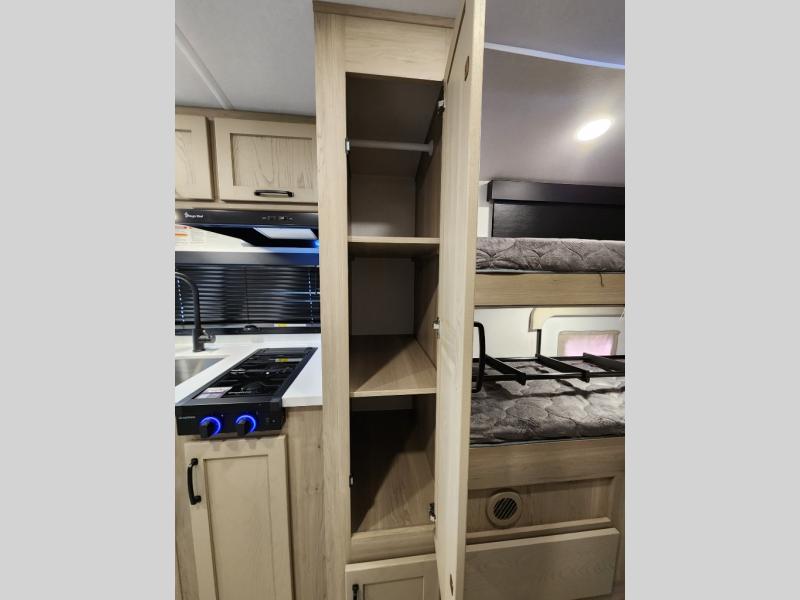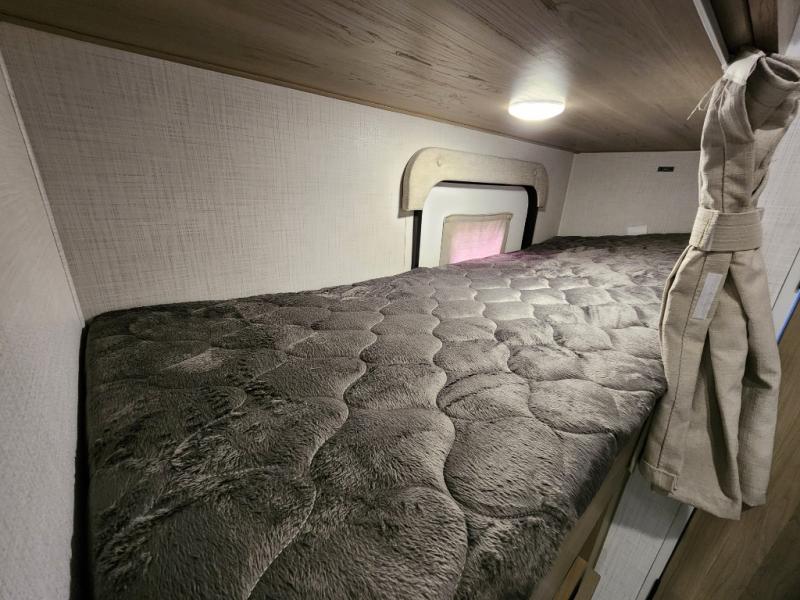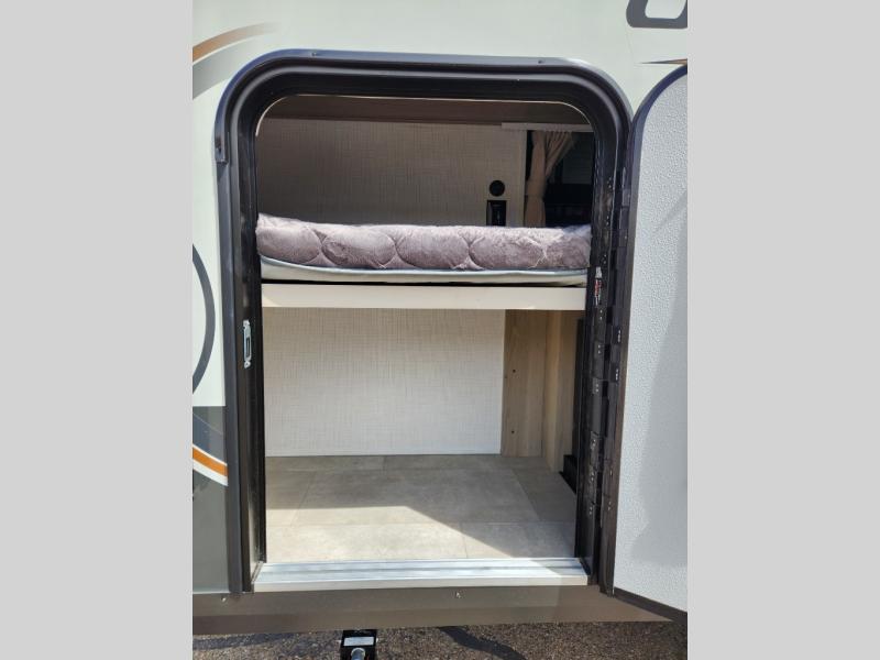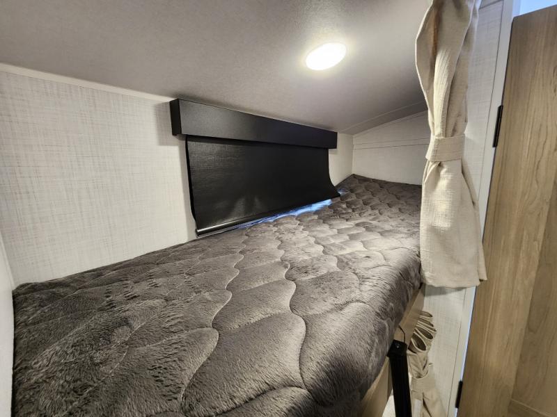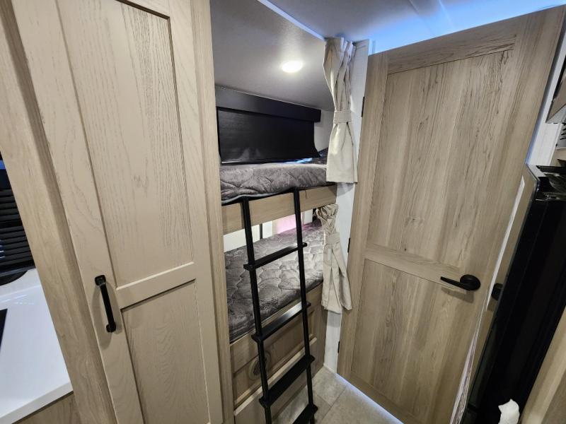 You're going to love camping with your family or friends in this spacious bunk model! The bunk beds will be perfect for little ones, while you take the front full-size bed. There is also a 44" booth dinette within the slide out for additional sleeping and seating space. The kitchen includes everything the chef will need to prepare meals each day, including a recessed cooktop, microwave oven, and a 12V refrigerator for perishables. If the weather is nice, you may just find the chef outdoors cooking on the outside griddle under the 14' power awning. And check out the exterior bike door that will be perfect for bikes, luggage, or extra camp gear. The optional Power Package available on this model includes three 200W solar panels, a 460 Ah Mastervolt MLI lithium-ion battery, two smart remotes, and more off-grid features!