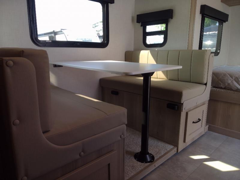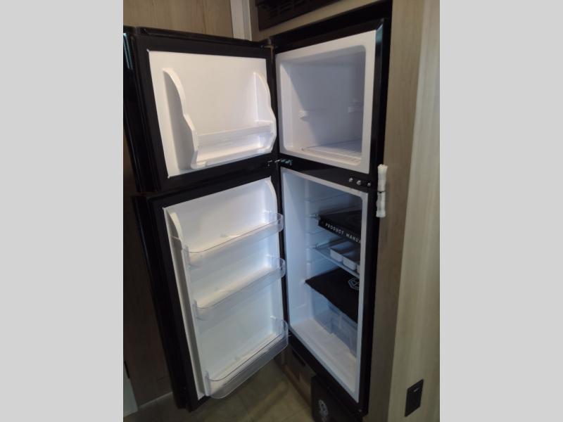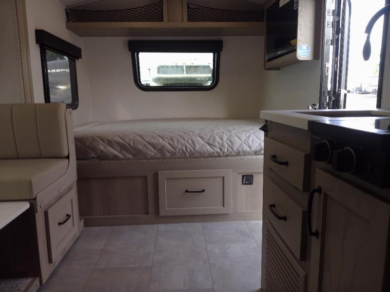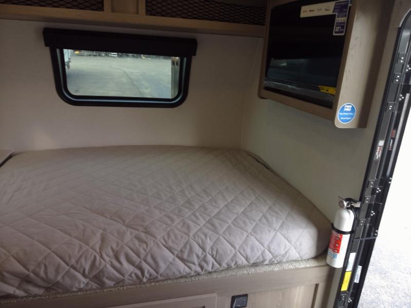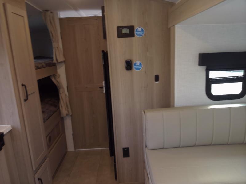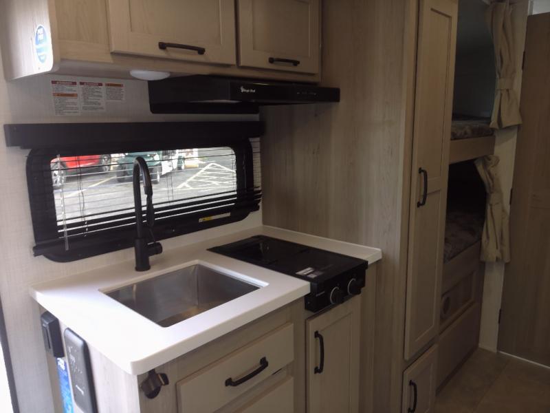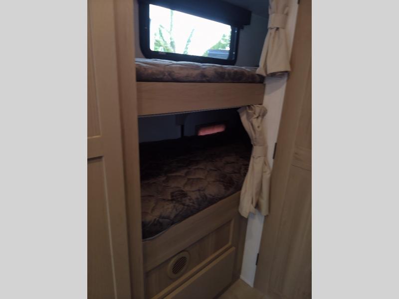 You're going to love camping with your family or friends in this spacious bunk model! The bunk beds will be perfect for little ones, while you take the front full-size bed. There is also a 44" booth dinette within the slide out for additional sleeping and seating space. The kitchen includes everything the chef will need to prepare meals each day, including a recessed cooktop, microwave oven, and a 12V refrigerator for perishables. If the weather is nice, you may just find the chef outdoors cooking on the outside griddle under the 14' power awning. And check out the exterior bike door that will be perfect for bikes, luggage, or extra camp gear. The optional Power Package available on this model includes three 200W solar panels, a 460 Ah Mastervolt MLI lithium-ion battery, two smart remotes, and more off-grid features!