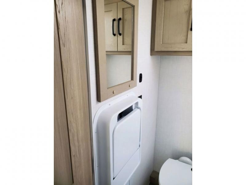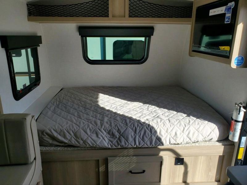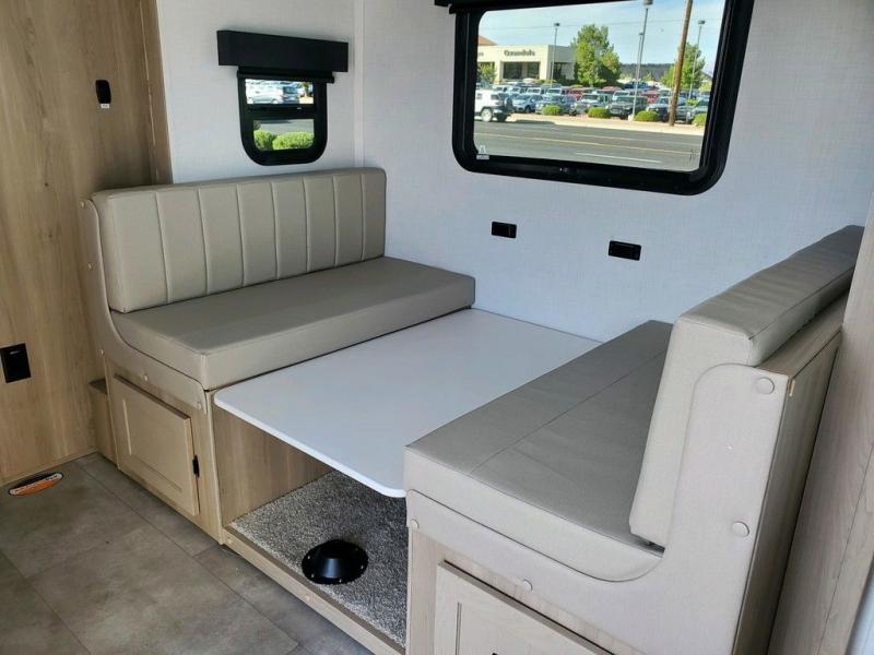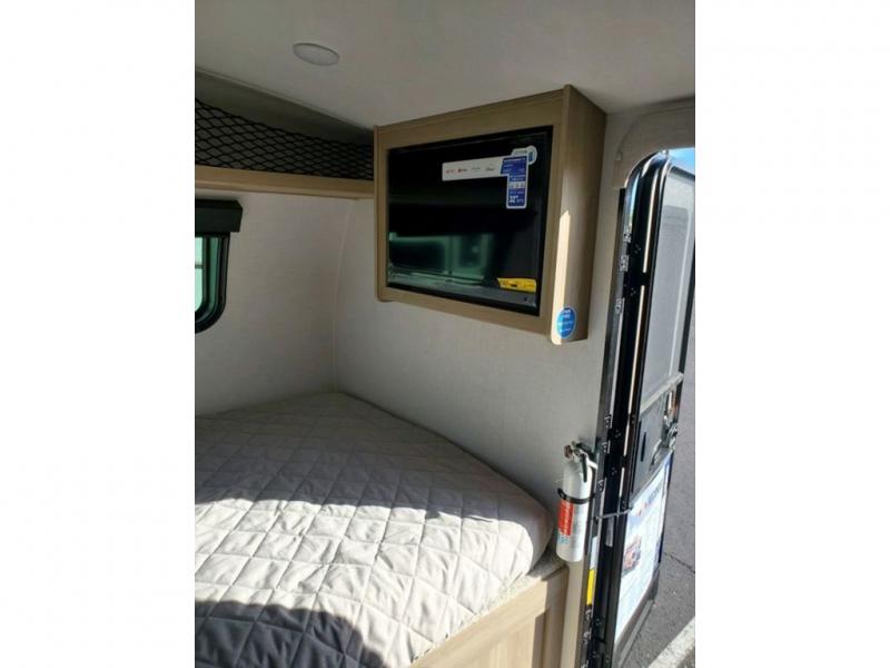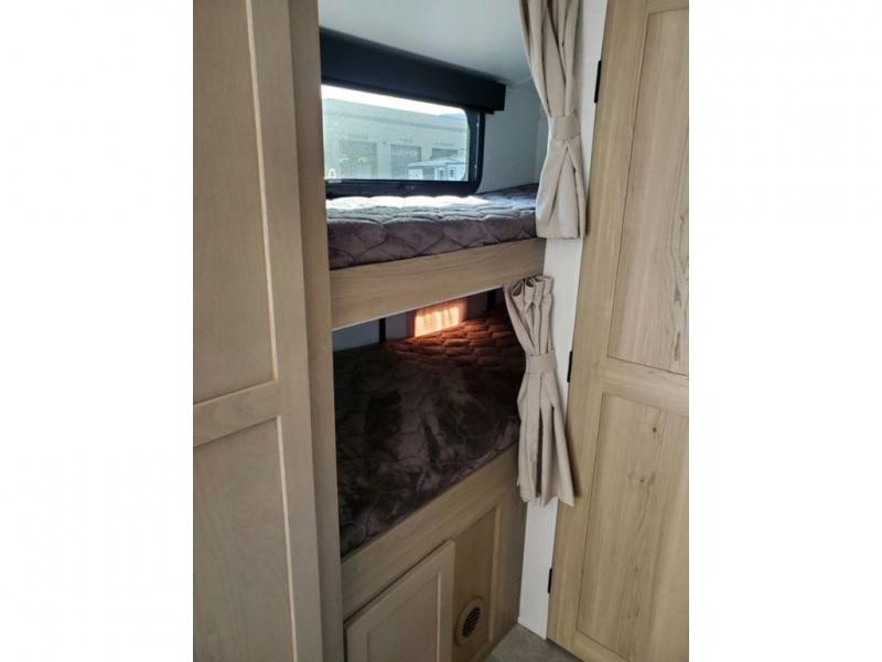 You're going to love camping with your family or friends in this spacious bunk model! The bunk beds will be perfect for little ones, while you take the front full-size bed. There is also a 44" booth dinette within the slide out for additional sleeping and seating space. The kitchen includes everything the chef will need to prepare meals each day, including a recessed cooktop, microwave oven, and a 12V refrigerator for perishables. If the weather is nice, you may just find the chef outdoors cooking on the outside griddle under the 14' power awning. And check out the exterior bike door that will be perfect for bikes, luggage, or extra camp gear. The optional Power Package available on this model includes three 200W solar panels, a 460 Ah Mastervolt MLI lithium-ion battery, two smart remotes, and more off-grid features!