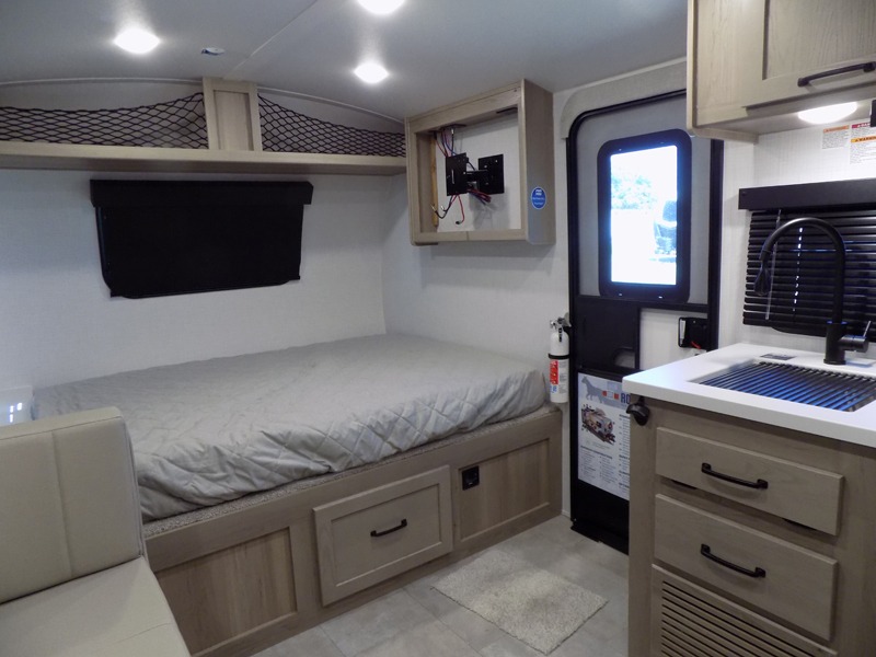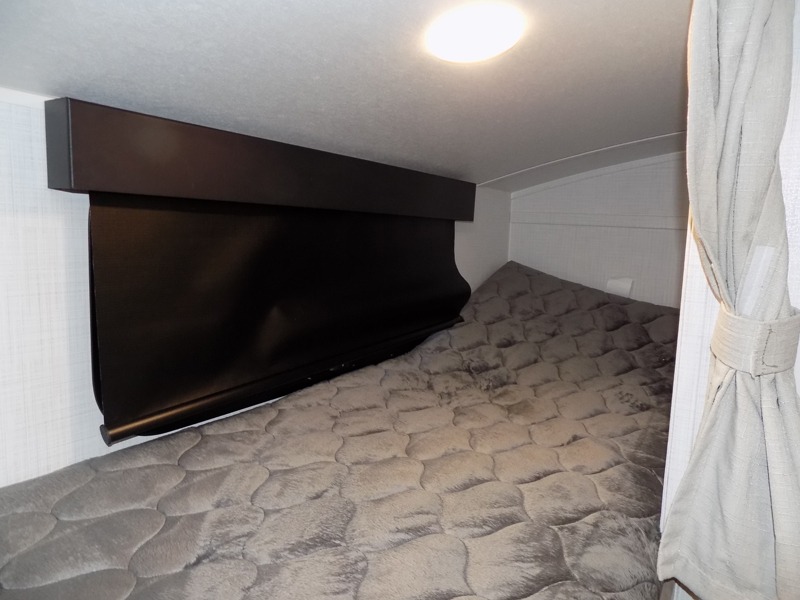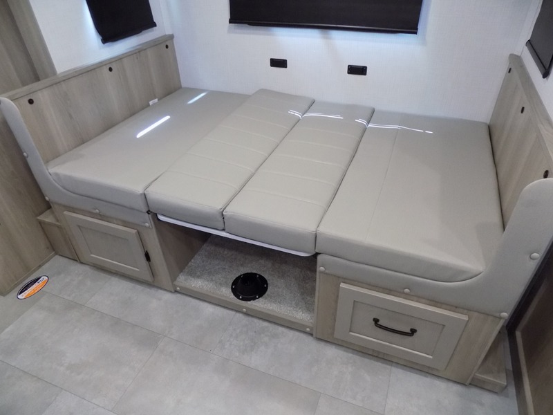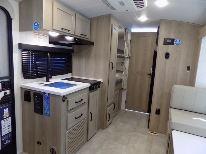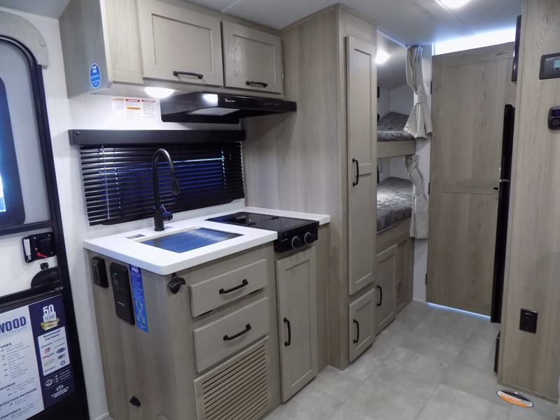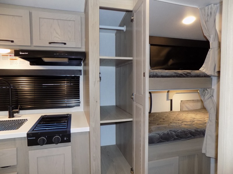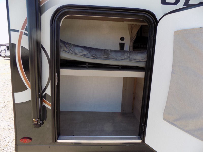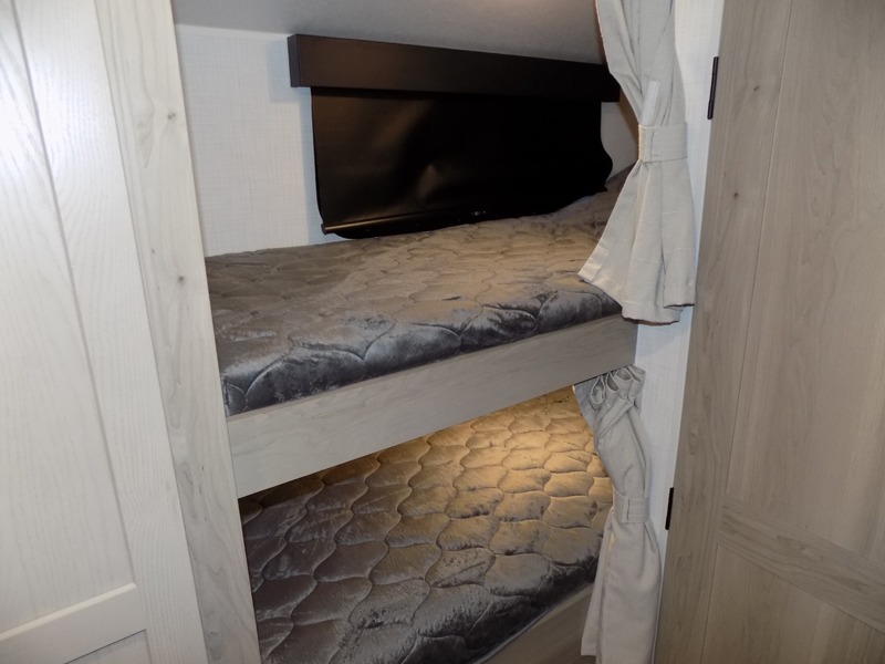 You're going to love camping with your family or friends in this spacious bunk model! The bunk beds will be perfect for little ones, while you take the front full-size bed. There is also a 44" booth dinette within the slide out for additional sleeping and seating space. The kitchen includes everything the chef will need to prepare meals each day, including a recessed cooktop, microwave oven, and a 12V refrigerator for perishables. If the weather is nice, you may just find the chef outdoors cooking on the outside griddle under the 14' power awning. And check out the exterior bike door that will be perfect for bikes, luggage, or extra camp gear. The optional Power Package available on this model includes three 200W solar panels, a 460 Ah Mastervolt MLI lithium-ion battery, two smart remotes, and more off-grid features!