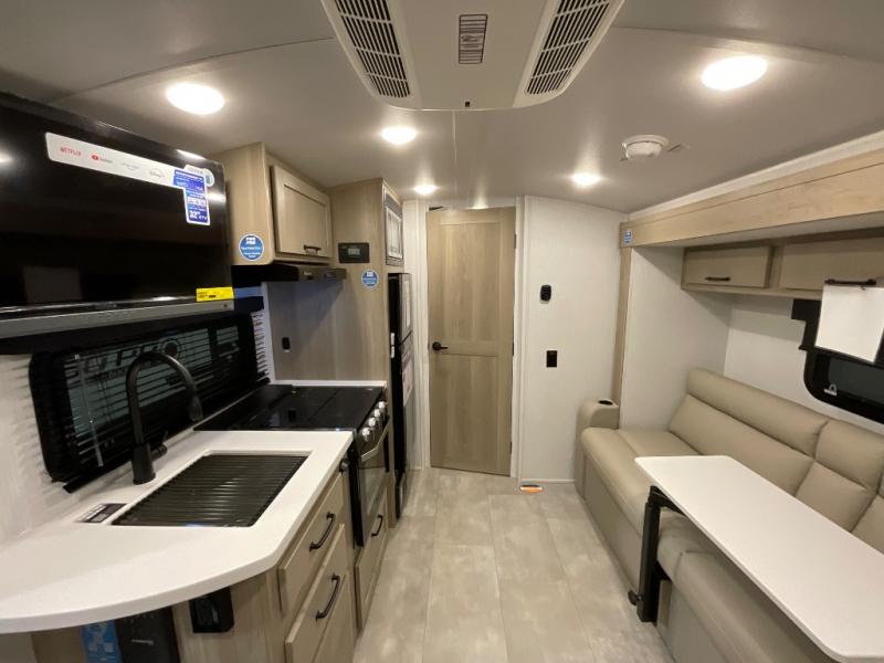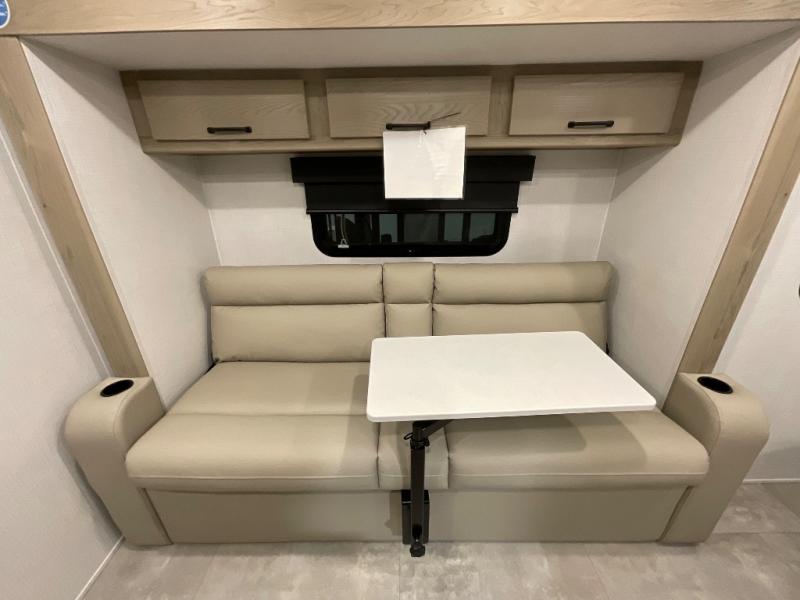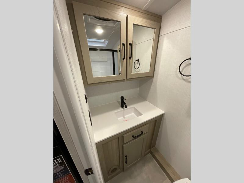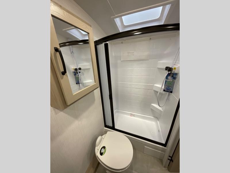 This travel trailer will feel more like home with its front bedroom and walk-around full-size bed. You'll enjoy the 32" 12V TV as you relax on the 72" sofa with a table and cupholders. The full rear bath includes a spacious shower to clean up in each day and there is a linen closet for clean towels. When you're ready to prepare dinner you'll have a three burner cooktop and microwave oven indoors, and a griddle outdoors! And don't forget the exterior storage allows you to bring along beach toys and tackle boxes. The optional Power Package available on this model includes three 200W solar panels, a side solar plug-in, a 3kW 160A inverter, and more off-grid features!