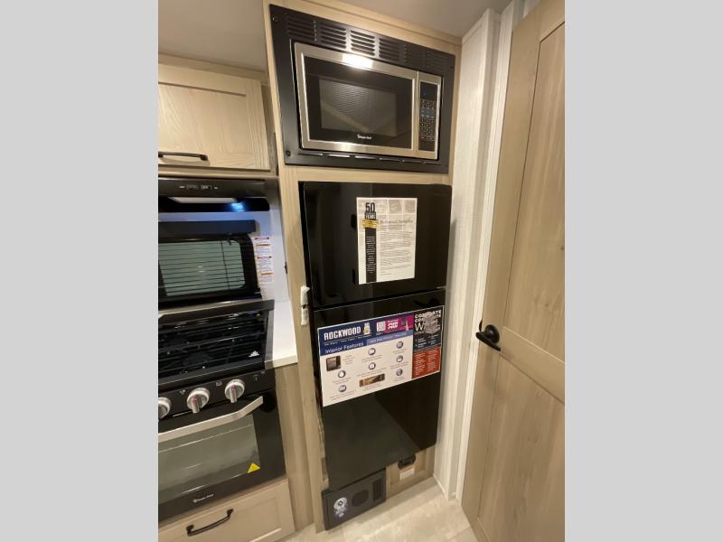 With any Rockwood GEO Pro travel trailer by Forest River you will enjoy easy towing, durable construction, and off-road capabilities with larger 15" tires and a lift kit! Each model is constructed with complete composite wall construction for added strength and durability, and the torsion axle, Rubber-Ryde suspension will make towing easier than ever. Inside, you'll find sleek roller shades for added privacy, a 12V refrigerator and a microwave, plus a 20,000 BTU furnace to keep you warm during the colder camping months.