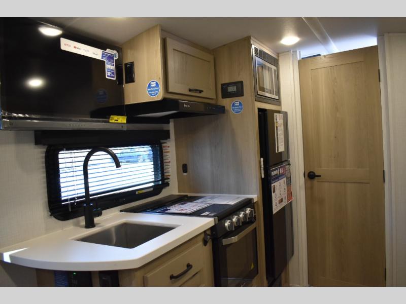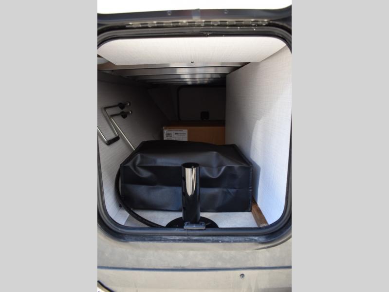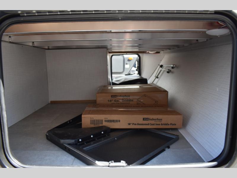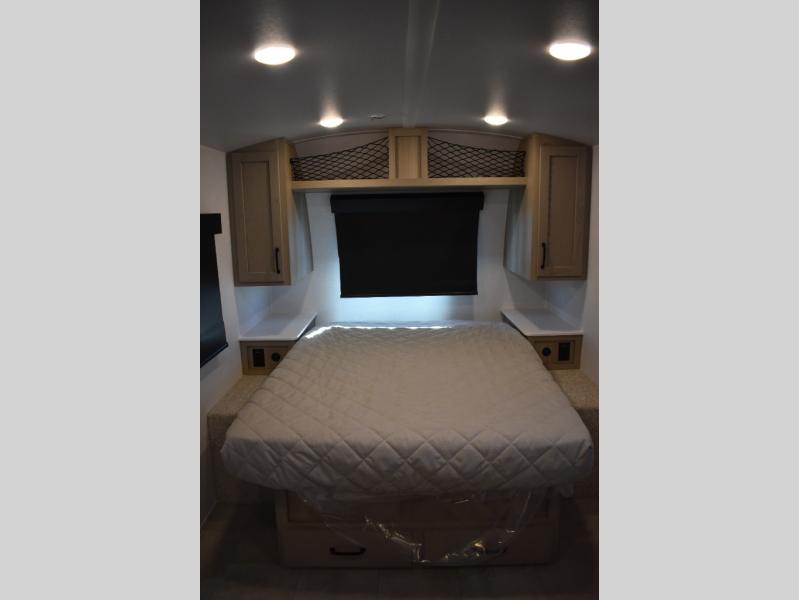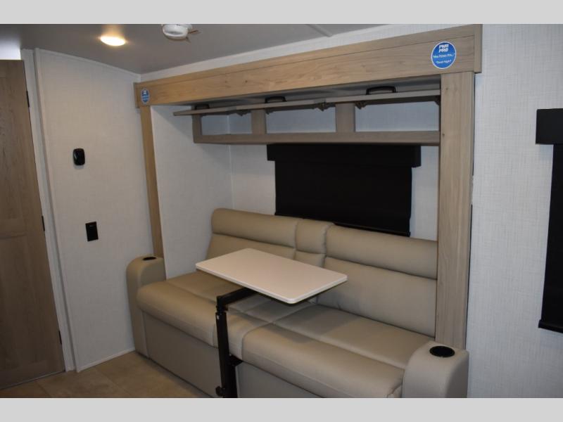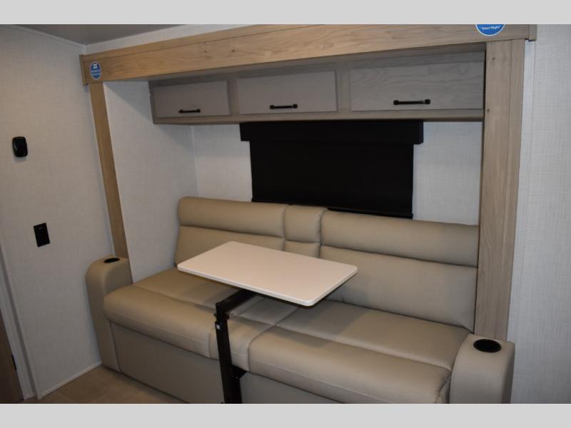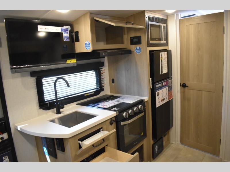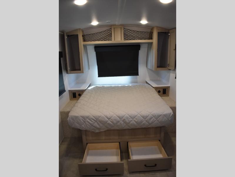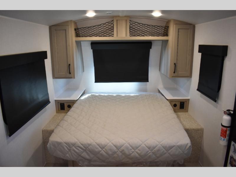 This travel trailer will feel more like home with its front bedroom and walk-around full-size bed. You'll enjoy the 32" 12V TV as you relax on the 72" sofa with a table and cupholders. The full rear bath includes a spacious shower to clean up in each day and there is a linen closet for clean towels. When you're ready to prepare dinner you'll have a three burner cooktop and microwave oven indoors, and a griddle outdoors! And don't forget the exterior storage allows you to bring along beach toys and tackle boxes. The optional Power Package available on this model includes three 200W solar panels, a side solar plug-in, a 3kW 160A inverter, and more off-grid features!