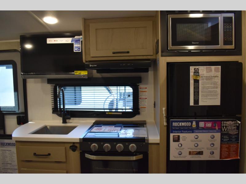 With any Rockwood GEO Pro travel trailer by Forest River you will enjoy easy towing, durable construction, and off-road capabilities with larger 15" tires and a lift kit! Each model is constructed with complete composite wall construction for added strength and durability, and the torsion axle, Rubber-Ryde suspension will make towing easier than ever. Inside, you'll find sleek roller shades for added privacy, a 12V refrigerator and a microwave, plus a 20,000 BTU furnace to keep you warm during the colder camping months.