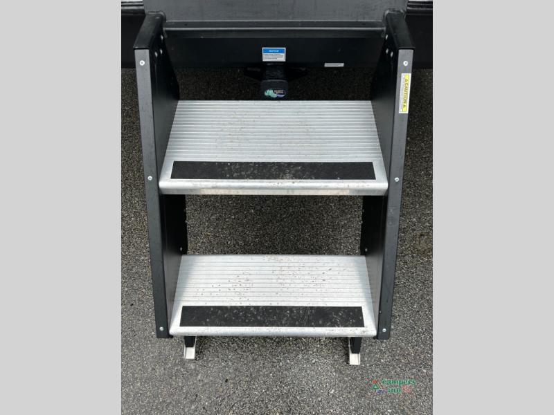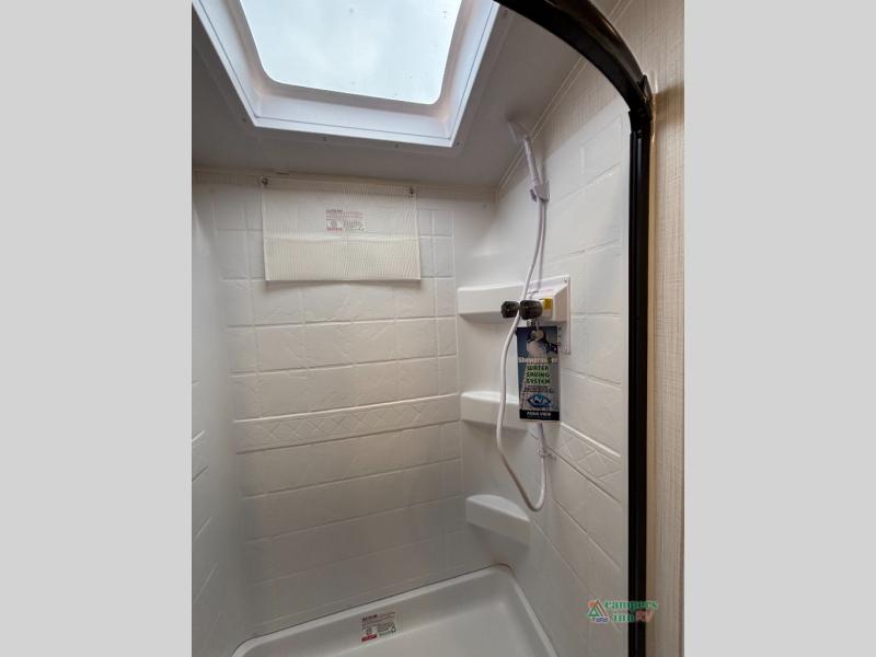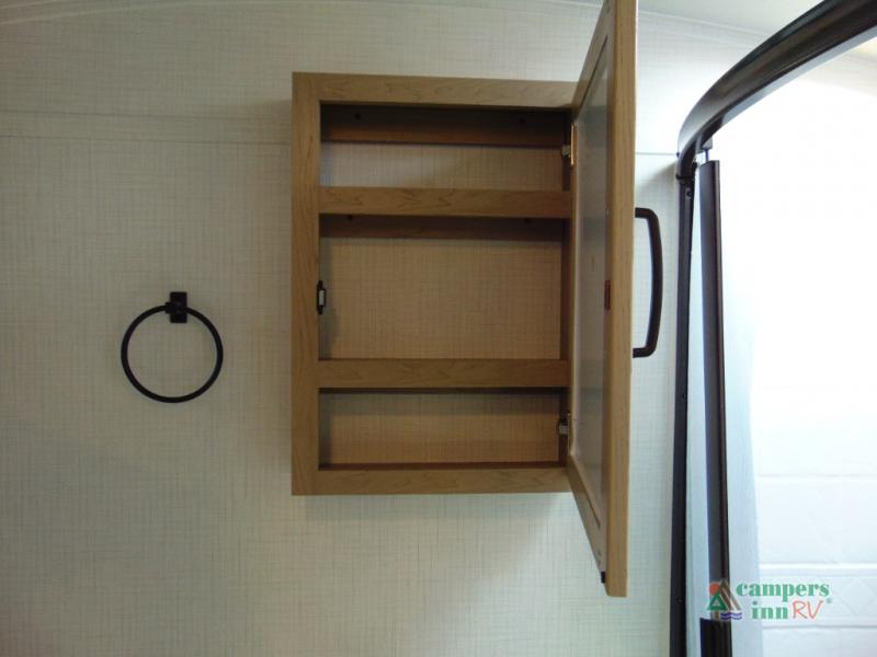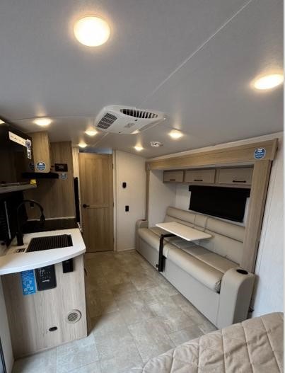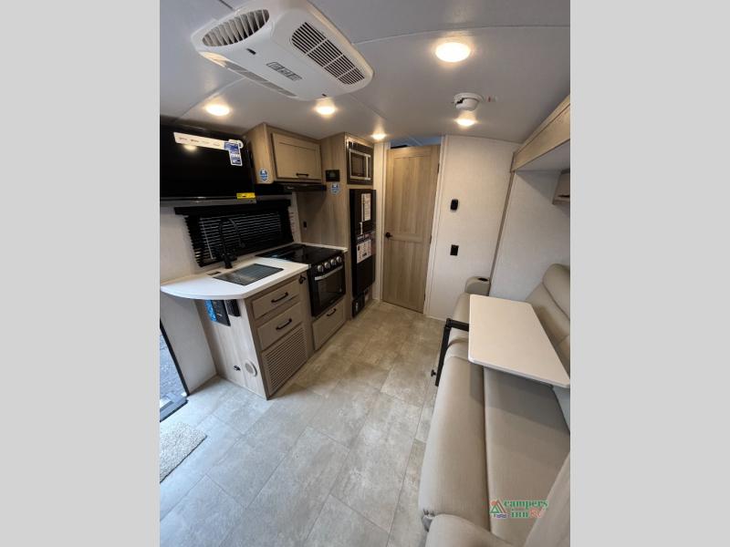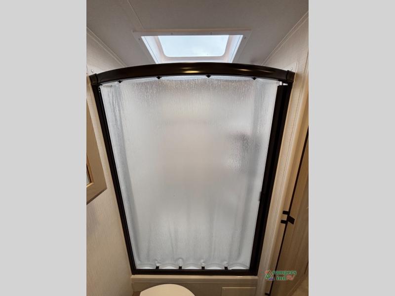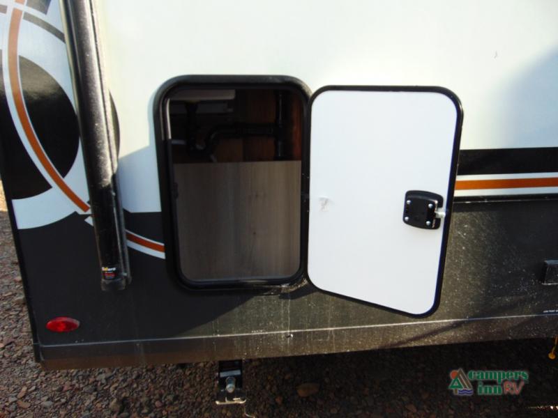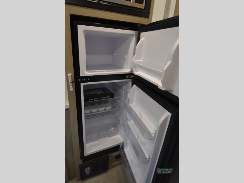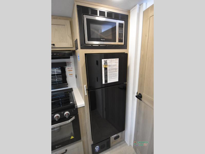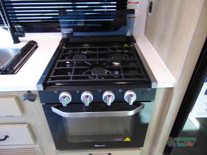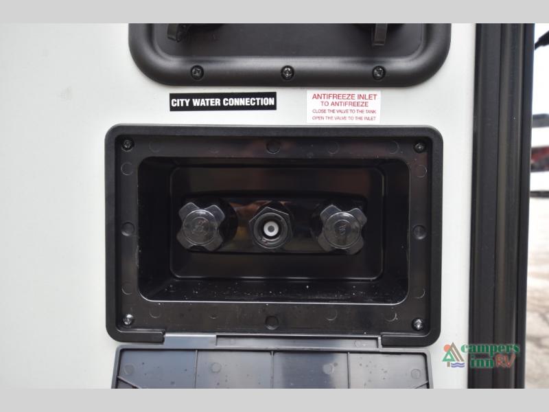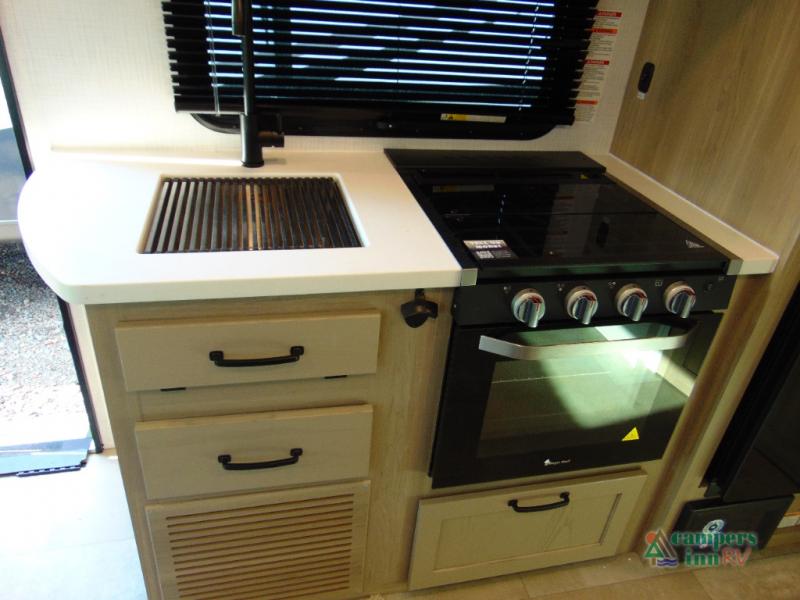 This travel trailer will feel more like home with its front bedroom and walk-around full-size bed. You'll enjoy the 32" 12V TV as you relax on the 72" sofa with a table and cupholders. The full rear bath includes a spacious shower to clean up in each day and there is a linen closet for clean towels. When you're ready to prepare dinner you'll have a three burner cooktop and microwave oven indoors, and a griddle outdoors! And don't forget the exterior storage allows you to bring along beach toys and tackle boxes. The optional Power Package available on this model includes three 200W solar panels, a side solar plug-in, a 3kW 160A inverter, and more off-grid features!