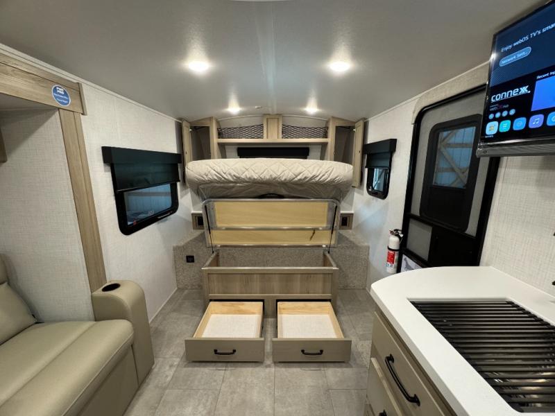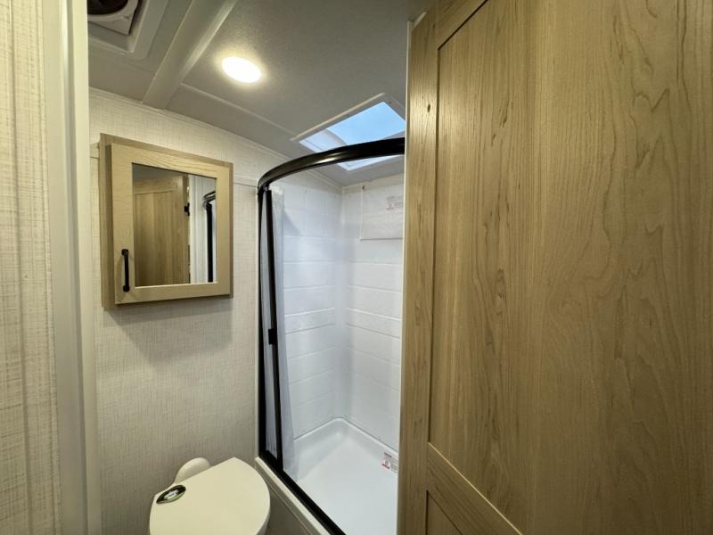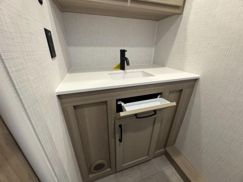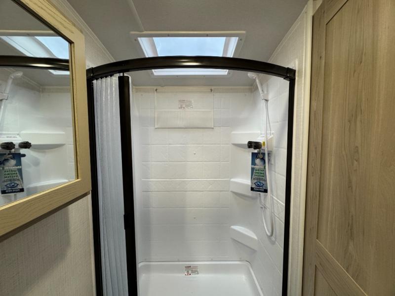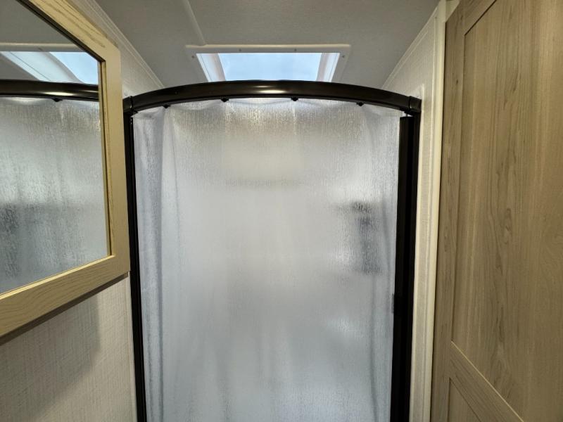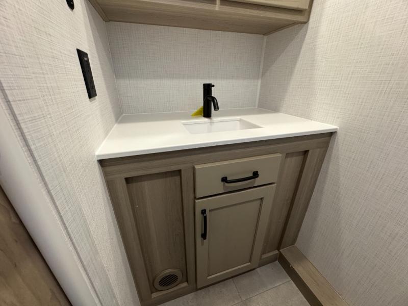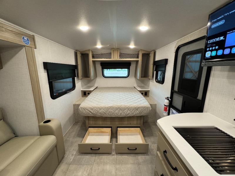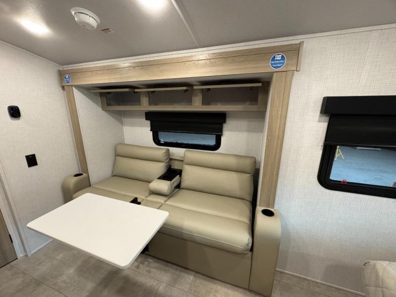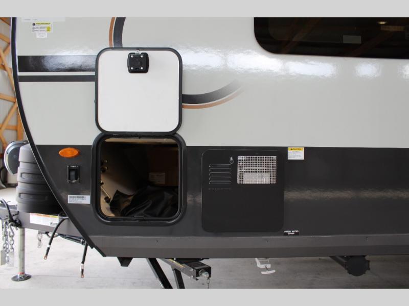 This travel trailer will feel more like home with its front bedroom and walk-around full-size bed. You'll enjoy the 32" 12V TV as you relax on the 72" sofa with a table and cupholders. The full rear bath includes a spacious shower to clean up in each day and there is a linen closet for clean towels. When you're ready to prepare dinner you'll have a three burner cooktop and microwave oven indoors, and a griddle outdoors! And don't forget the exterior storage allows you to bring along beach toys and tackle boxes. The optional Power Package available on this model includes three 200W solar panels, a side solar plug-in, a 3kW 160A inverter, and more off-grid features!