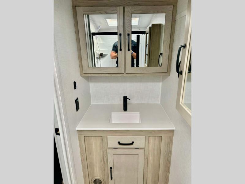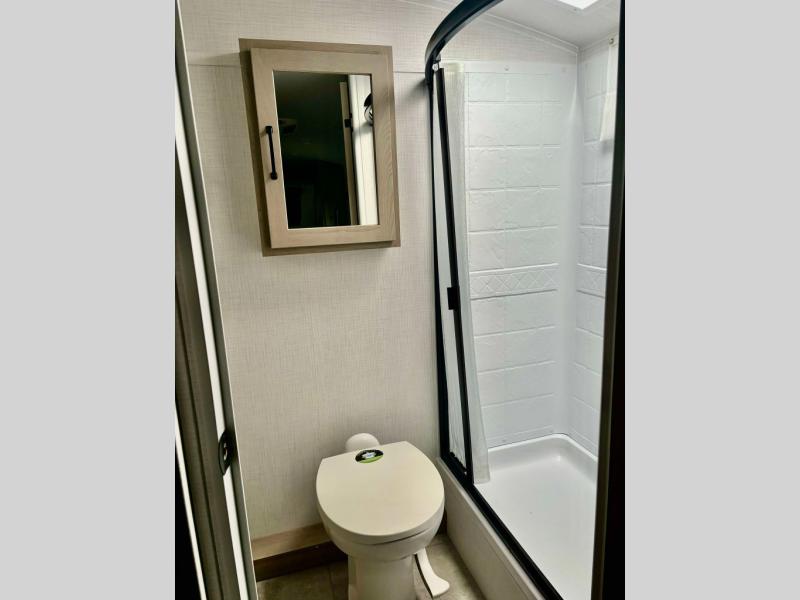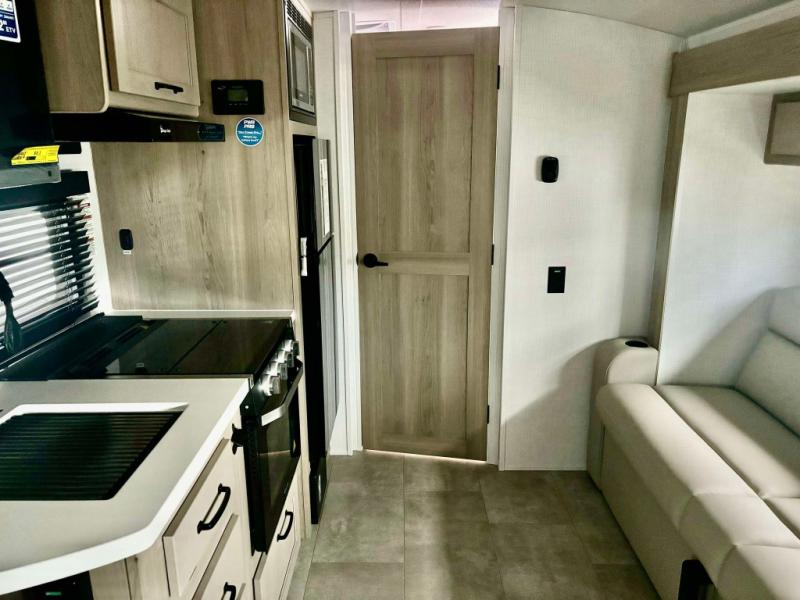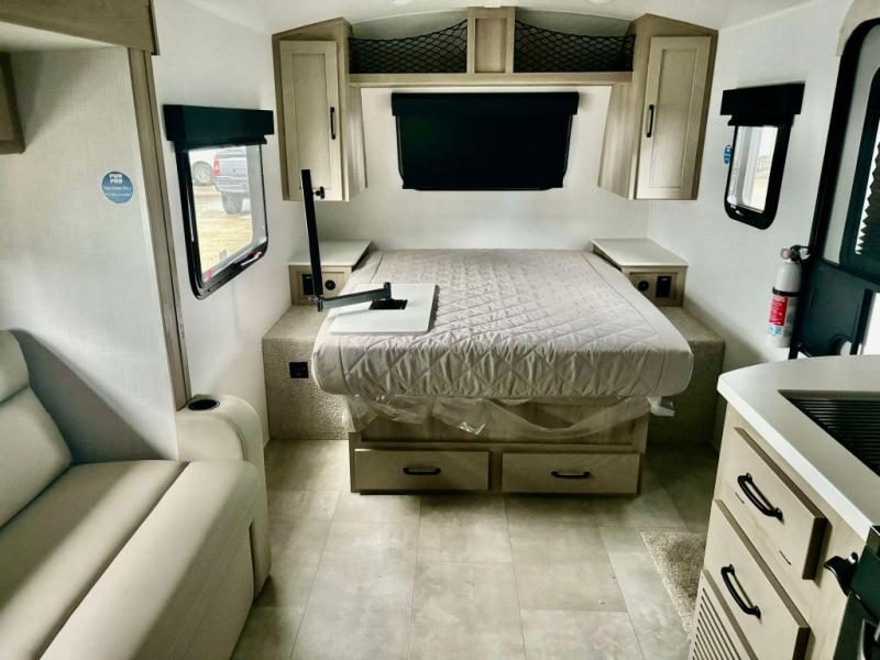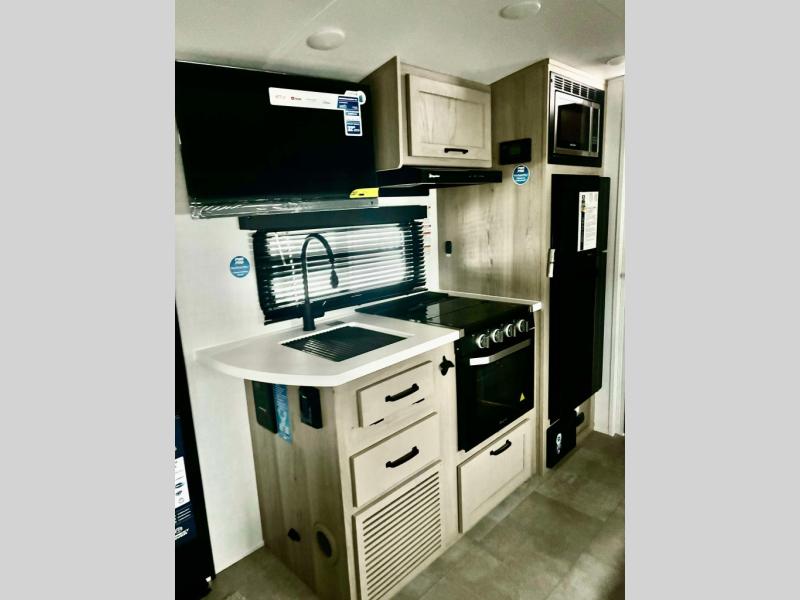 This travel trailer will feel more like home with its front bedroom and walk-around full-size bed. You'll enjoy the 32" 12V TV as you relax on the 72" sofa with a table and cupholders. The full rear bath includes a spacious shower to clean up in each day and there is a linen closet for clean towels. When you're ready to prepare dinner you'll have a three burner cooktop and microwave oven indoors, and a griddle outdoors! And don't forget the exterior storage allows you to bring along beach toys and tackle boxes. The optional Power Package available on this model includes three 200W solar panels, a side solar plug-in, a 3kW 160A inverter, and more off-grid features!