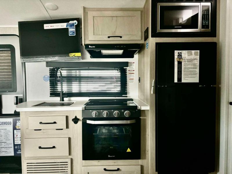 With any Rockwood GEO Pro travel trailer by Forest River you will enjoy easy towing, durable construction, and off-road capabilities with larger 15" tires and a lift kit! Each model is constructed with complete composite wall construction for added strength and durability, and the torsion axle, Rubber-Ryde suspension will make towing easier than ever. Inside, you'll find sleek roller shades for added privacy, a 12V refrigerator and a microwave, plus a 20,000 BTU furnace to keep you warm during the colder camping months.