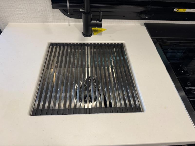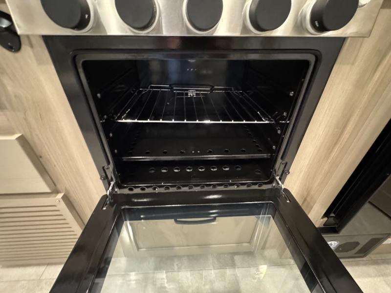 Modern kitchen with a three-burner cooktop, microwave oven, and 12V refrigerator gives you the tools to prepare full meals without compromise.