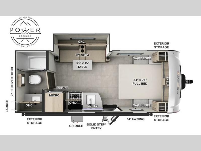 This travel trailer will feel more like home with its front bedroom and walk-around full-size bed. You'll enjoy the 32" 12V TV as you relax on the 72" sofa with a table and cupholders. The full rear bath includes a spacious shower to clean up in each day and there is a linen closet for clean towels. When you're ready to prepare dinner you'll have a three burner cooktop and microwave oven indoors, and a griddle outdoors! And don't forget the exterior storage allows you to bring along beach toys and tackle boxes. The optional Power Package available on this model includes three 200W solar panels, a side solar plug-in, a 3kW 160A inverter, and more off-grid features!