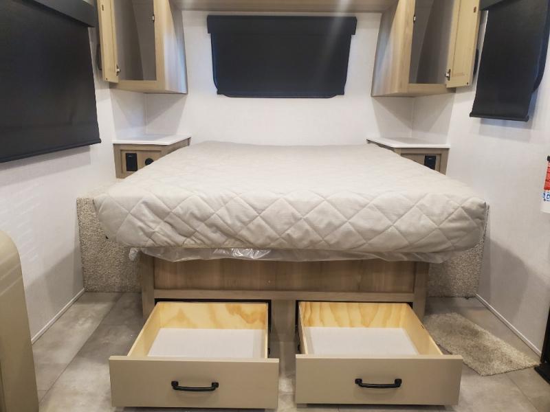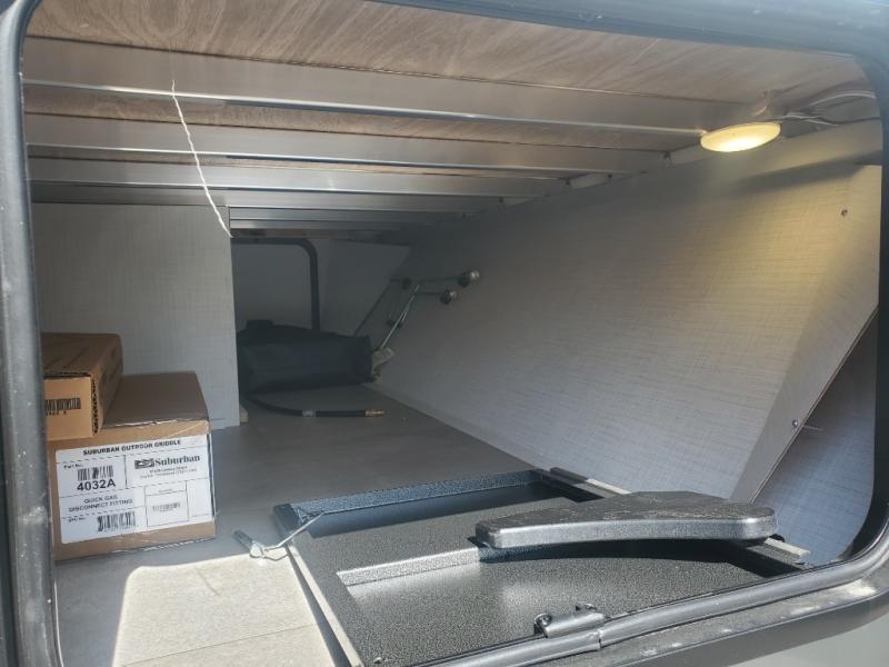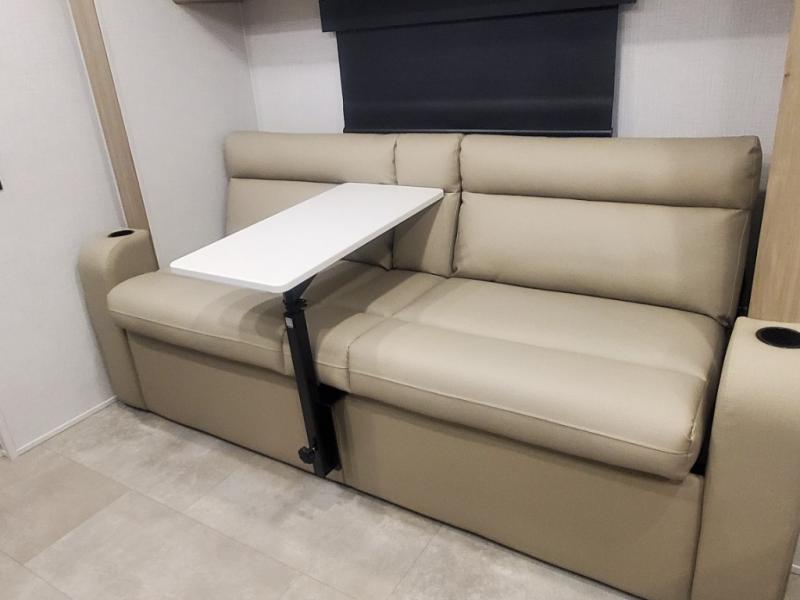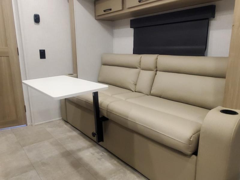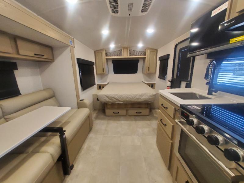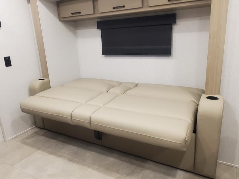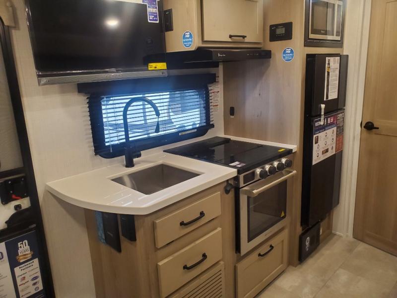 This travel trailer will feel more like home with its front bedroom and walk-around full-size bed. You'll enjoy the 32" 12V TV as you relax on the 72" sofa with a table and cupholders. The full rear bath includes a spacious shower to clean up in each day and there is a linen closet for clean towels. When you're ready to prepare dinner you'll have a three burner cooktop and microwave oven indoors, and a griddle outdoors! And don't forget the exterior storage allows you to bring along beach toys and tackle boxes. The optional Power Package available on this model includes three 200W solar panels, a side solar plug-in, a 3kW 160A inverter, and more off-grid features!
