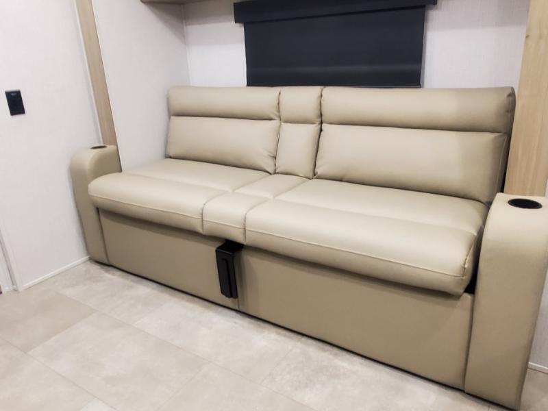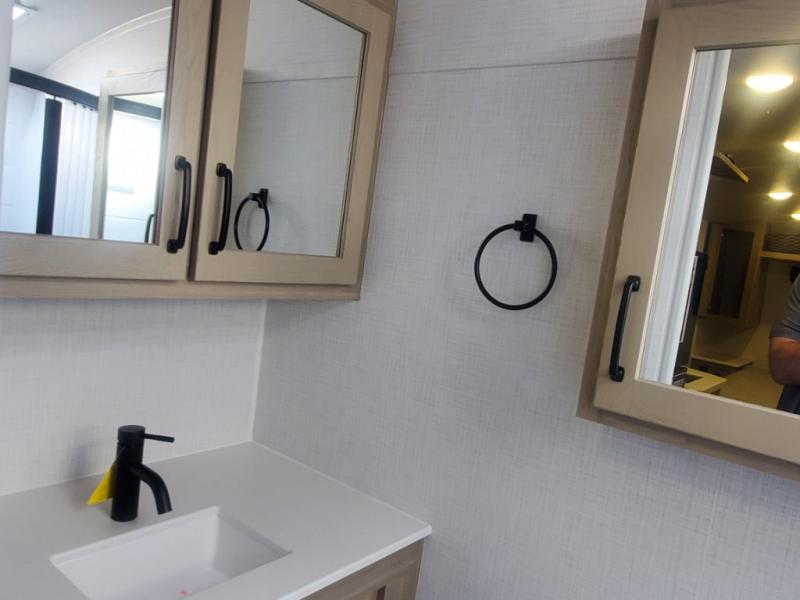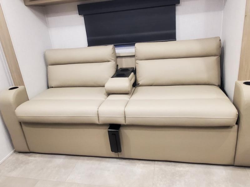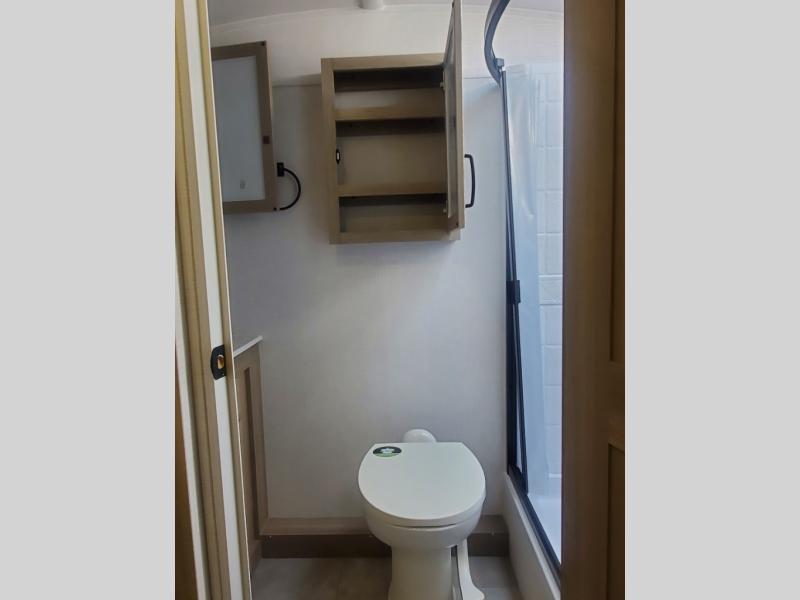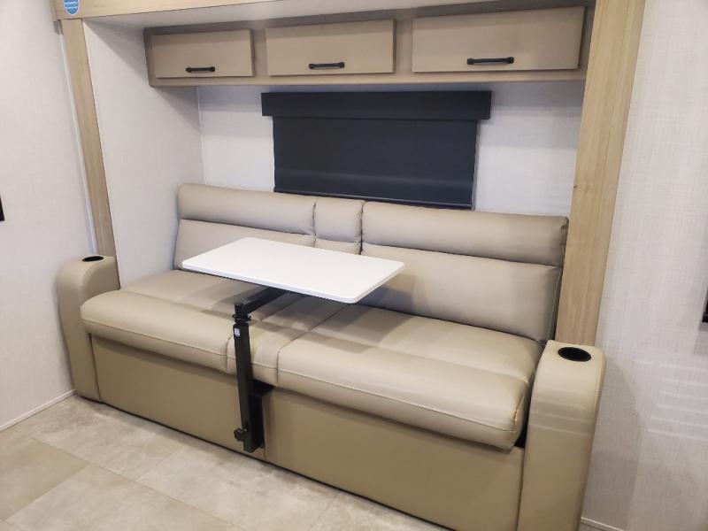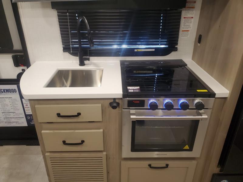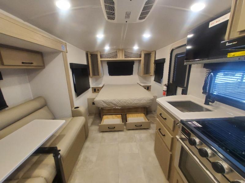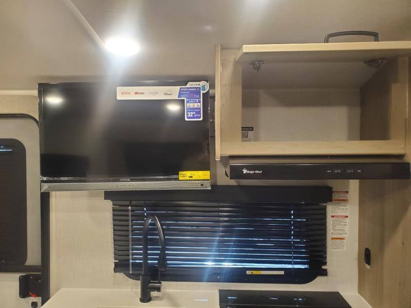 This travel trailer will feel more like home with its front bedroom and walk-around full-size bed. You'll enjoy the 32" 12V TV as you relax on the 72" sofa with a table and cupholders. The full rear bath includes a spacious shower to clean up in each day and there is a linen closet for clean towels. When you're ready to prepare dinner you'll have a three burner cooktop and microwave oven indoors, and a griddle outdoors! And don't forget the exterior storage allows you to bring along beach toys and tackle boxes. The optional Power Package available on this model includes three 200W solar panels, a side solar plug-in, a 3kW 160A inverter, and more off-grid features!