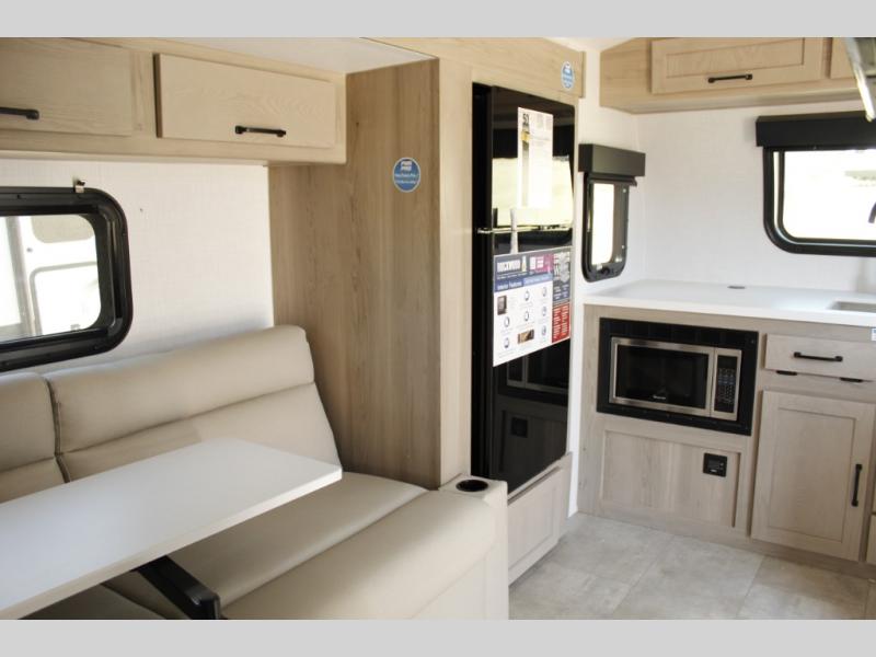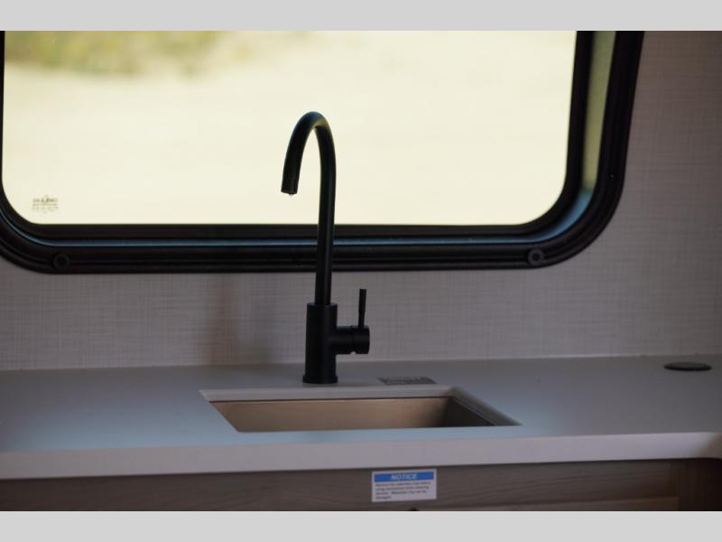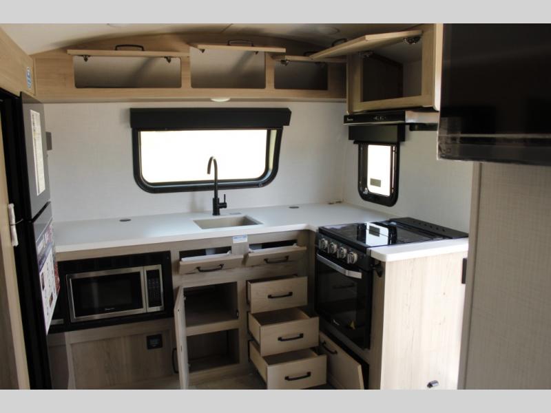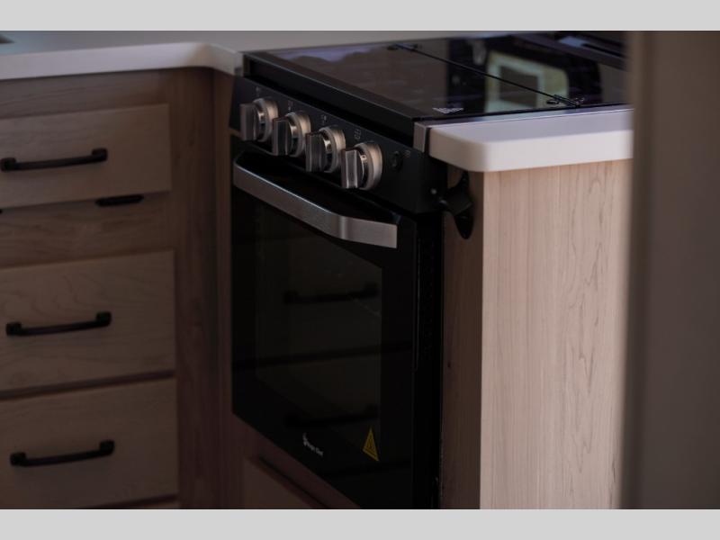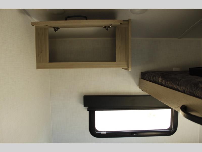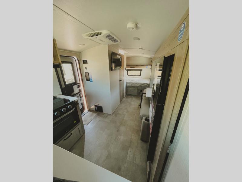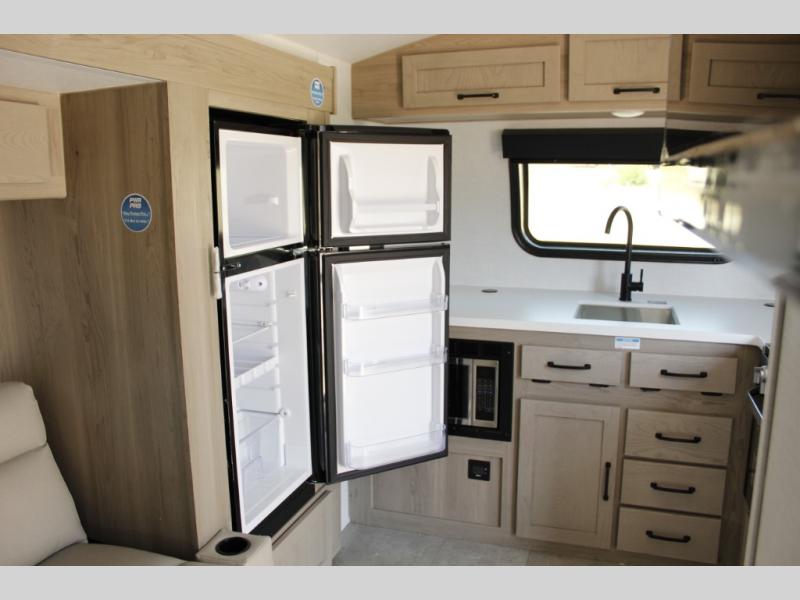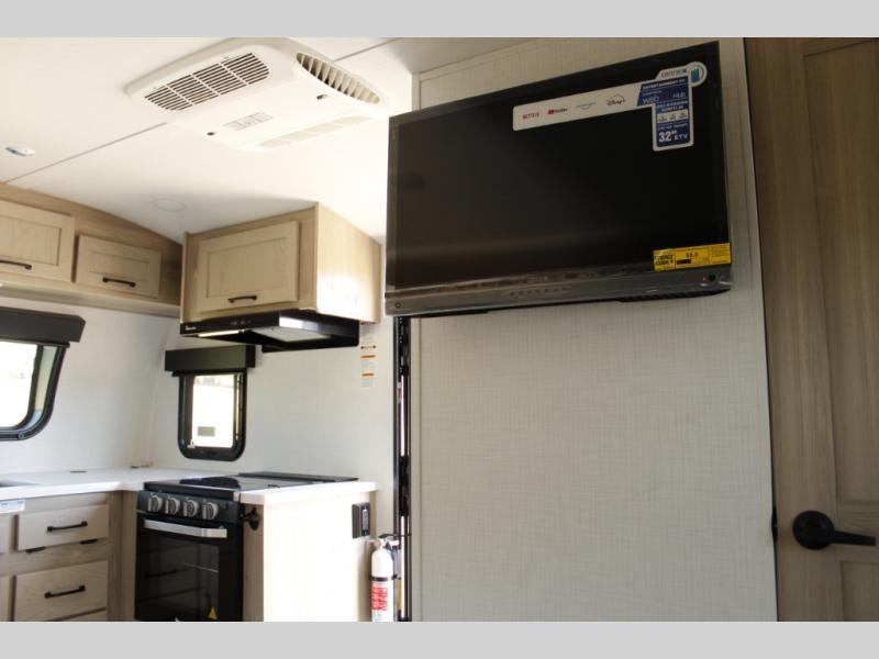 Are you looking for a lightweight trailer with at-home comforts? Take a look at this single slide out unit that can sleep three to four each night. There is a queen-size bed in the back with a 26" x 80" flip-up bunk for cozy sleeping space, a 72" sofa with cupholders to relax on, plus a 32" 12V TV for movie nights! The front kitchen includes a 12V refrigerator to store food, plus a microwave oven and a gas oven to cook meals each day.