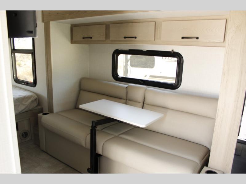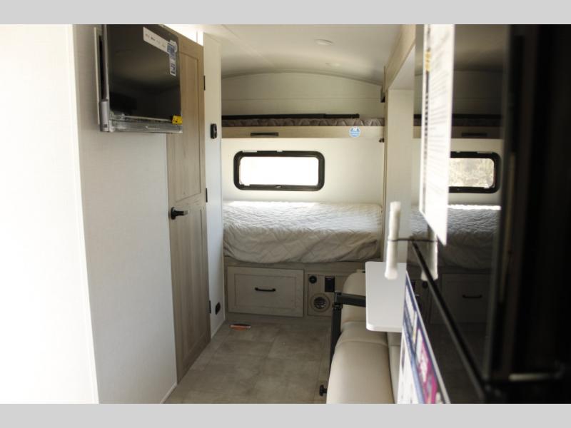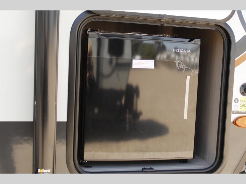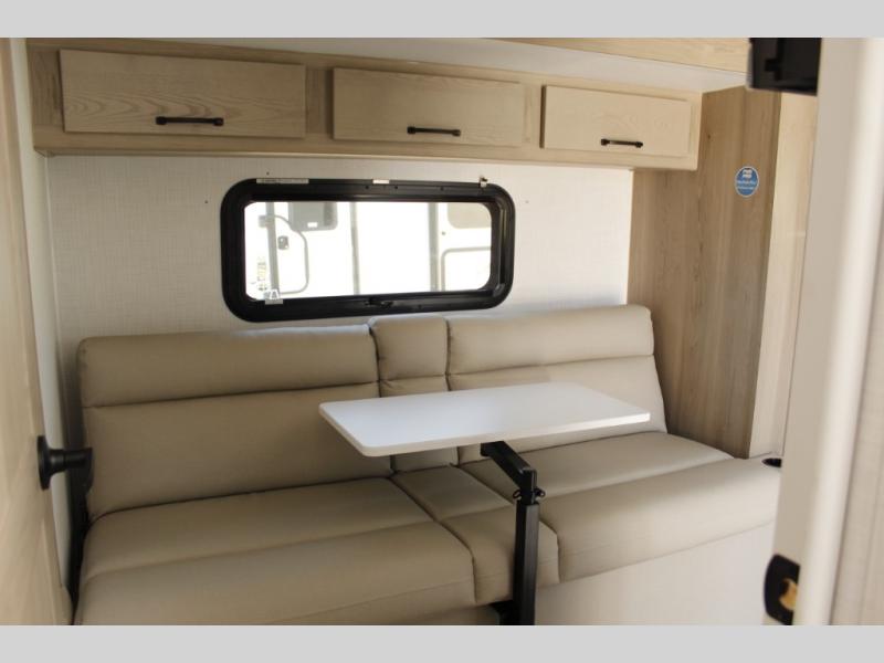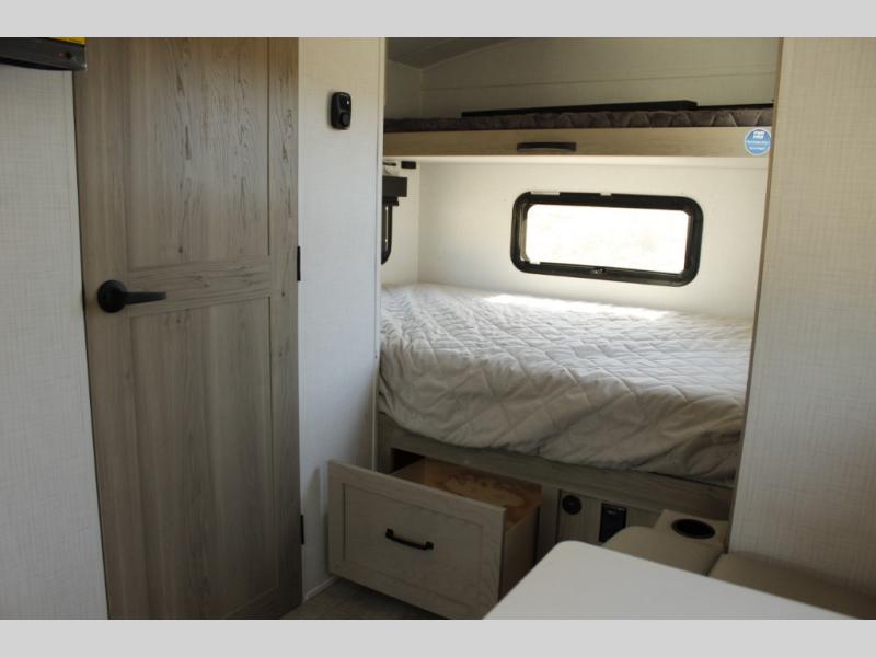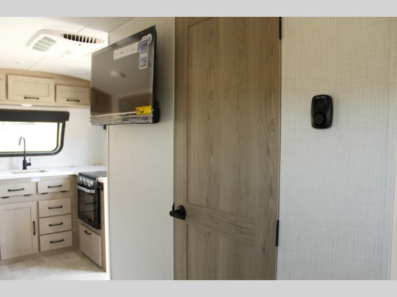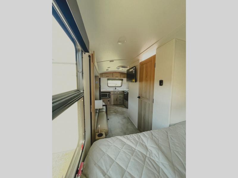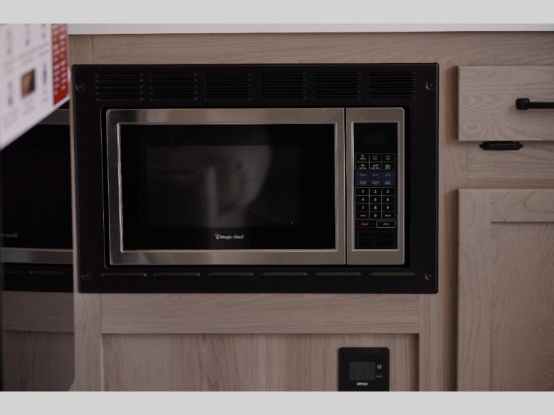 Are you looking for a lightweight trailer with at-home comforts? Take a look at this single slide out unit that can sleep three to four each night. There is a queen-size bed in the back with a 26" x 80" flip-up bunk for cozy sleeping space, a 72" sofa with cupholders to relax on, plus a 32" 12V TV for movie nights! The front kitchen includes a 12V refrigerator to store food, plus a microwave oven and a gas oven to cook meals each day.