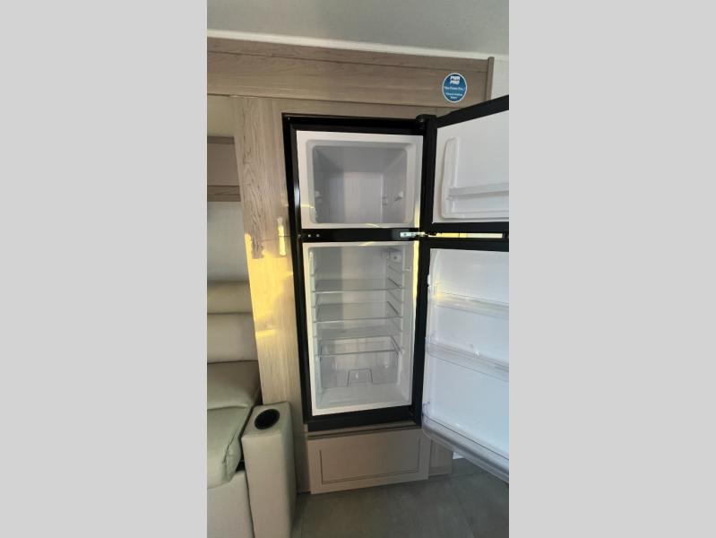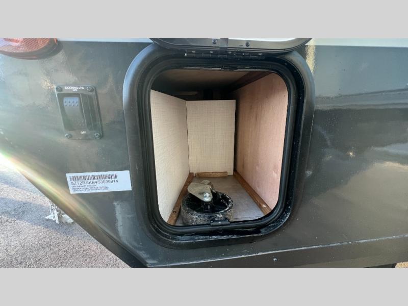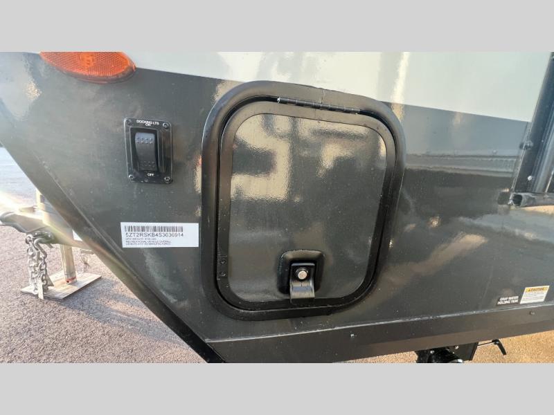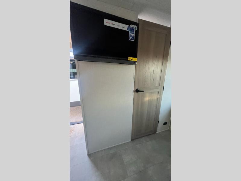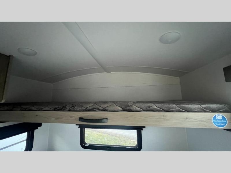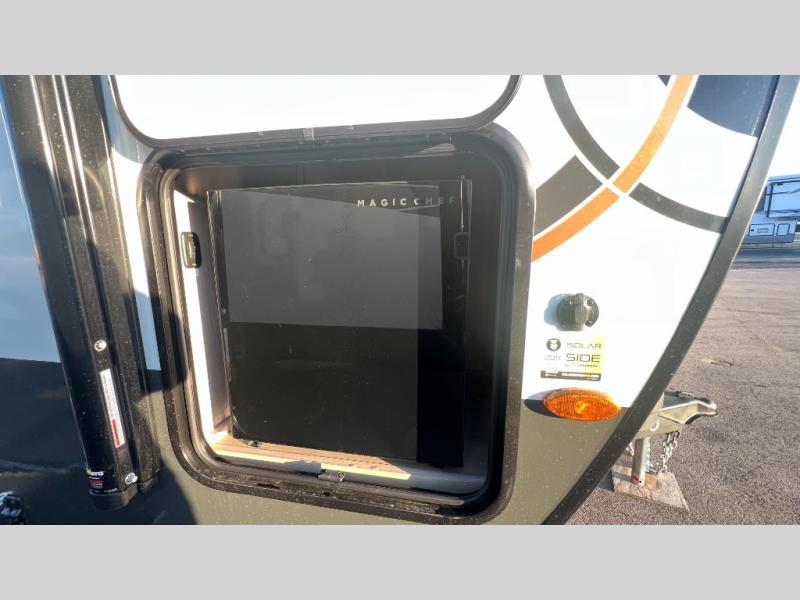 Are you looking for a lightweight trailer with at-home comforts? Take a look at this single slide out unit that can sleep three to four each night. There is a queen-size bed in the back with a 26" x 80" flip-up bunk for cozy sleeping space, a 72" sofa with cupholders to relax on, plus a 32" 12V TV for movie nights! The front kitchen includes a 12V refrigerator to store food, plus a microwave oven and a gas oven to cook meals each day.