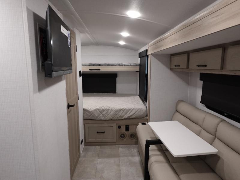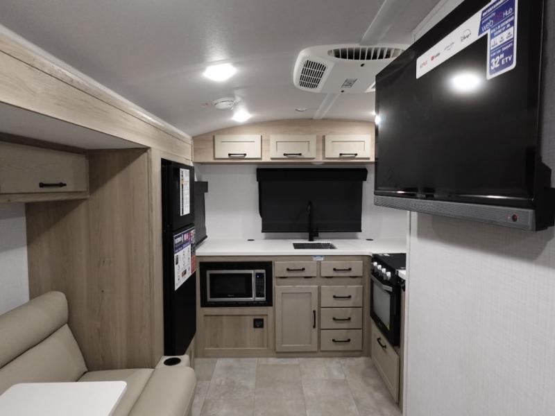 Are you looking for a lightweight trailer with at-home comforts? Take a look at this single slide out unit that can sleep three to four each night. There is a queen-size bed in the back with a 26" x 80" flip-up bunk for cozy sleeping space, a 72" sofa with cupholders to relax on, plus a 32" 12V TV for movie nights! The front kitchen includes a 12V refrigerator to store food, plus a microwave oven and a gas oven to cook meals each day.
