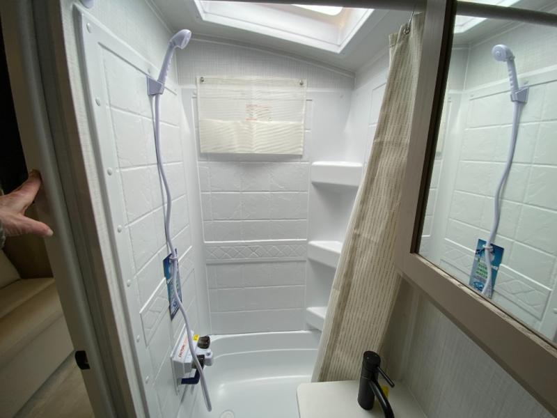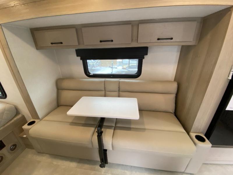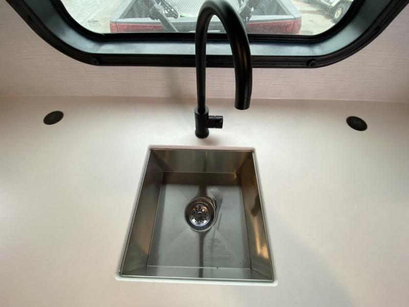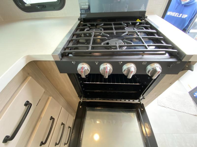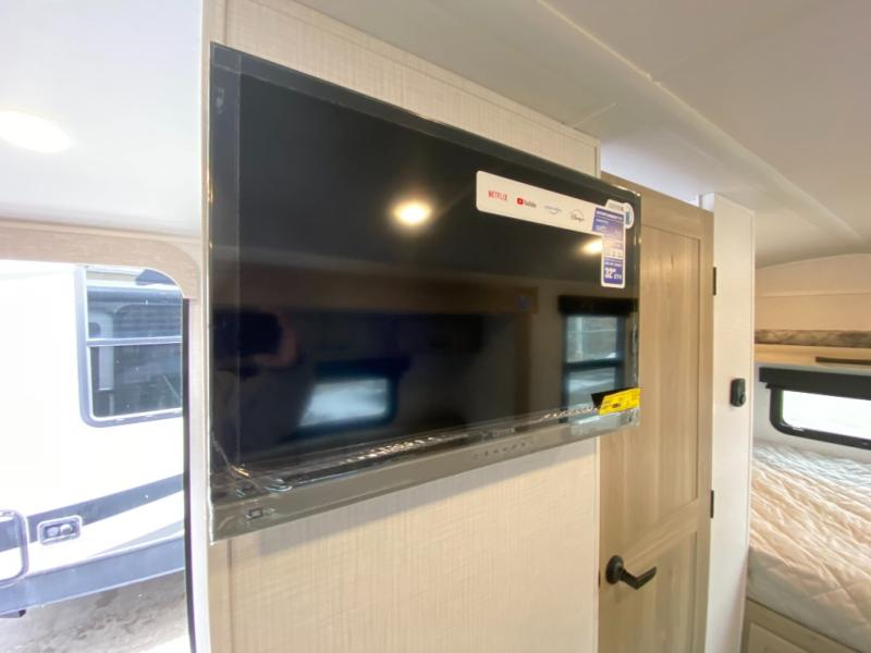 Are you looking for a lightweight trailer with at-home comforts? Take a look at this single slide out unit that can sleep three to four each night. There is a queen-size bed in the back with a 26" x 80" flip-up bunk for cozy sleeping space, a 72" sofa with cupholders to relax on, plus a 32" 12V TV for movie nights! The front kitchen includes a 12V refrigerator to store food, plus a microwave oven and a gas oven to cook meals each day.