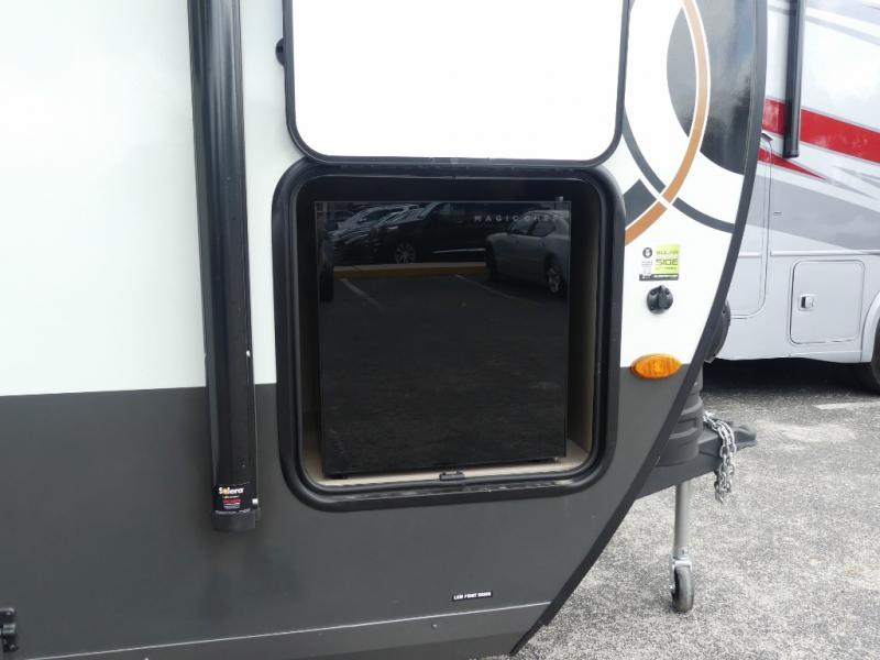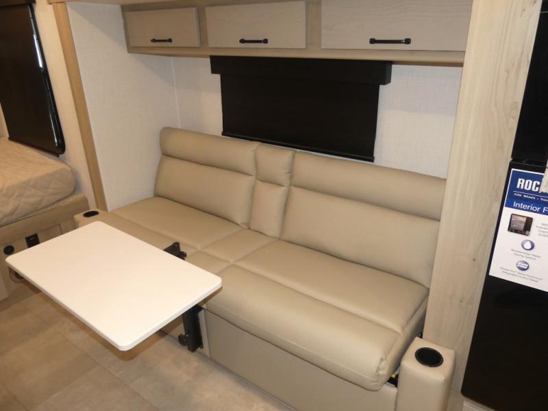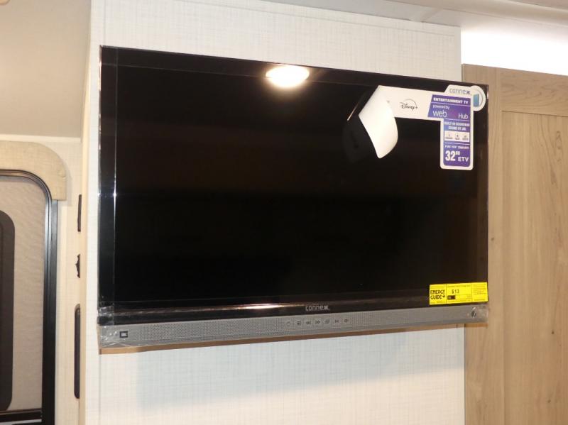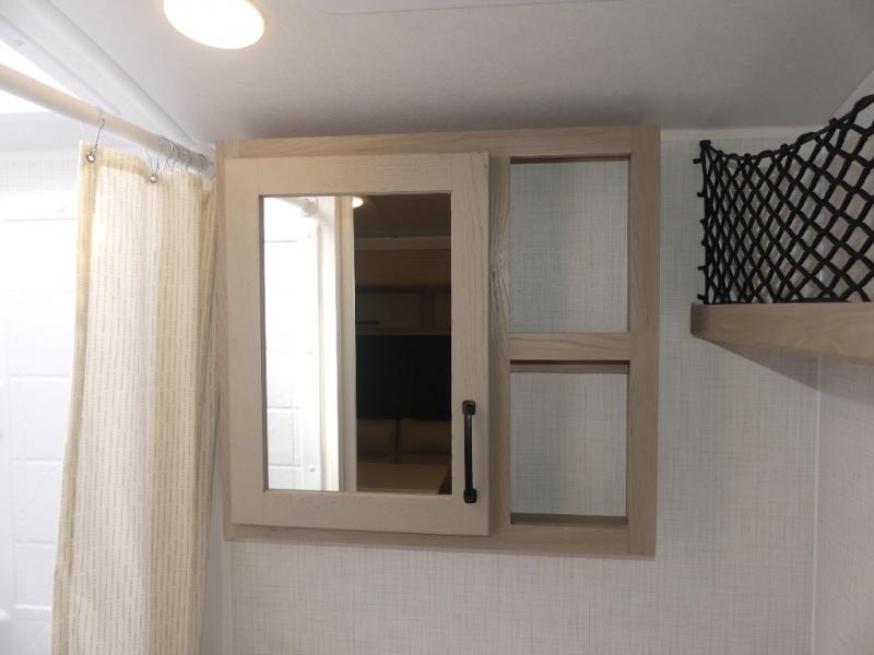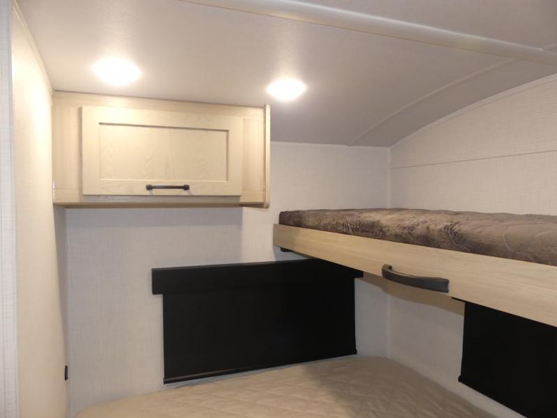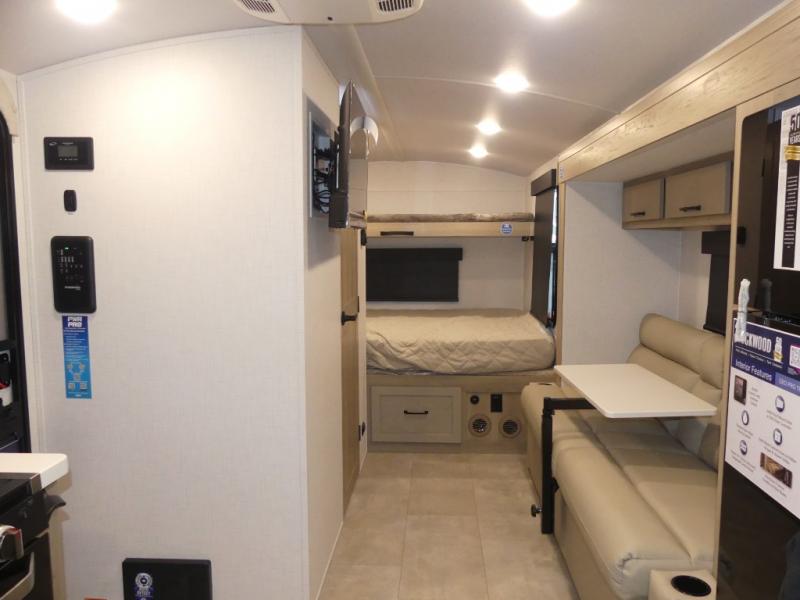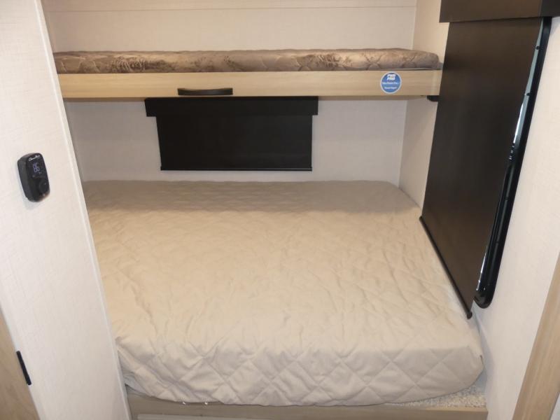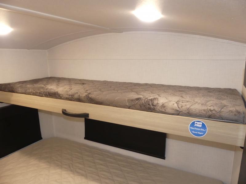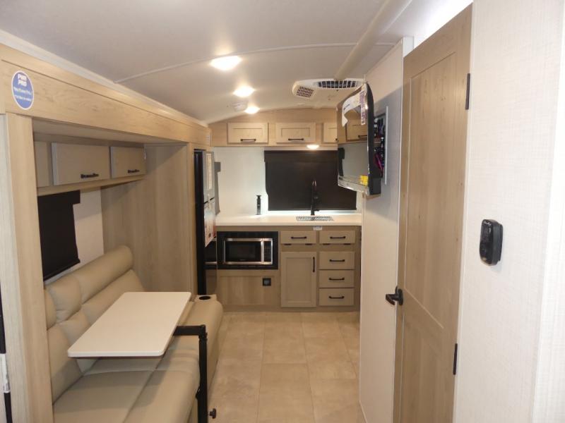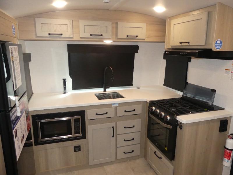 Are you looking for a lightweight trailer with at-home comforts? Take a look at this single slide out unit that can sleep three to four each night. There is a queen-size bed in the back with a 26" x 80" flip-up bunk for cozy sleeping space, a 72" sofa with cupholders to relax on, plus a 32" 12V TV for movie nights! The front kitchen includes a 12V refrigerator to store food, plus a microwave oven and a gas oven to cook meals each day.