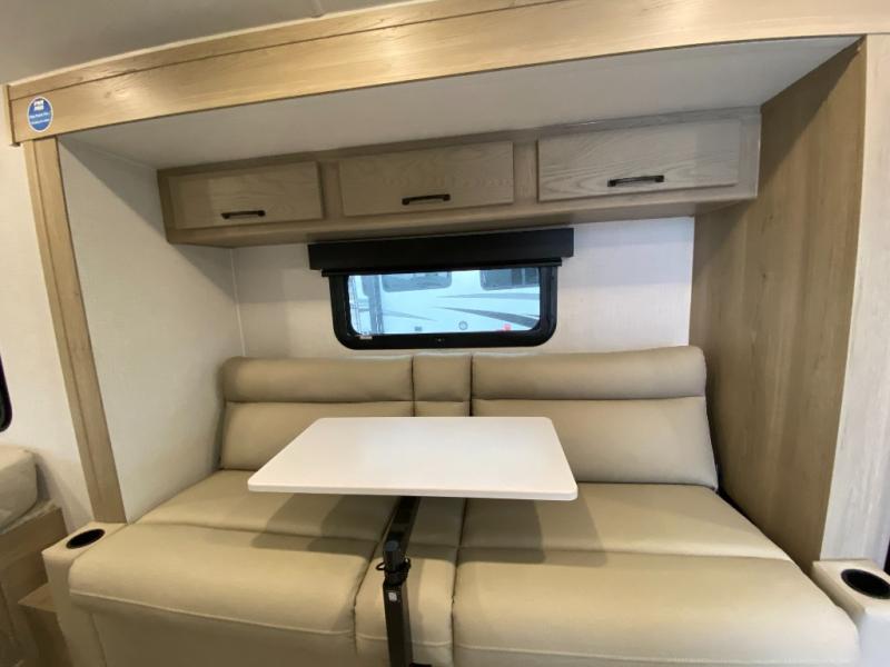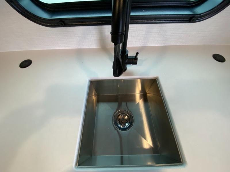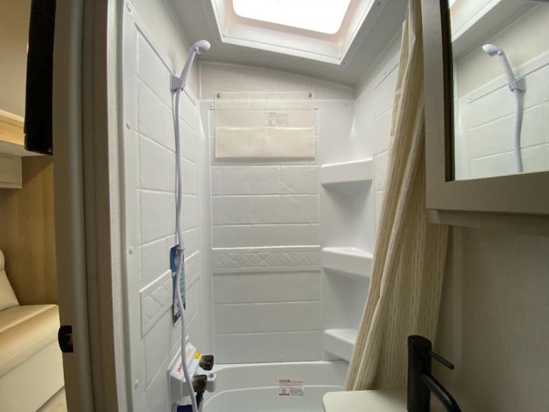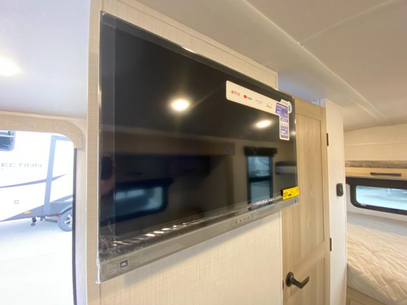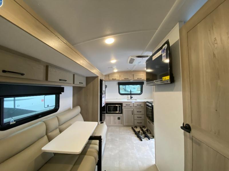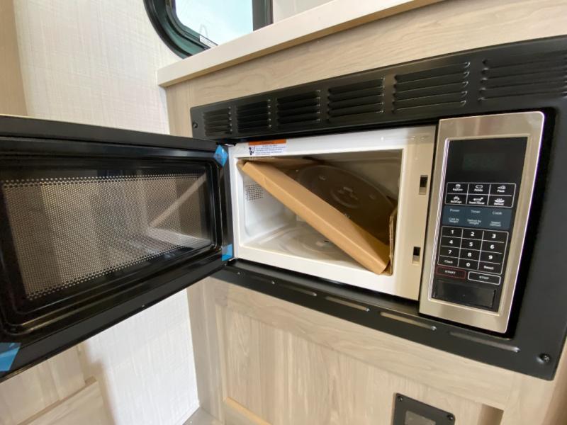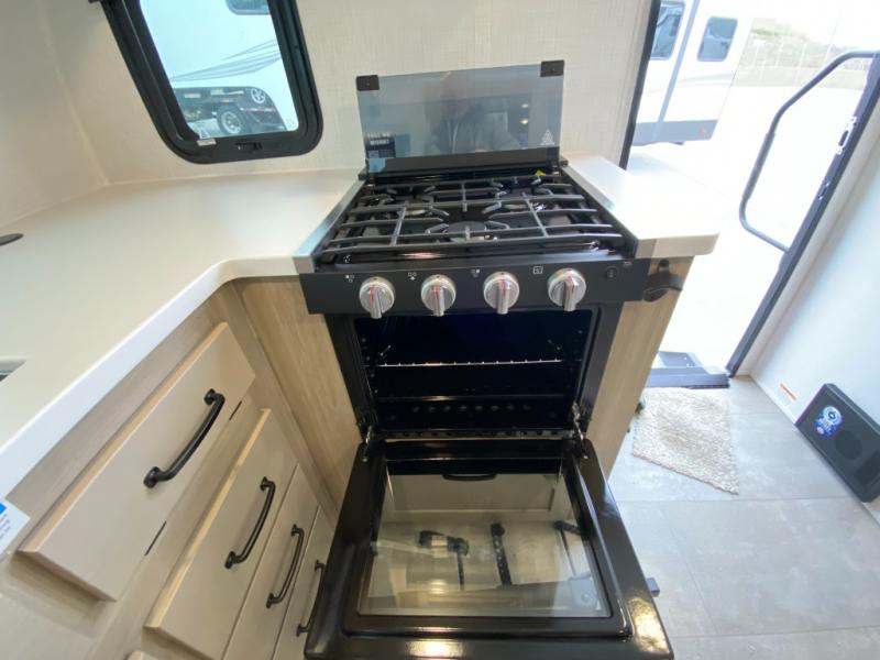 Are you looking for a lightweight trailer with at-home comforts? Take a look at this single slide out unit that can sleep three to four each night. There is a queen-size bed in the back with a 26" x 80" flip-up bunk for cozy sleeping space, a 72" sofa with cupholders to relax on, plus a 32" 12V TV for movie nights! The front kitchen includes a 12V refrigerator to store food, plus a microwave oven and a gas oven to cook meals each day.