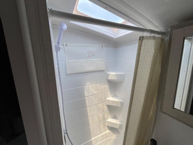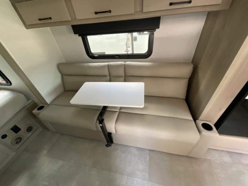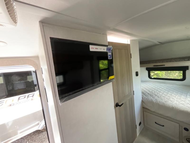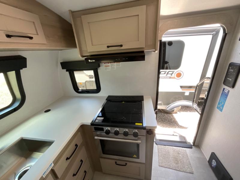Are you looking for a lightweight trailer with at-home comforts? Take a look at this single slide out unit that can sleep three to four each night. There is a queen-size bed in the back with a 26" x 80" flip-up bunk for cozy sleeping space, a 72" sofa with cupholders to relax on, plus a 32" 12V TV for movie nights! The front kitchen includes a 12V refrigerator to store food, plus a microwave oven and a gas oven to cook meals each day.