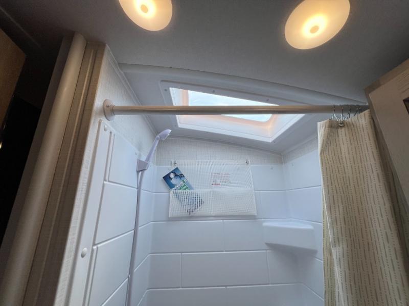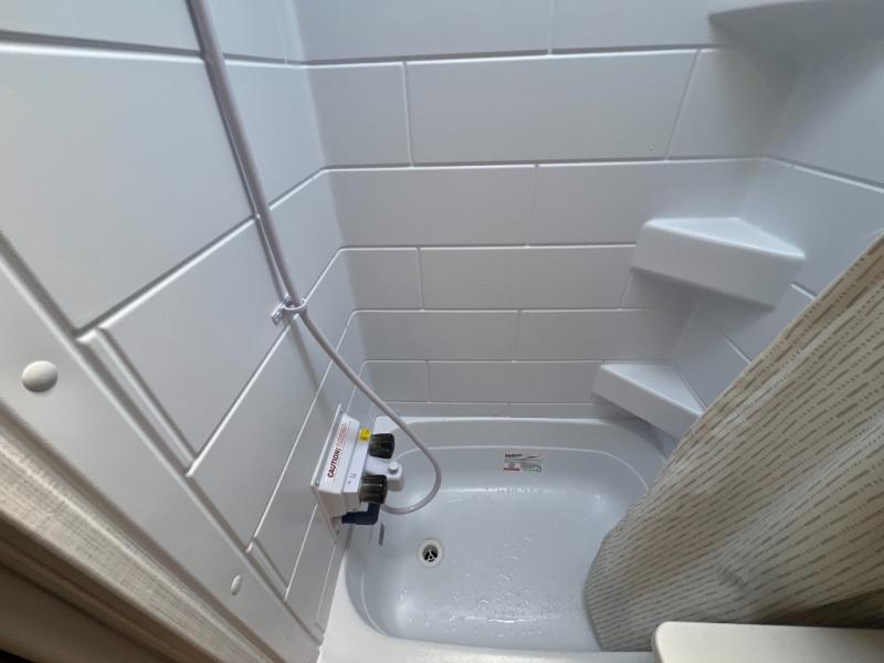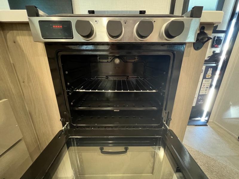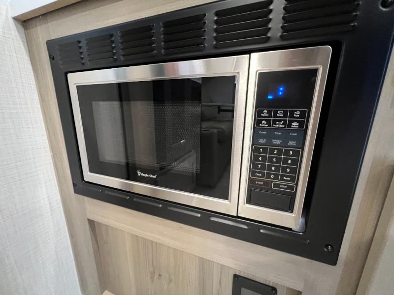 Are you looking for a lightweight trailer with at-home comforts? Take a look at this single slide out unit that can sleep three to four each night. There is a queen-size bed in the back with a 26" x 80" flip-up bunk for cozy sleeping space, a 72" sofa with cupholders to relax on, plus a 32" 12V TV for movie nights! The front kitchen includes a 12V refrigerator to store food, plus a microwave oven and a gas oven to cook meals each day.