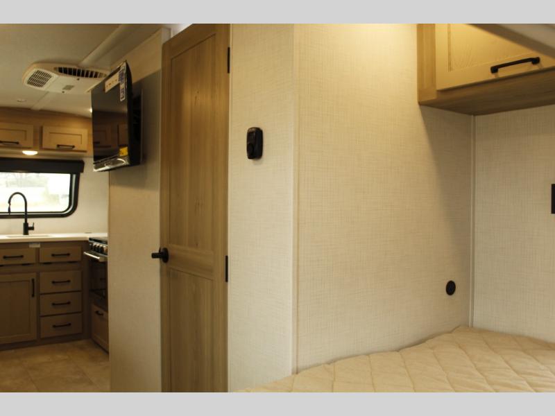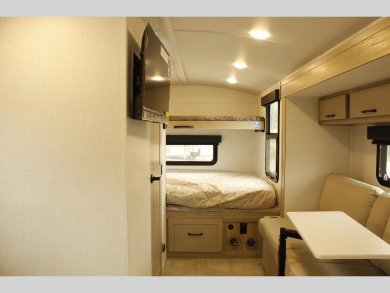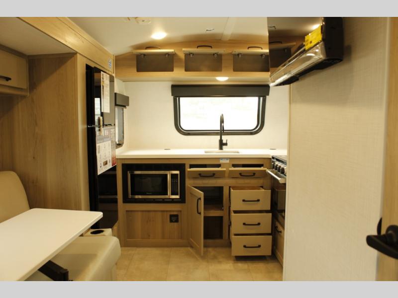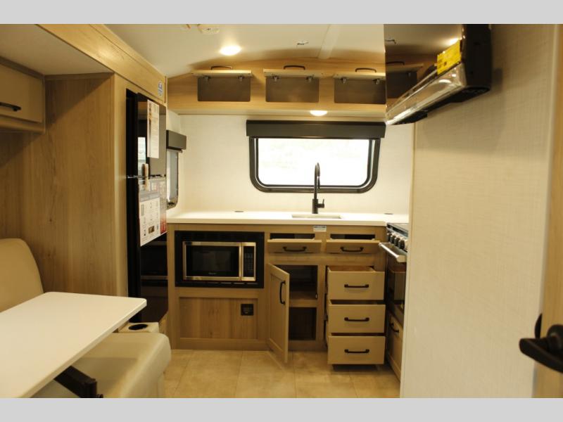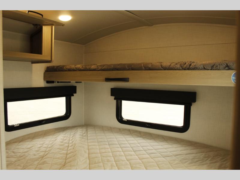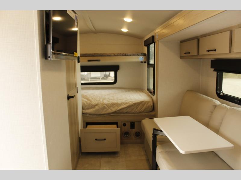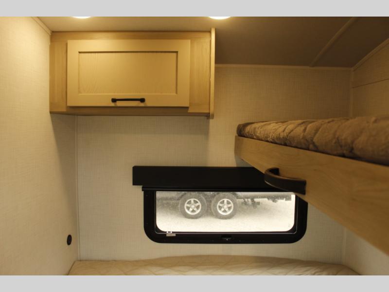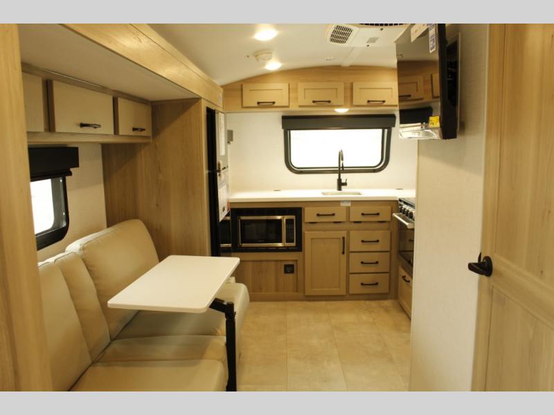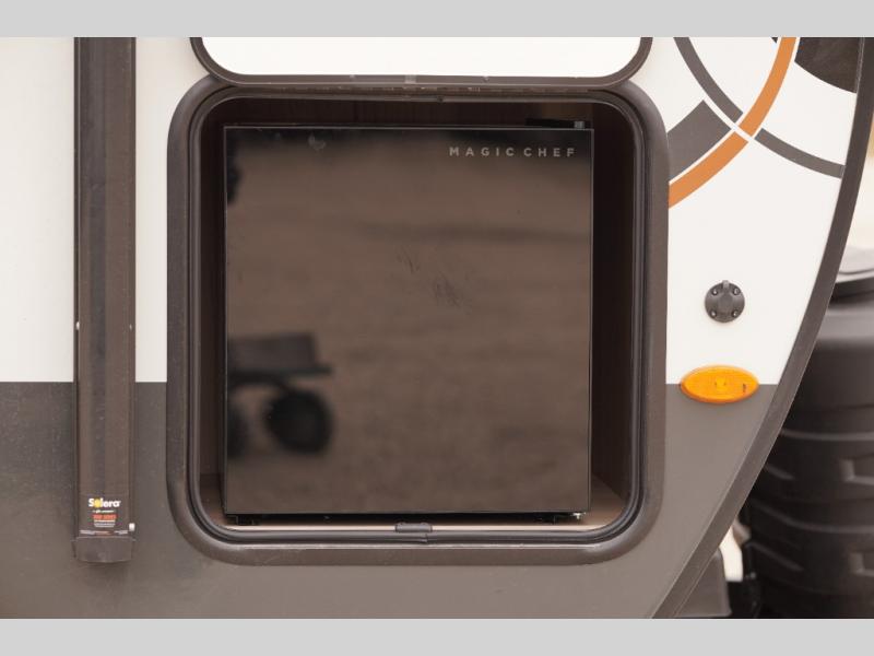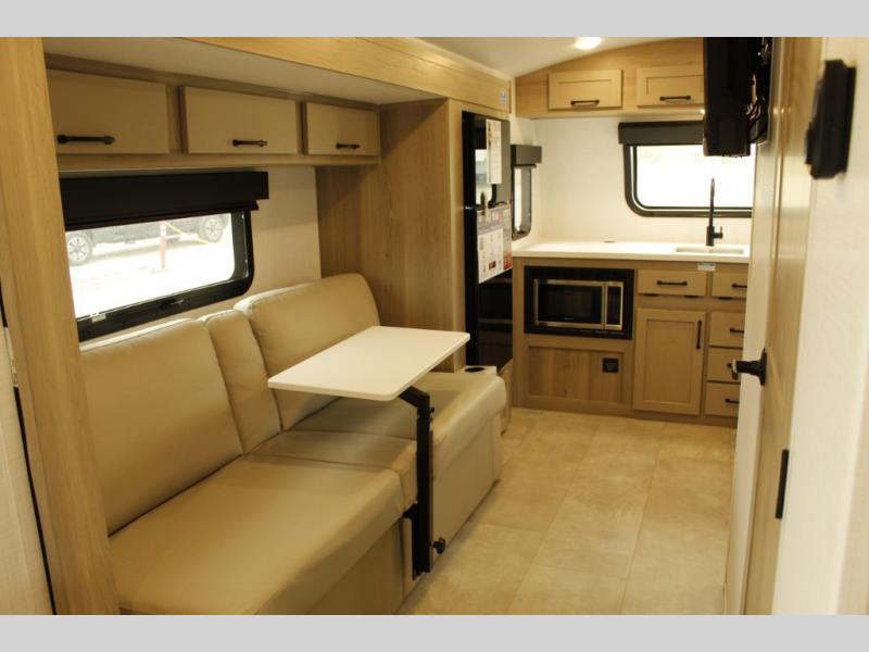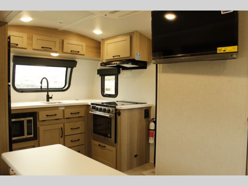 Are you looking for a lightweight trailer with at-home comforts? Take a look at this single slide out unit that can sleep three to four each night. There is a queen-size bed in the back with a 26" x 80" flip-up bunk for cozy sleeping space, a 72" sofa with cupholders to relax on, plus a 32" 12V TV for movie nights! The front kitchen includes a 12V refrigerator to store food, plus a microwave oven and a gas oven to cook meals each day.