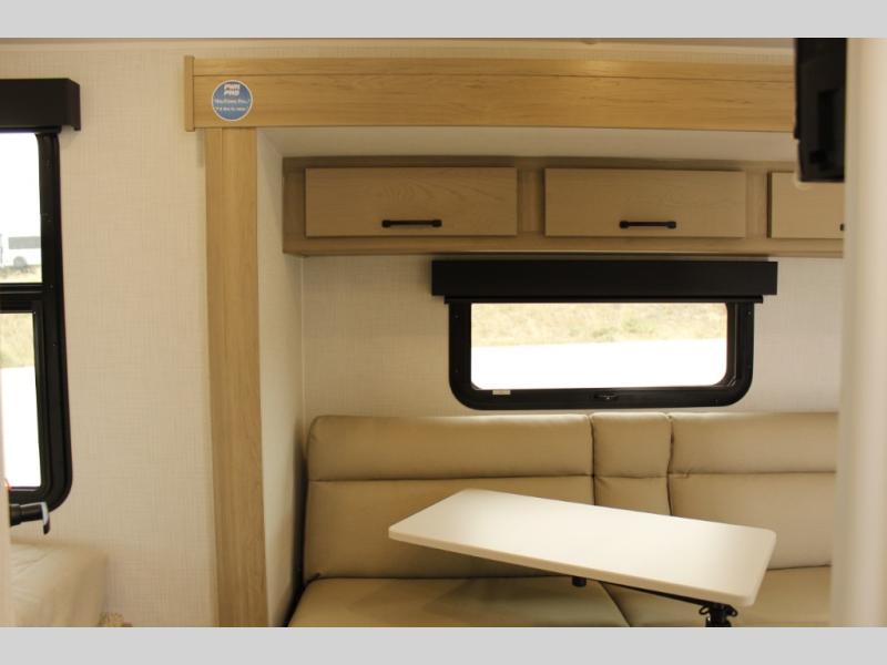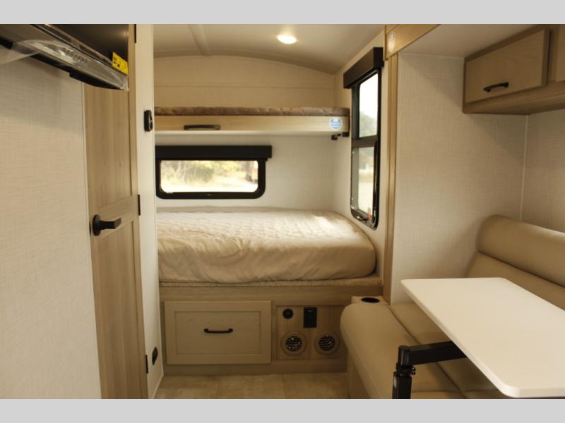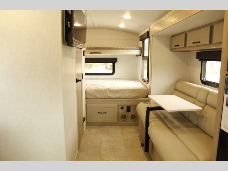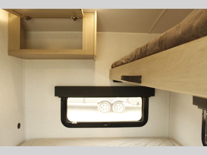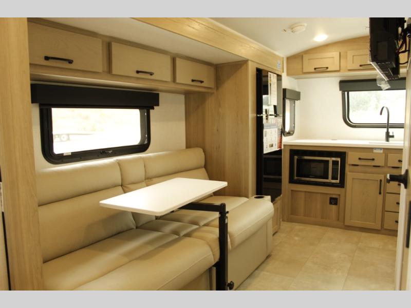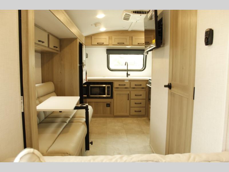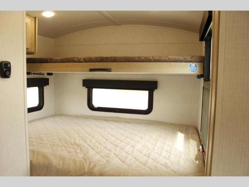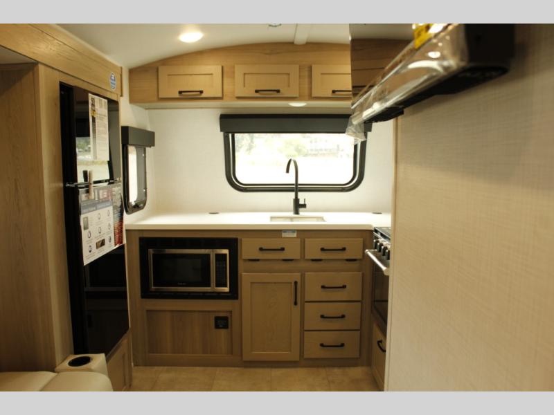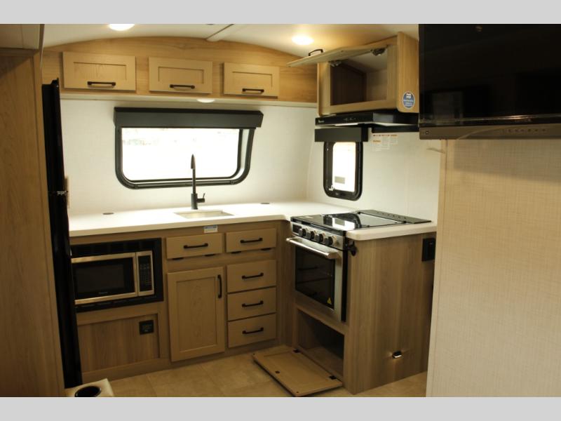 Are you looking for a lightweight trailer with at-home comforts? Take a look at this single slide out unit that can sleep three to four each night. There is a queen-size bed in the back with a 26" x 80" flip-up bunk for cozy sleeping space, a 72" sofa with cupholders to relax on, plus a 32" 12V TV for movie nights! The front kitchen includes a 12V refrigerator to store food, plus a microwave oven and a gas oven to cook meals each day.