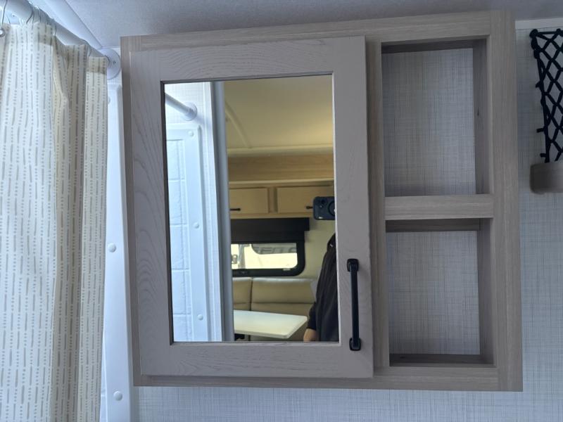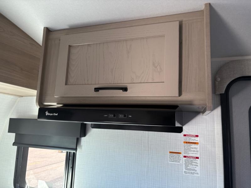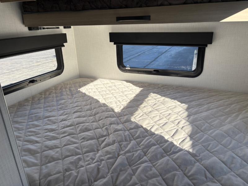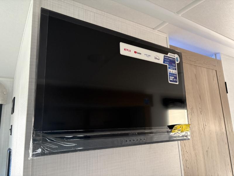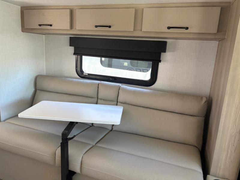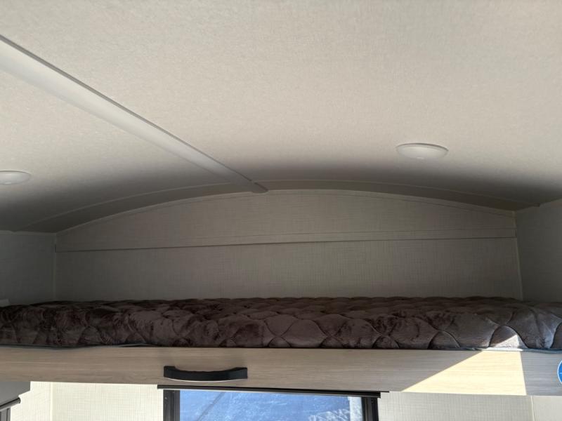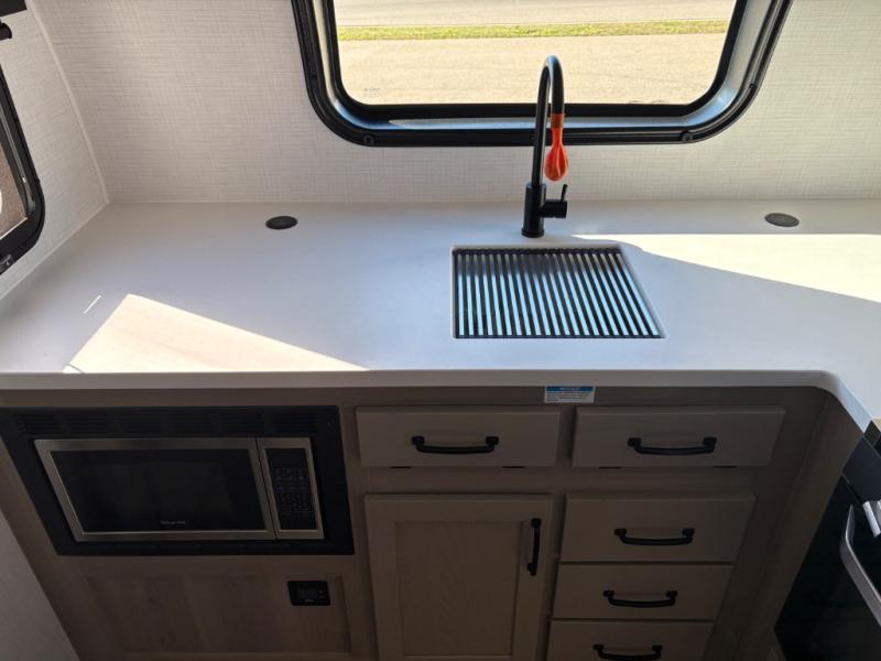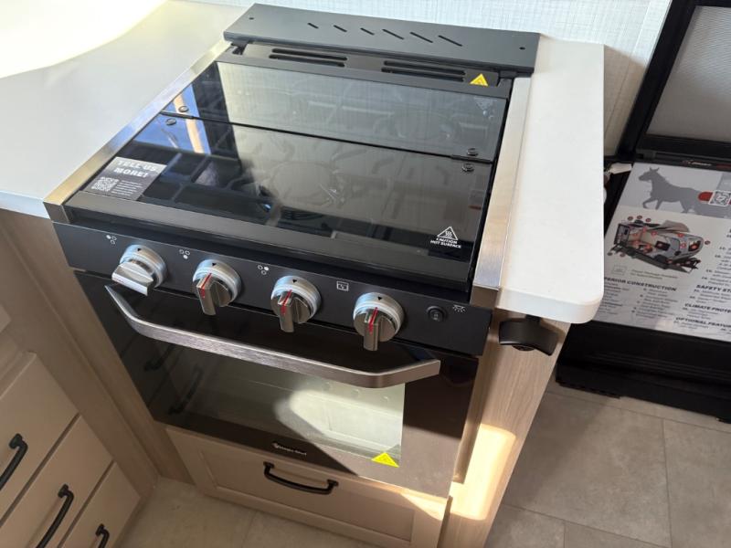 Are you looking for a lightweight trailer with at-home comforts? Take a look at this single slide out unit that can sleep three to four each night. There is a queen-size bed in the back with a 26" x 80" flip-up bunk for cozy sleeping space, a 72" sofa with cupholders to relax on, plus a 32" 12V TV for movie nights! The front kitchen includes a 12V refrigerator to store food, plus a microwave oven and a gas oven to cook meals each day.