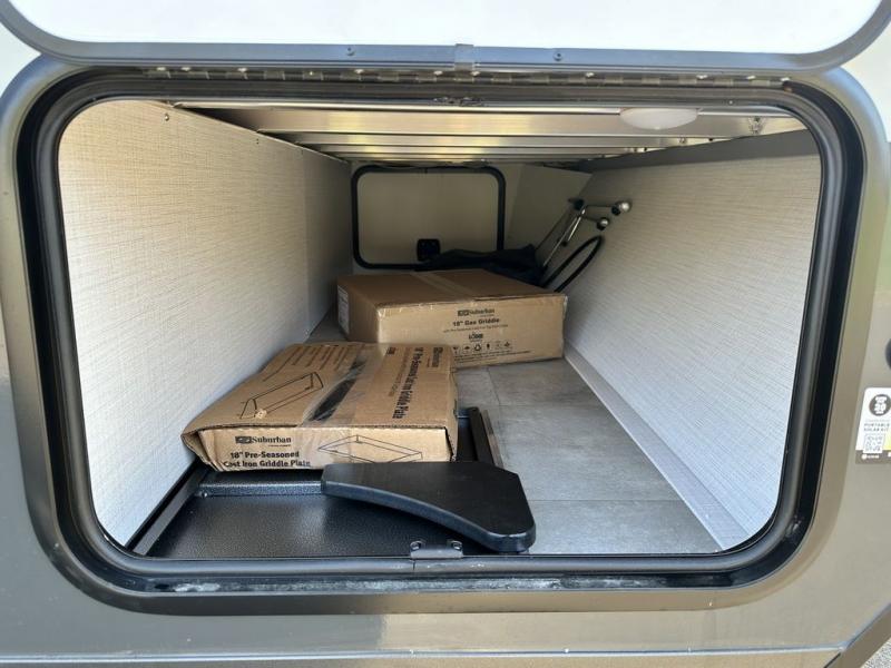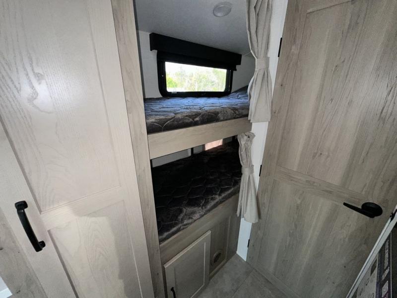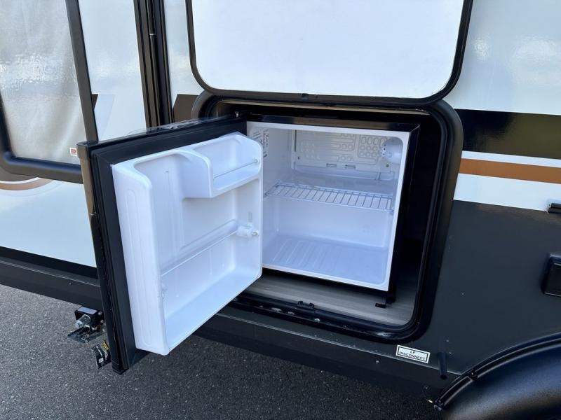 You're going to love camping with your family or friends in this spacious bunk model! The bunk beds will be perfect for little ones, while you take the front full-size bed. There is also a 44" booth dinette within the slide out for additional sleeping and seating space. The kitchen includes everything the chef will need to prepare meals each day, including a recessed cooktop, microwave oven, and a 12V refrigerator for perishables. If the weather is nice, you may just find the chef outdoors cooking on the outside griddle under the 14' power awning. And check out the exterior bike door that will be perfect for bikes, luggage, or extra camp gear. The optional Power Package available on this model includes three 200W solar panels, a 460 Ah Mastervolt MLI lithium-ion battery, two smart remotes, and more off-grid features!