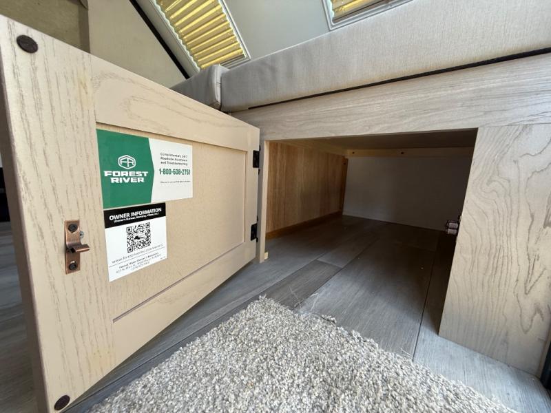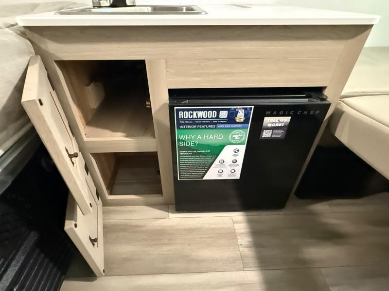 The Rockwood Hard Side High Wall A-frame camper by Forest River includes a clay fiberglass with alloy band exterior, four stabilizer jacks with sand pads so you can set up your camper anywhere, and plenty of exterior storage. The Hard Side Package comes with a water filter, 11K BTU under bunk A/C, and a Create-A-Breeze roof vent fan to keep the air flowing. The wood drawers with full extension metal guides, interior floor lights, and raised panel cabinet doors will make it feel a little more like home inside. Start camping today in a Rockwood Hard Side High Wall A-frame camper!