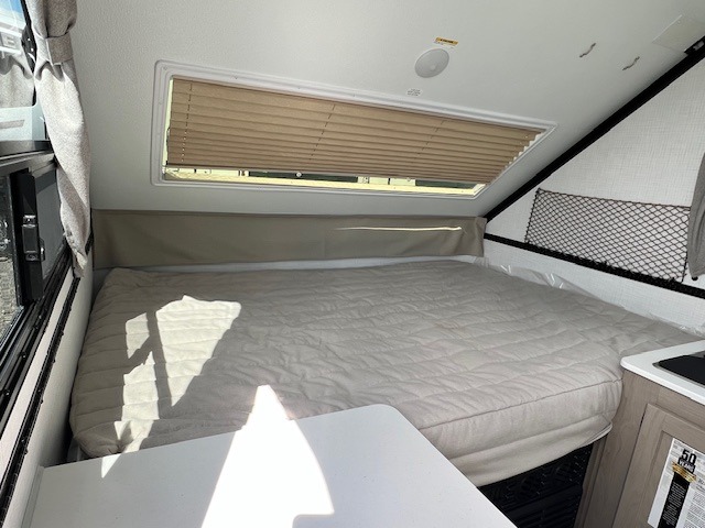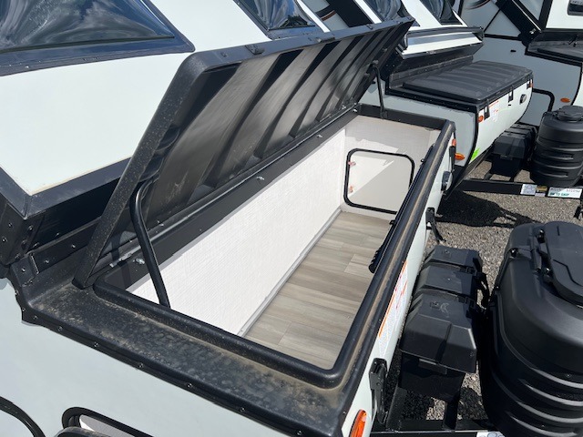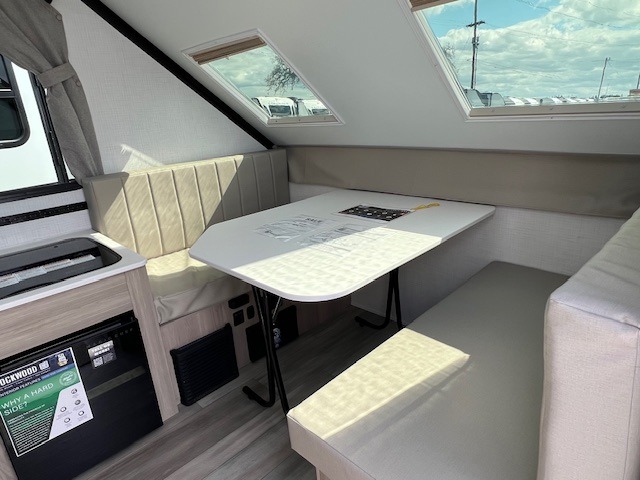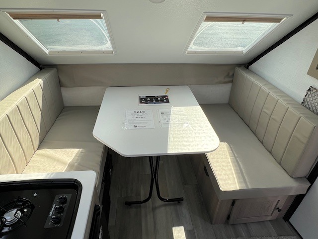 You can be set up at the lake in no time with this A-frame camper! The flip-up bed will provide more storage space for your bags, and you can relax with a cold drink at the 45" x 80" booth dinette once you're unpacked. There is a three burner cooktop and a 12V refrigerator with a 100W roof solar panel to cook and store meals each day. This model includes tons of exterior storage, including two EZ reach storage trunks and additional exterior storage for all your camp gear!