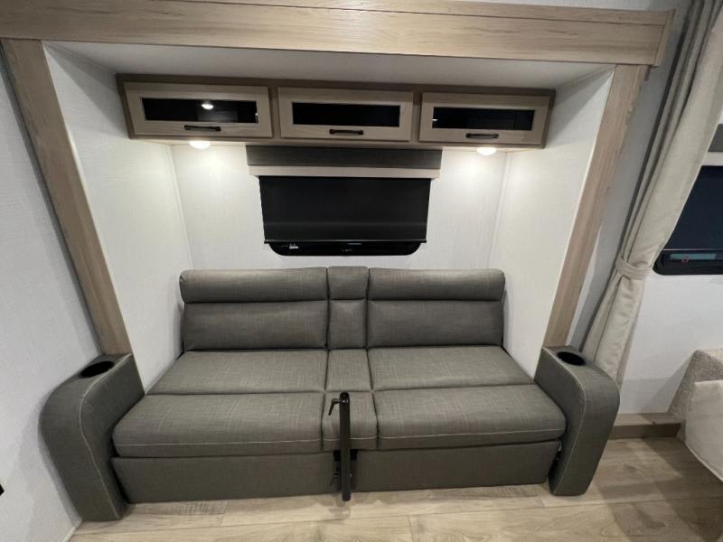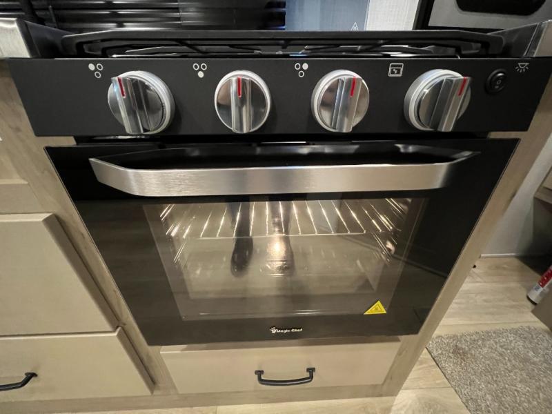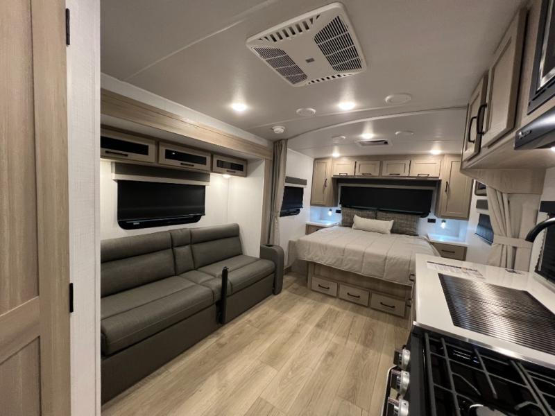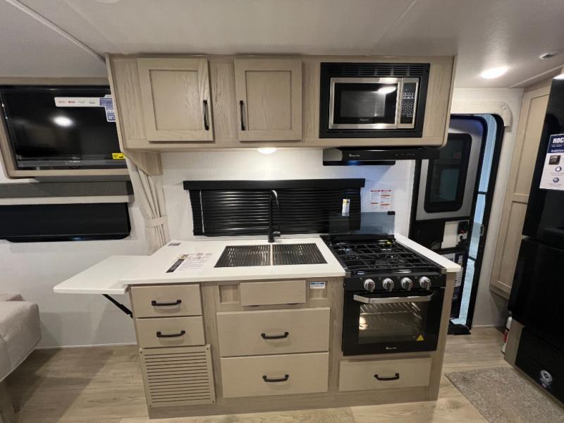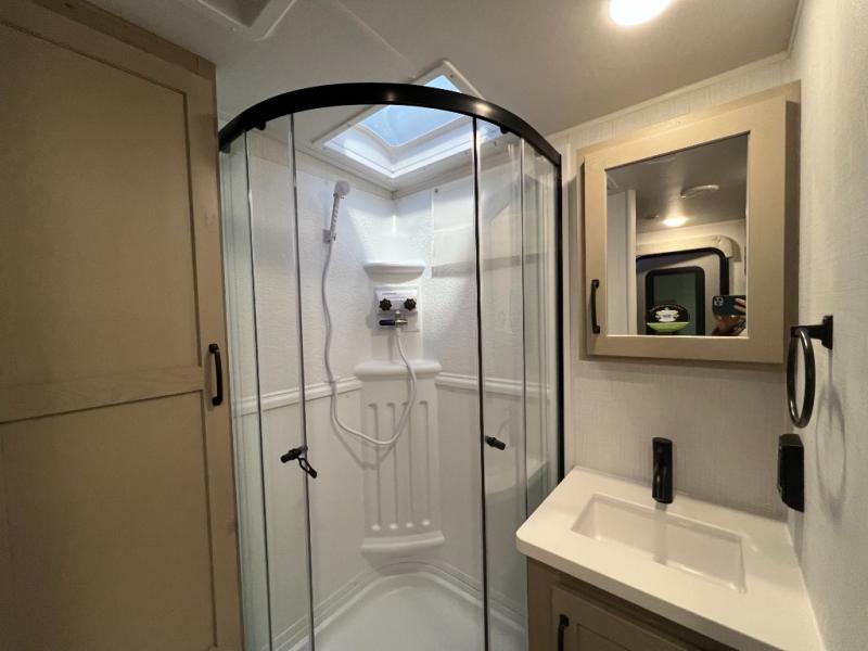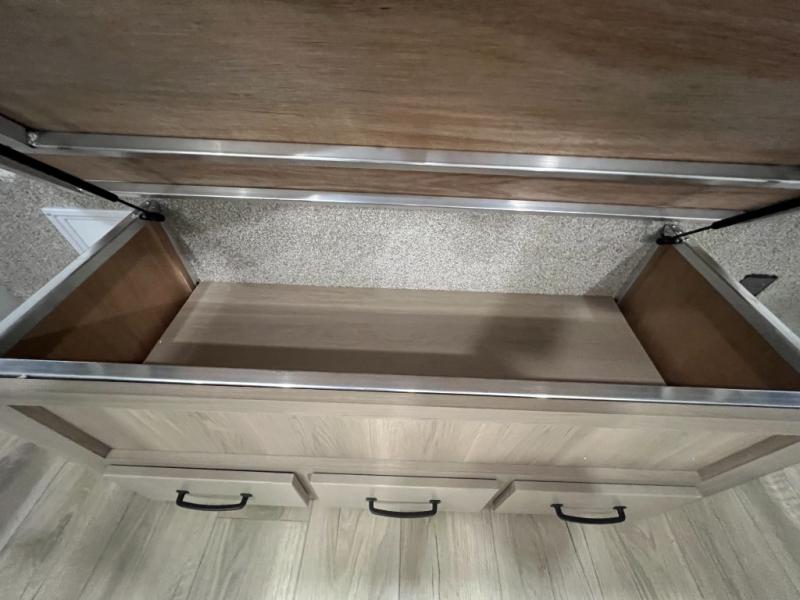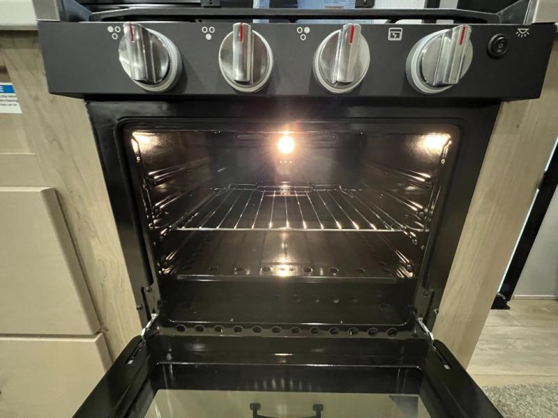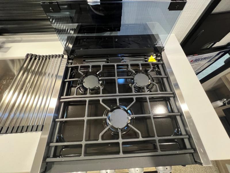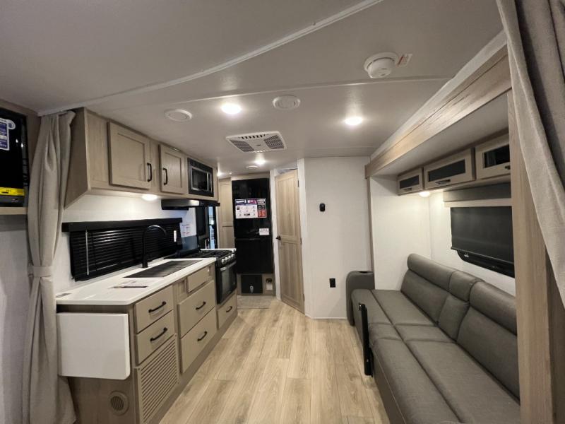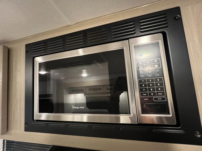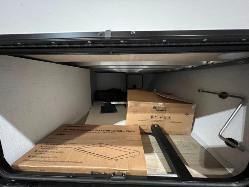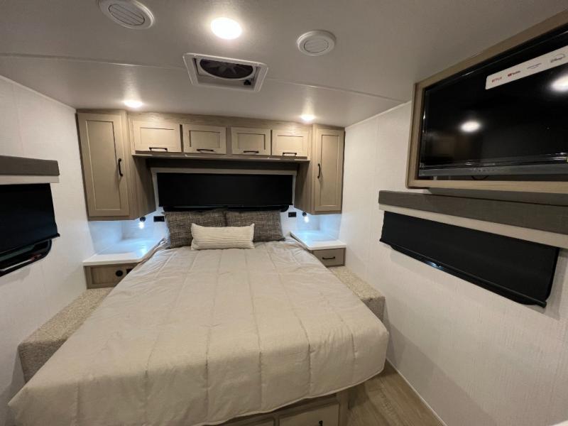 Wherever you decide to camp, you will love every minute in this cute couple's trailer. The sofa slide with a table will provide a place to relax, eat, and even sleep an extra guest if you have one, and the front RV queen bed includes a privacy curtain to enjoy your own space. There are dual bedroom wardrobes to keep your clothes tidy, and you'll find two pass-through storage compartments for your larger gear. An outside griddle with an LP hookup will allow you to make breakfast outdoors, and there is a three burner cooktop indoors if the weather isn't cooperating. Since there is a full bath on board you won't have to use the camp's facilities, and you can make it a movie night with the 32" TV in the main living area!