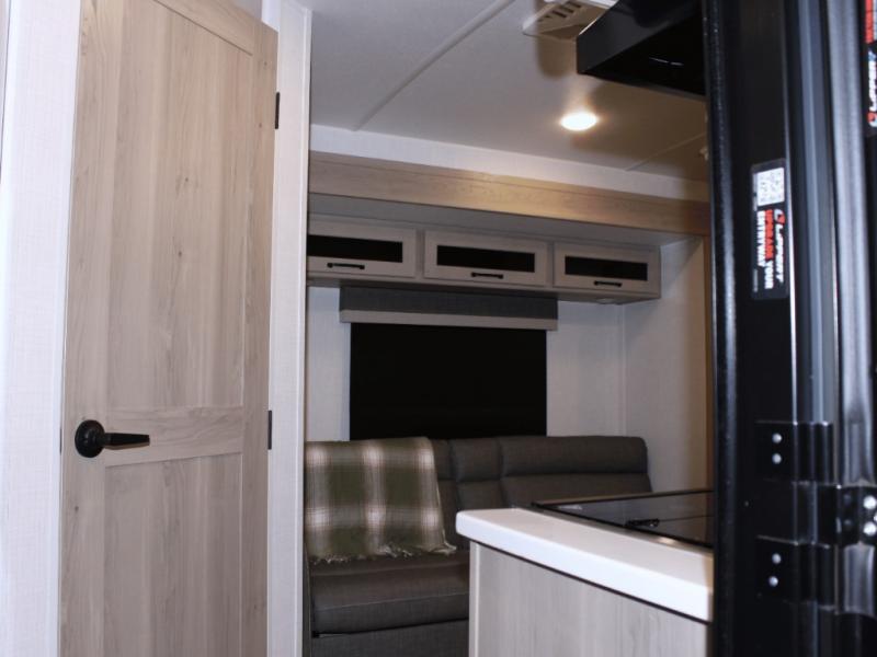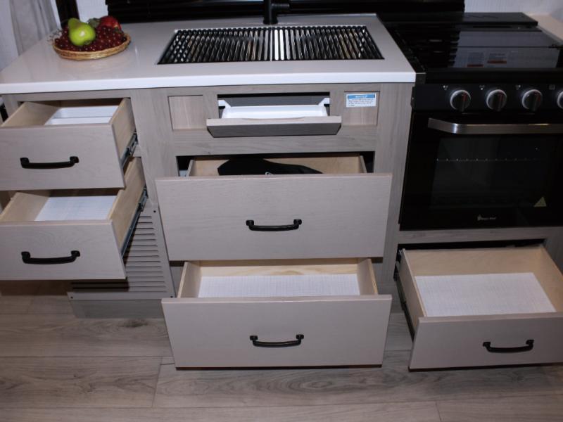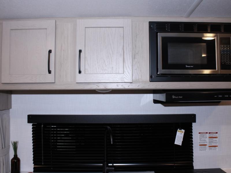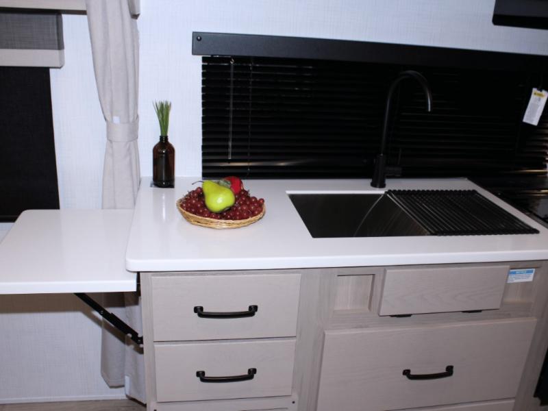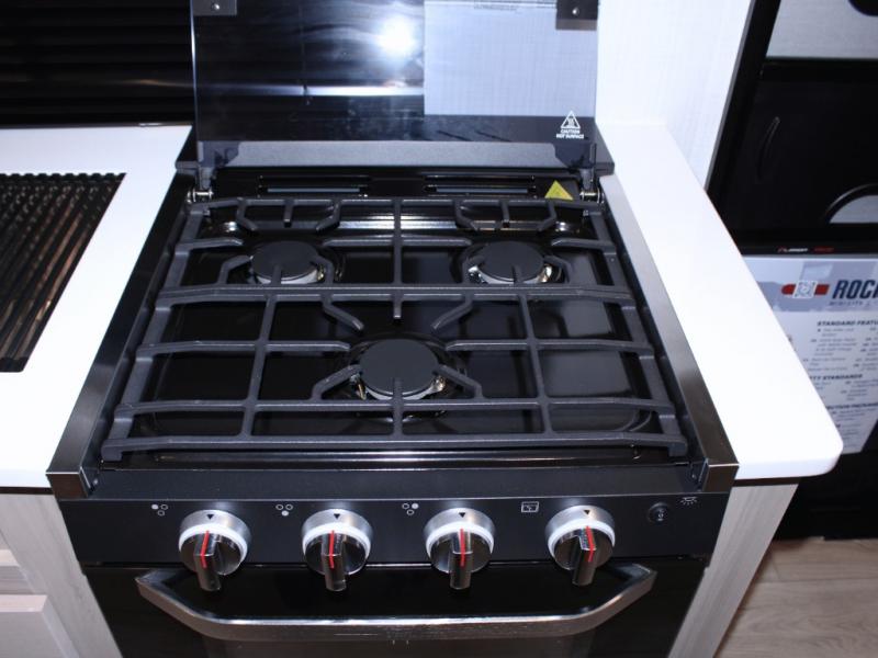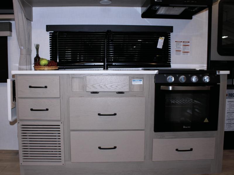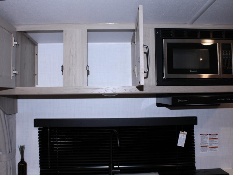 In the kitchen, you'll find a three-burner cooktop, microwave oven, and solid surface countertops that make meal prep easy and enjoyable. If the weather's nice, step outside and fire up the outdoor griddle with LP hookup for open-air cooking with a view.