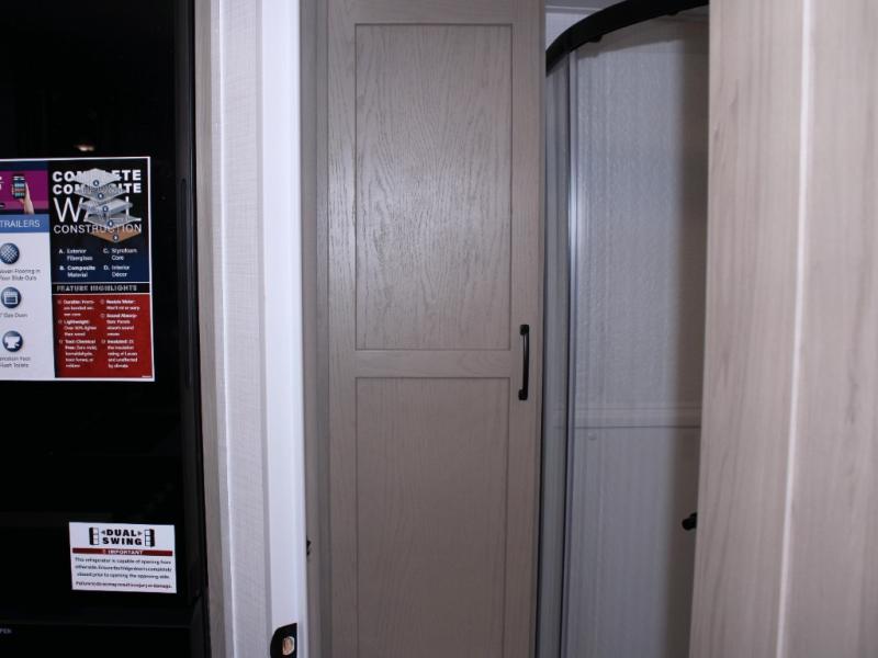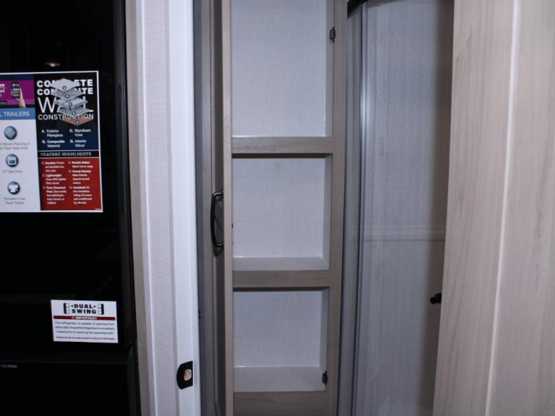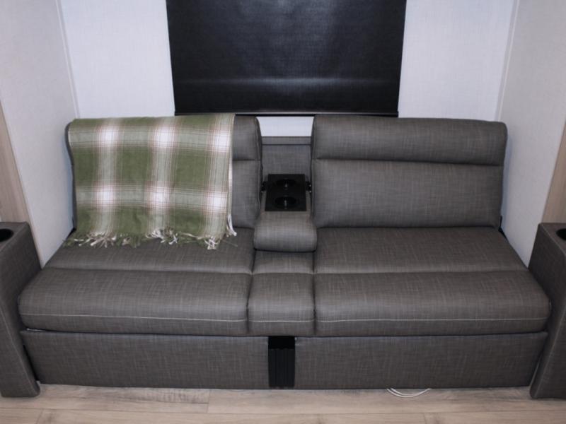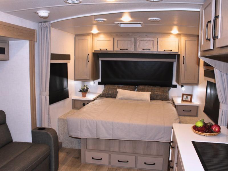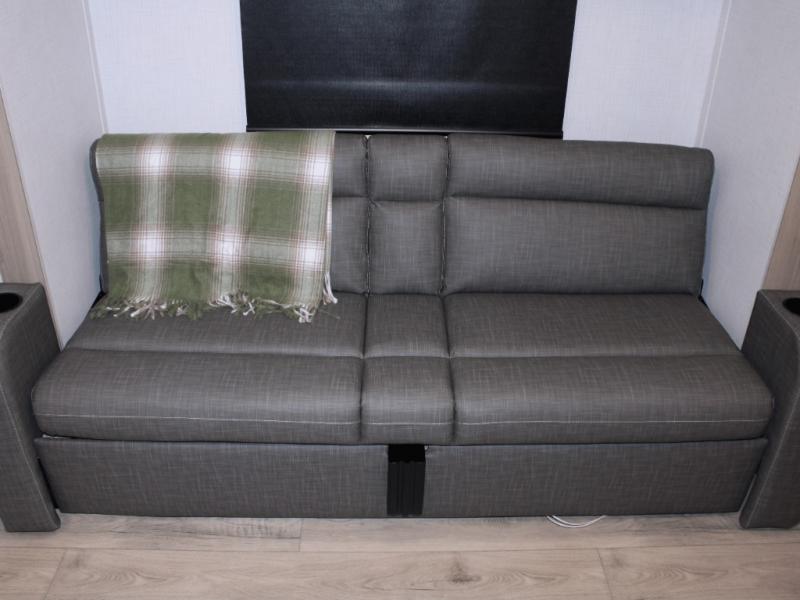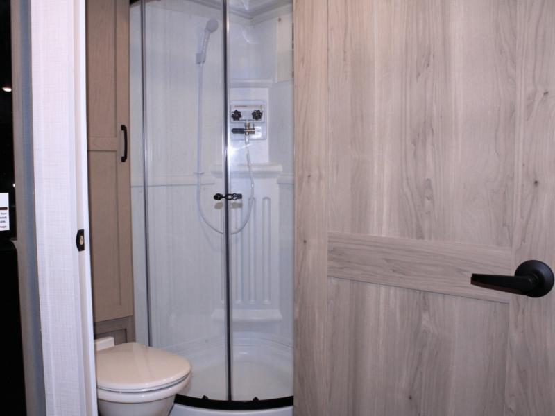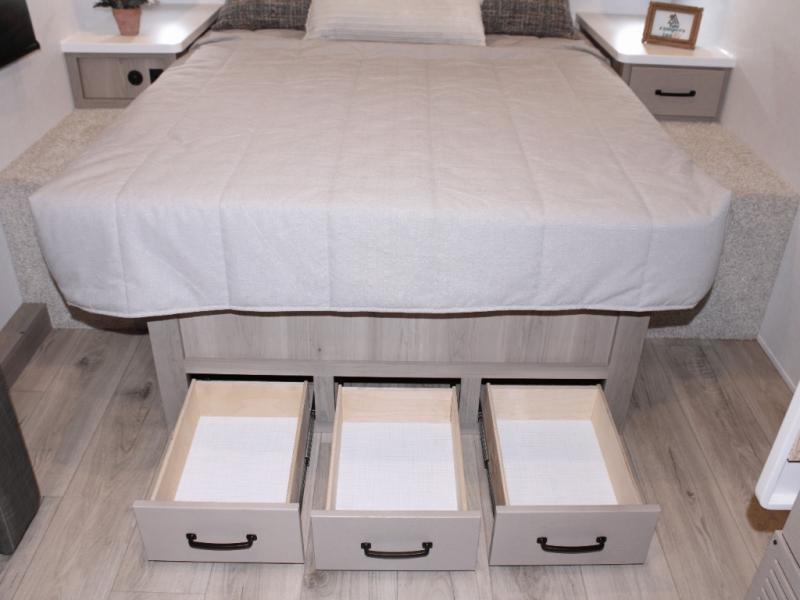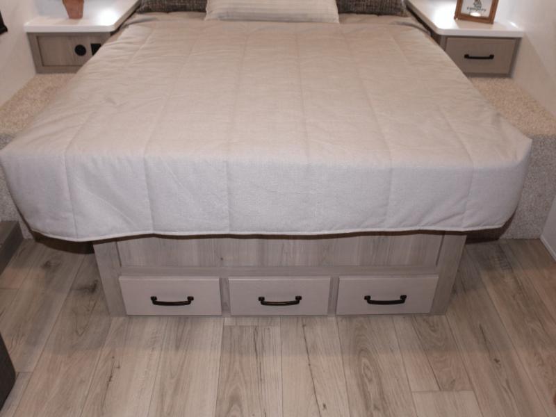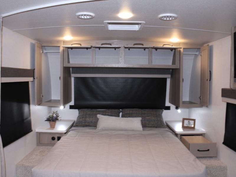 Storage is smart and plentiful, with dual wardrobes, flip-up storage, and two pass-through exterior compartments for larger gear. The power tongue jack makes setup effortless, so you can spend more time relaxing and exploring.