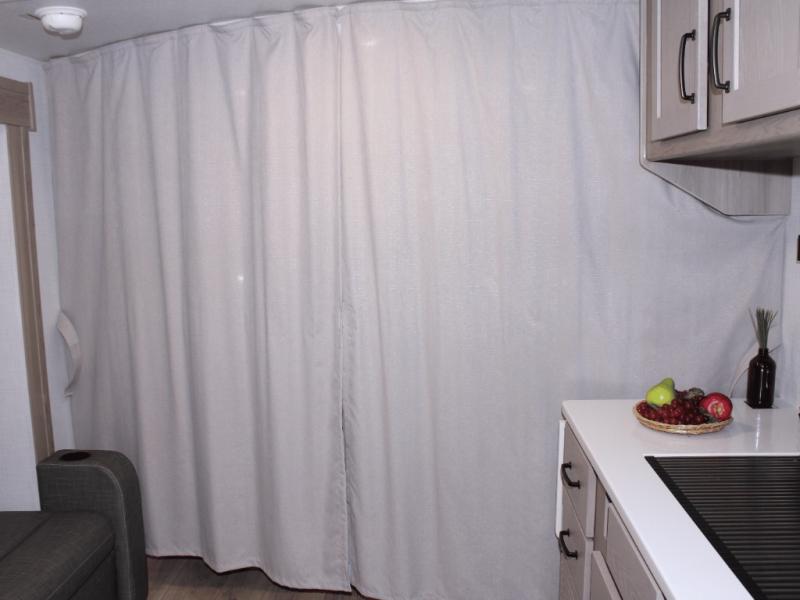 At the front of the trailer, you'll find a comfortable RV queen bed with a privacy curtain, perfect for unwinding after a day outdoors. The 72" sofa slide gives you space to relax, dine with the included table, or accommodate an extra guest for the night.
