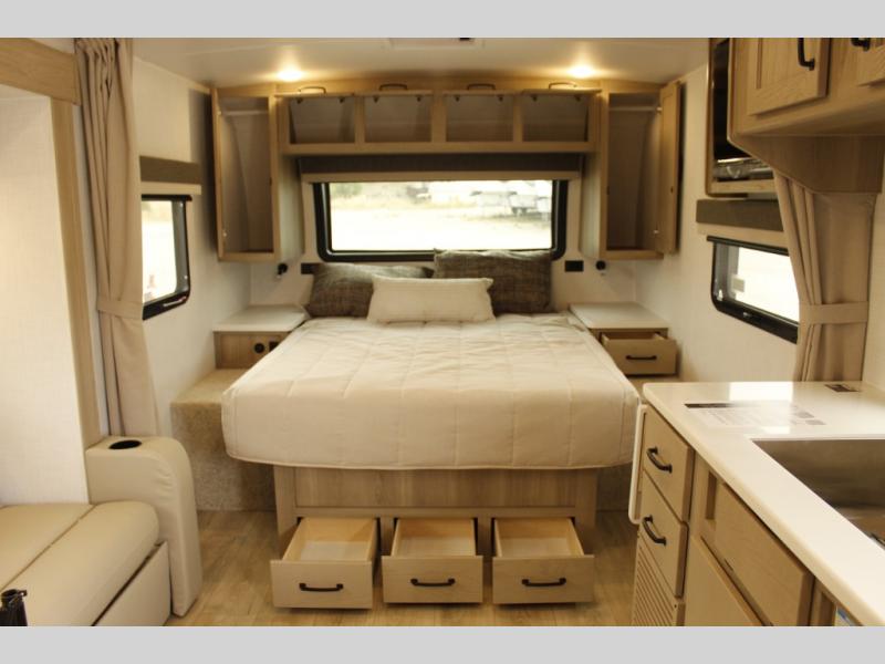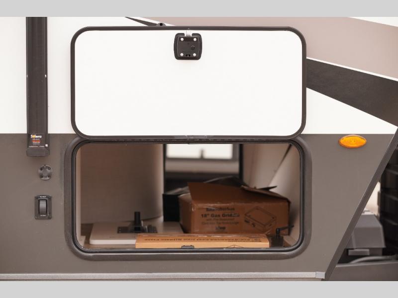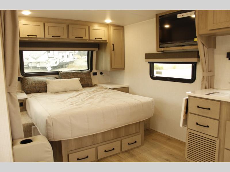 Wherever you decide to camp, you will love every minute in this cute couple's trailer. The sofa slide with a table will provide a place to relax, eat, and even sleep an extra guest if you have one, and the front RV queen bed includes a privacy curtain to enjoy your own space. There are dual bedroom wardrobes to keep your clothes tidy, and you'll find two pass-through storage compartments for your larger gear. An outside griddle with an LP hookup will allow you to make breakfast outdoors, and there is a three burner cooktop indoors if the weather isn't cooperating. Since there is a full bath on board you won't have to use the camp's facilities, and you can make it a movie night with the 32" TV in the main living area!