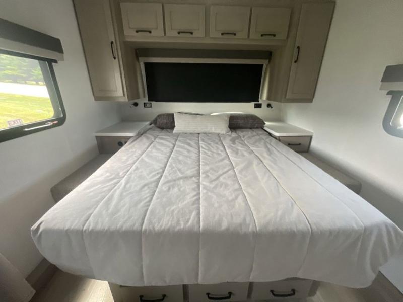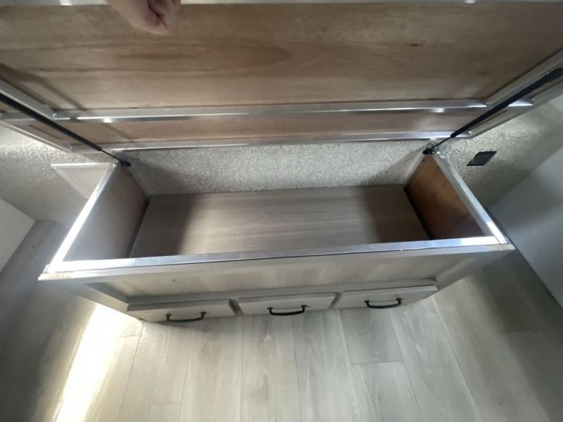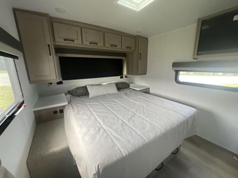 Wherever you decide to camp, you will love every minute in this cute couple's trailer. The sofa slide with a table will provide a place to relax, eat, and even sleep an extra guest if you have one, and the front RV queen bed includes a privacy curtain to enjoy your own space. There are dual bedroom wardrobes to keep your clothes tidy, and you'll find two pass-through storage compartments for your larger gear. An outside griddle with an LP hookup will allow you to make breakfast outdoors, and there is a three burner cooktop indoors if the weather isn't cooperating. Since there is a full bath on board you won't have to use the camp's facilities, and you can make it a movie night with the 32" TV in the main living area!