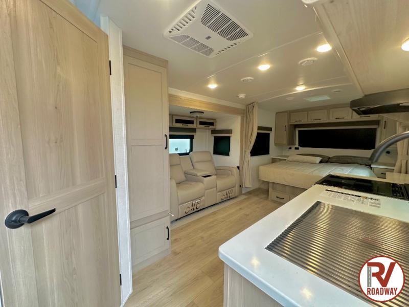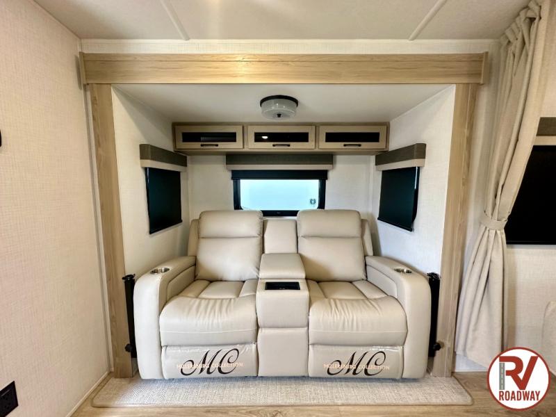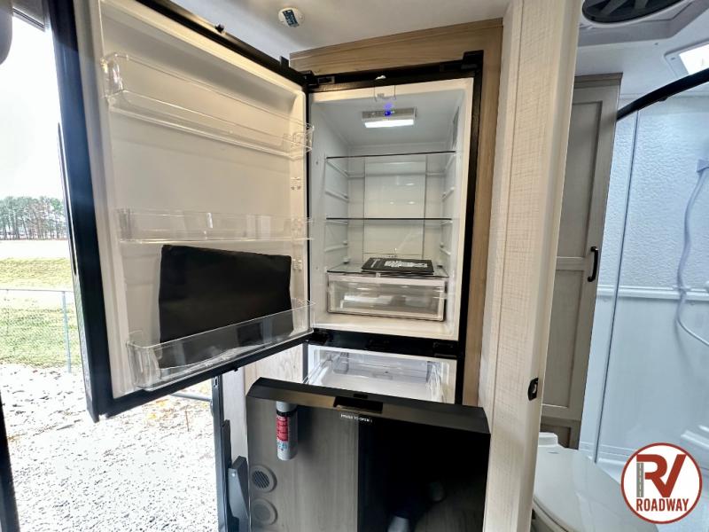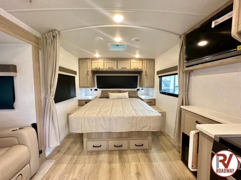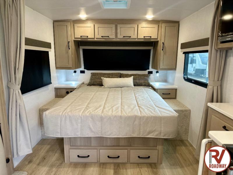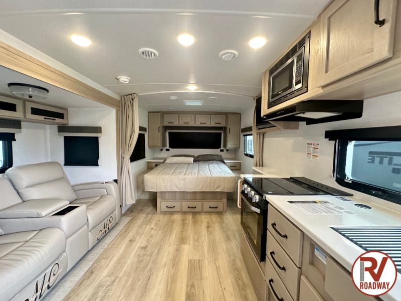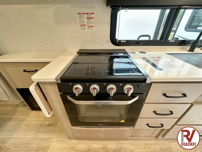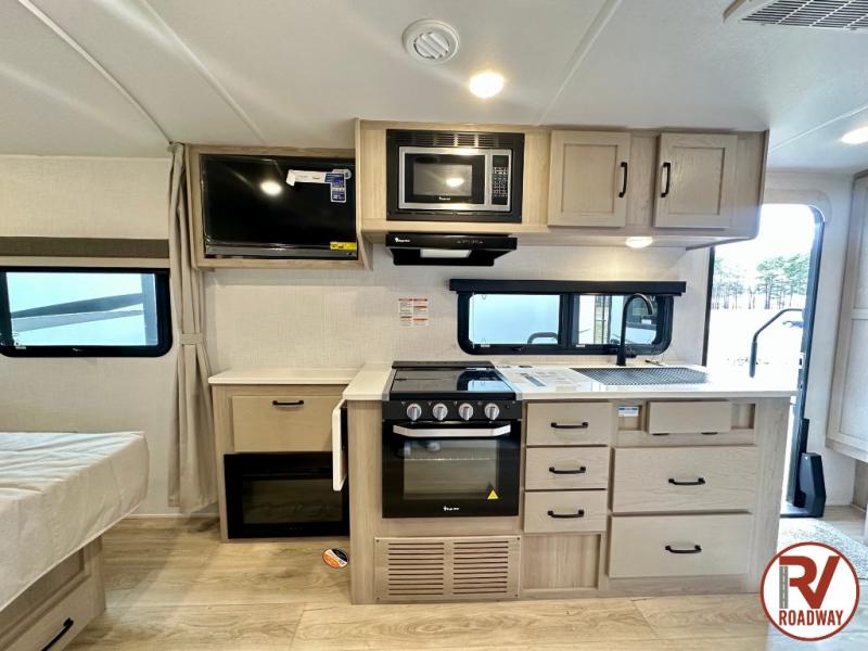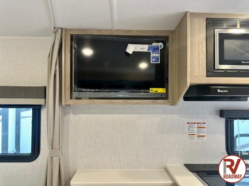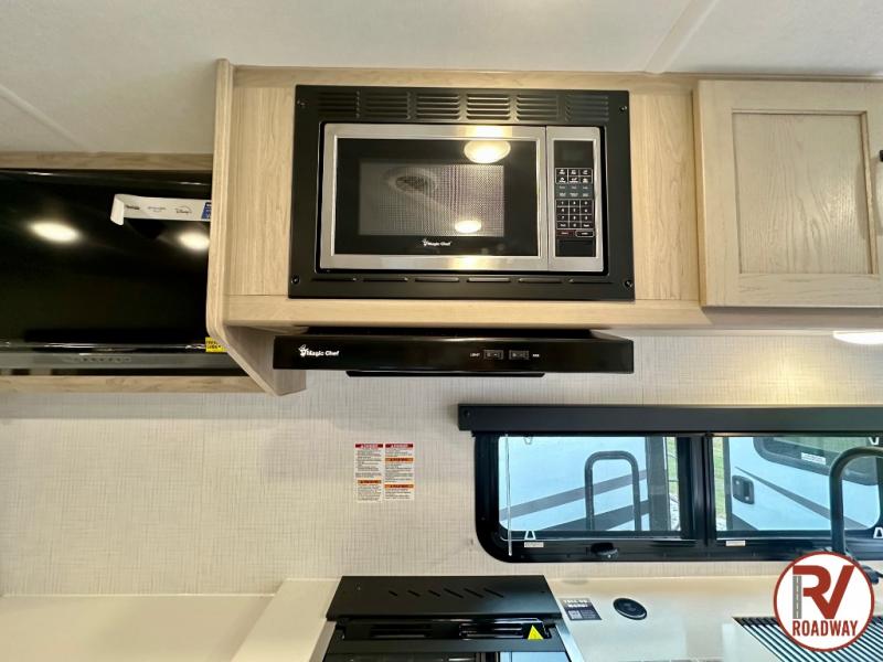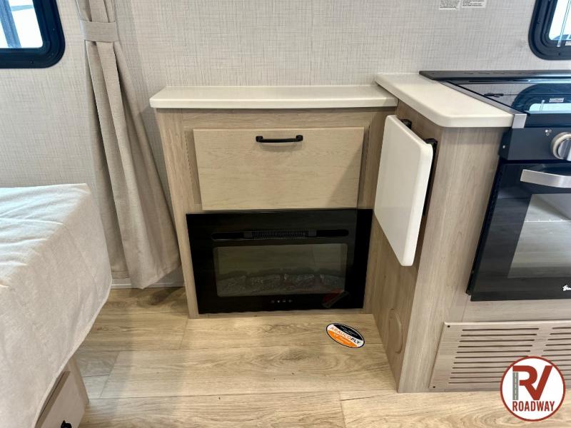 Enjoy the camping season with your spouse, friend, or significant other in this cozy travel trailer for two. Each morning, you can have your coffee on the 67" theater seats with a table within the slide out, then head outdoors to make pancakes on the outdoor griddle with an LP hookup. The interior kitchen includes a three burner cooktop, a microwave oven, plus a 12 volt refrigerator for perishables. An entertainment center with a fireplace will make your space feel more like home, and what's better than sleeping on your own queen bed with dual bedroom wardrobes for your clothes!?