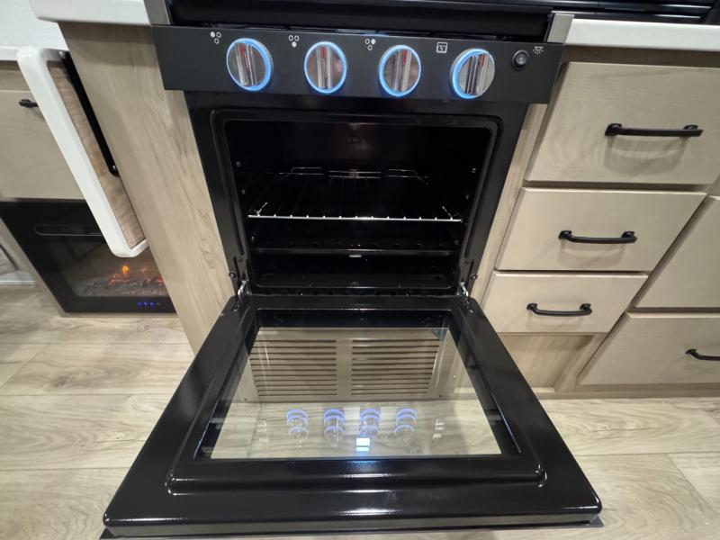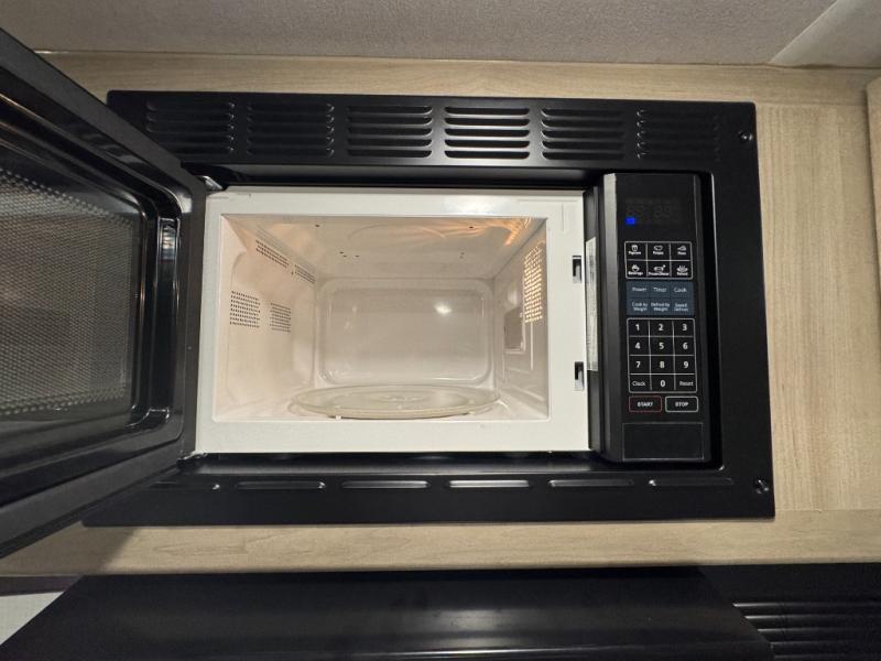 Inside, the kitchen is well equipped: three-burner cooktop to handle real meals, microwave for speed, 12V refrigerator to preserve perishables.