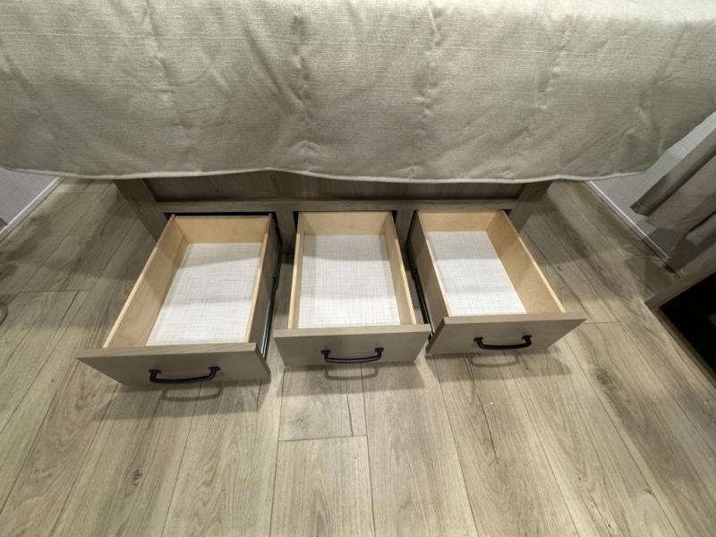 Cold weather features include 12V thermostatically controlled heated tanks, radiant foil insulation under underbelly and slide-out floors—ideal for extending your camping season.