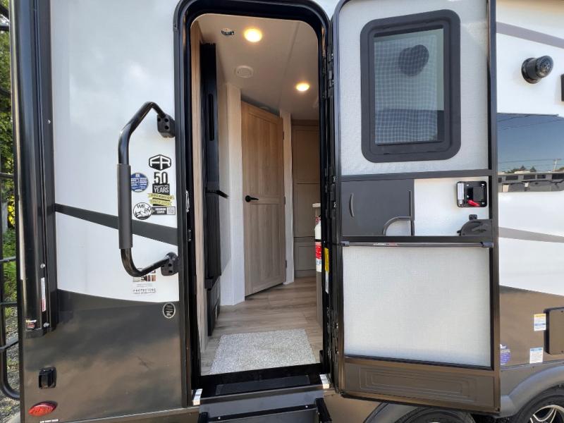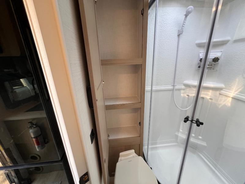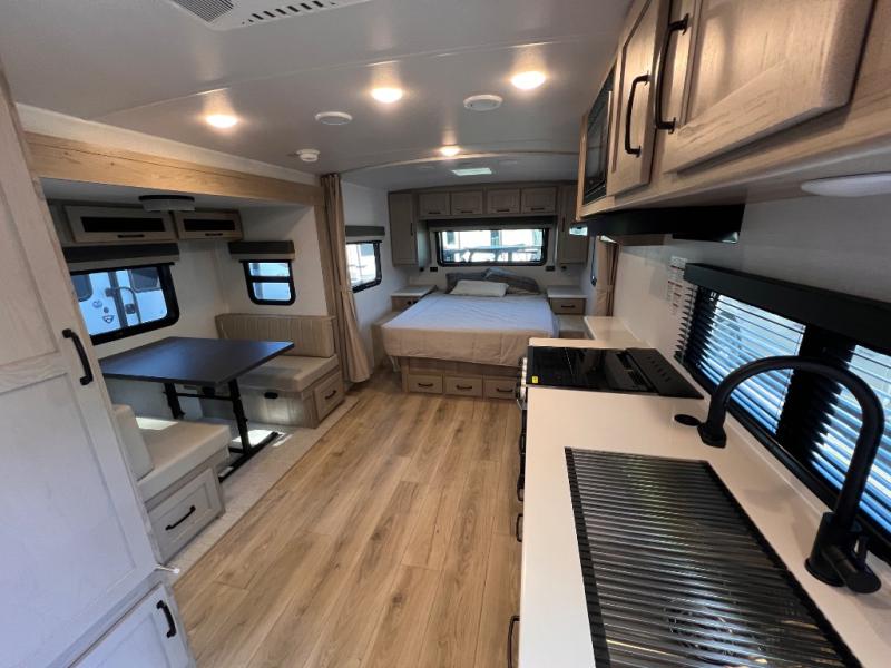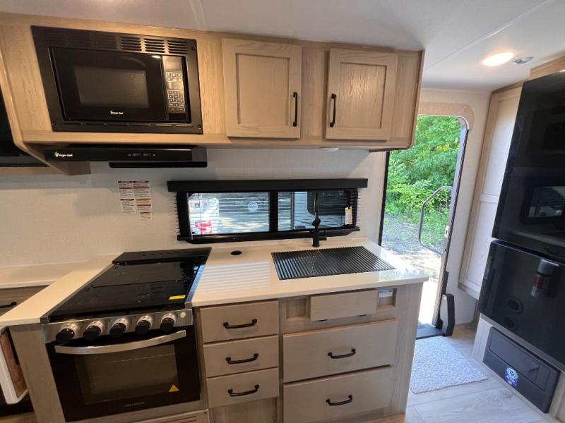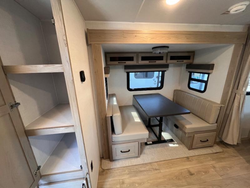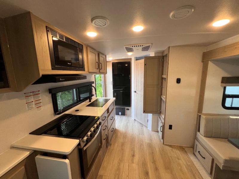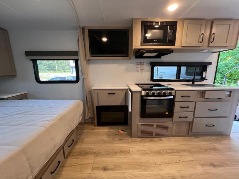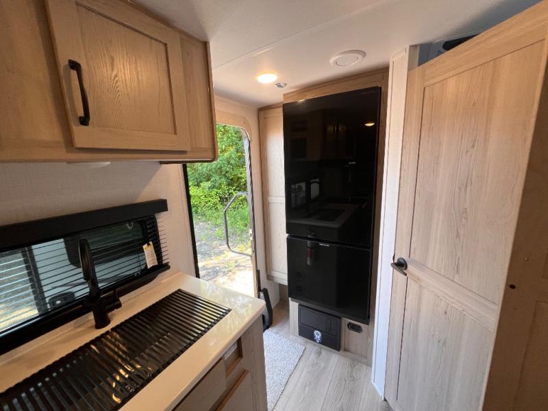 Enjoy the camping season with your spouse, friend, or significant other in this cozy travel trailer for two. Each morning, you can have your coffee on the 67" theater seats with a table within the slide out, then head outdoors to make pancakes on the outdoor griddle with an LP hookup. The interior kitchen includes a three burner cooktop, a microwave oven, plus a 12 volt refrigerator for perishables. An entertainment center with a fireplace will make your space feel more like home, and what's better than sleeping on your own queen bed with dual bedroom wardrobes for your clothes!?