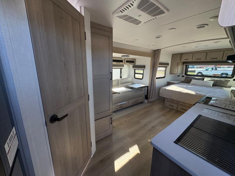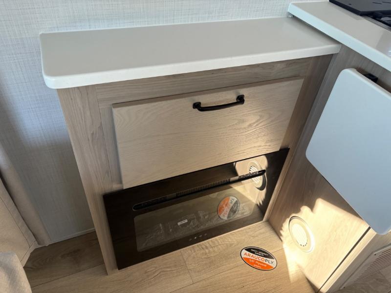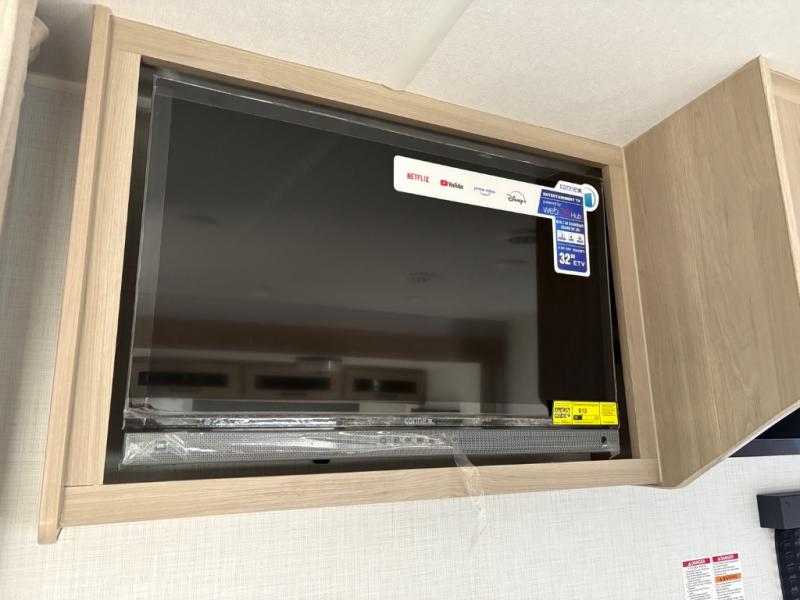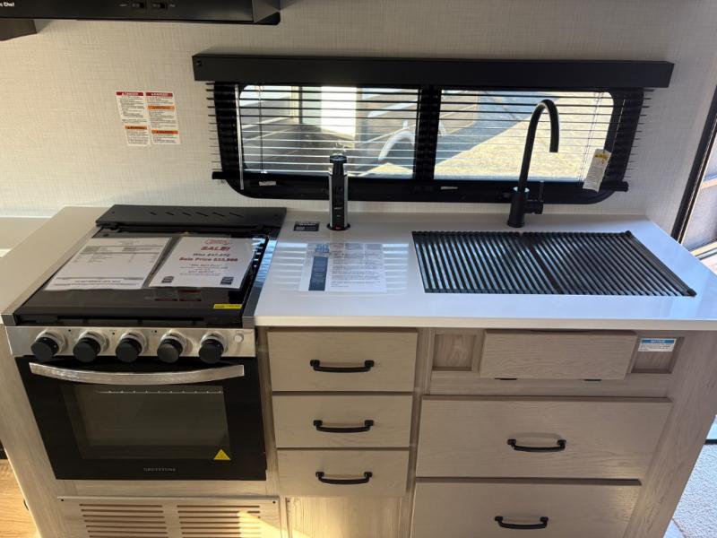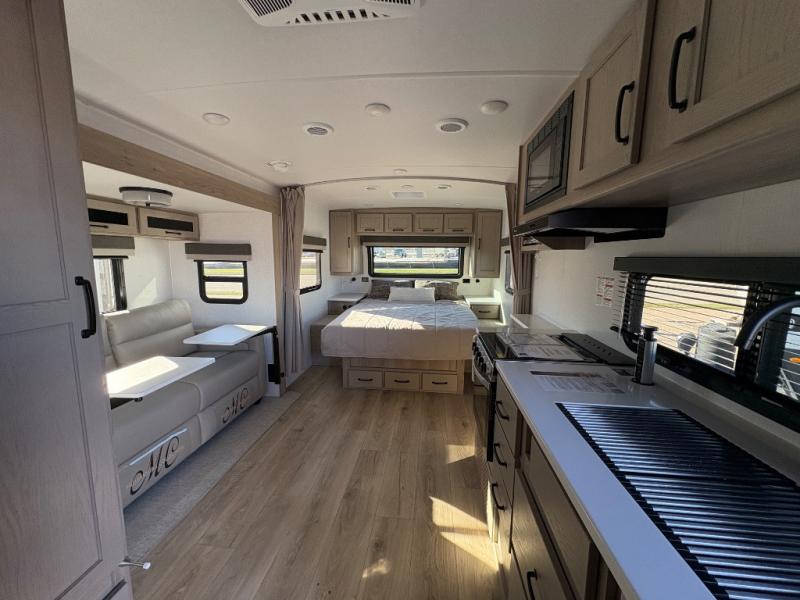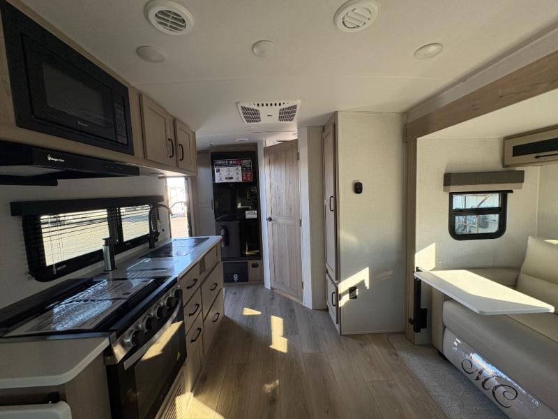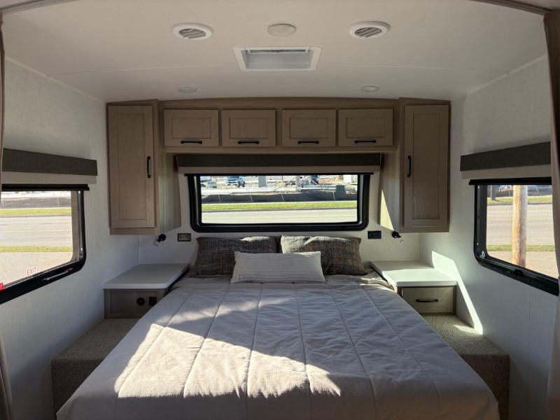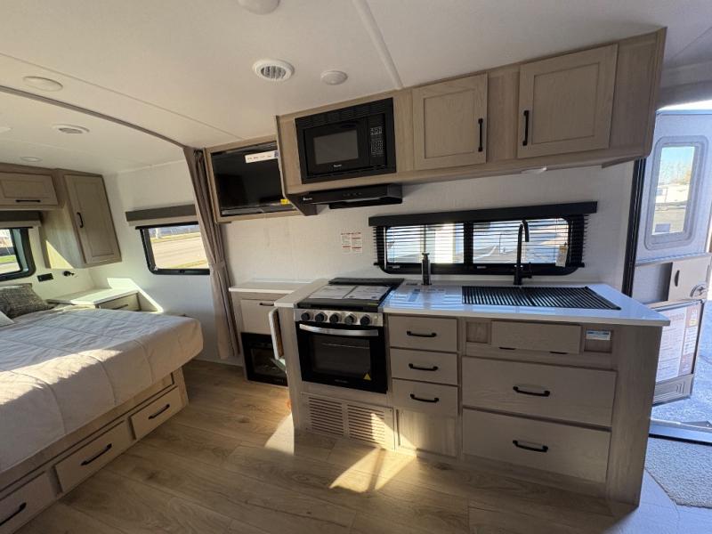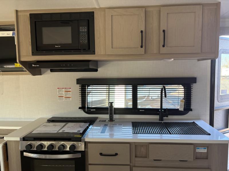 Enjoy the camping season with your spouse, friend, or significant other in this cozy travel trailer for two. Each morning, you can have your coffee on the 67" theater seats with a table within the slide out, then head outdoors to make pancakes on the outdoor griddle with an LP hookup. The interior kitchen includes a three burner cooktop, a microwave oven, plus a 12 volt refrigerator for perishables. An entertainment center with a fireplace will make your space feel more like home, and what's better than sleeping on your own queen bed with dual bedroom wardrobes for your clothes!?