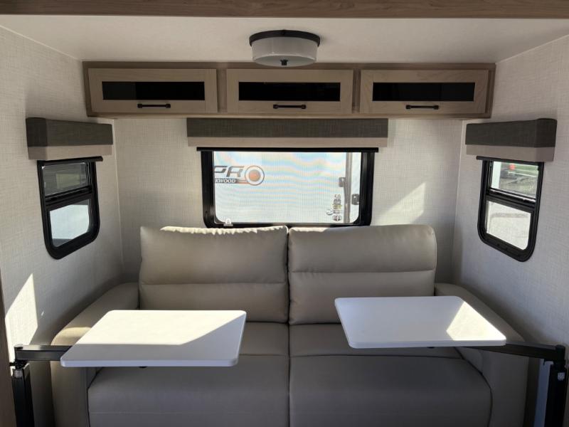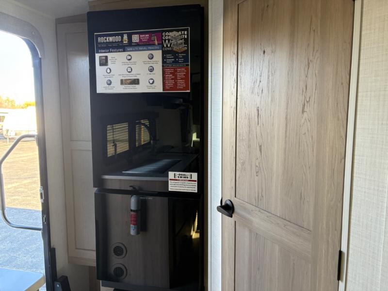 Each Rockwood Mini Lite travel trailer by Forest River is constructed with a fully laminated one-piece walkable roof, sleek frameless windows, and a six-sided full aluminum frame for strength and durability. The 12V thermostatically controlled heated tanks, plus radiant foil in the underbelly and slide out floors will allow you to camp well into the colder months, and the 200W roof solar panel will be perfect for a little off-gridding. Each model includes solid surface kitchen countertops, solid wood cabinet doors, night roller shades, plus many more interior features. Having an AIR 360+ omnidirectional antenna with WiFi prep on board gives you the option to get some work done if it's needed, and the power tongue jack provides hassle-free set up, so you can enjoy more time relaxing!